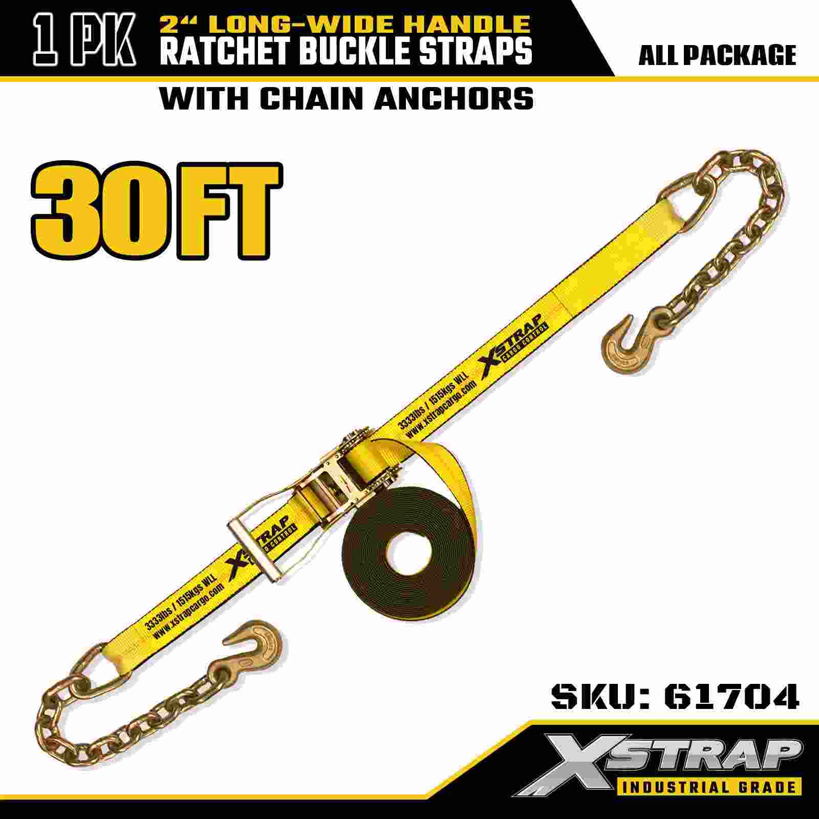 Xstrap 61704 Långt brett handtag spärrspänne 2" x 30ft (1-pack) – Kedjekrokar, 10 000 lbs brottstyrka, kraftigt bindningsband för last- och utrustningstransport