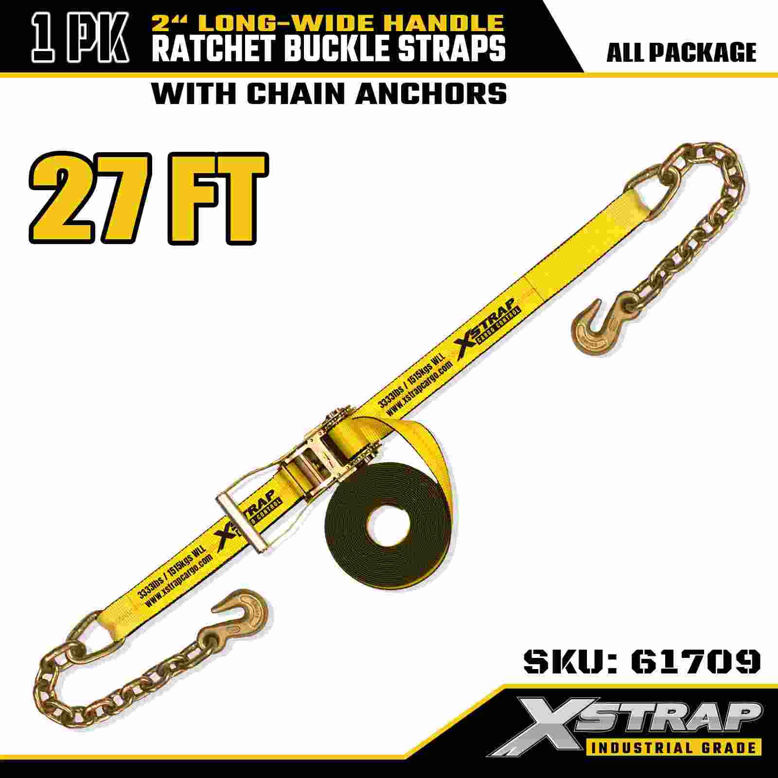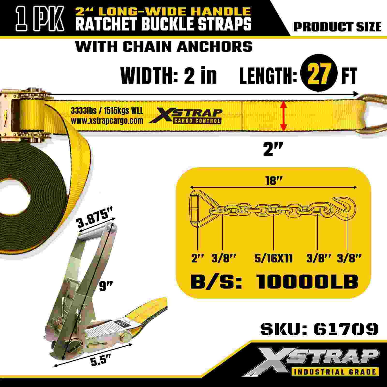 Xstrap 61709 Långt brett handtag spärrspänne 2" x 27ft (1-pack) med Kedjekrokar, 10 000 lbs brotthållfasthet, kraftigt fästband för säker transport