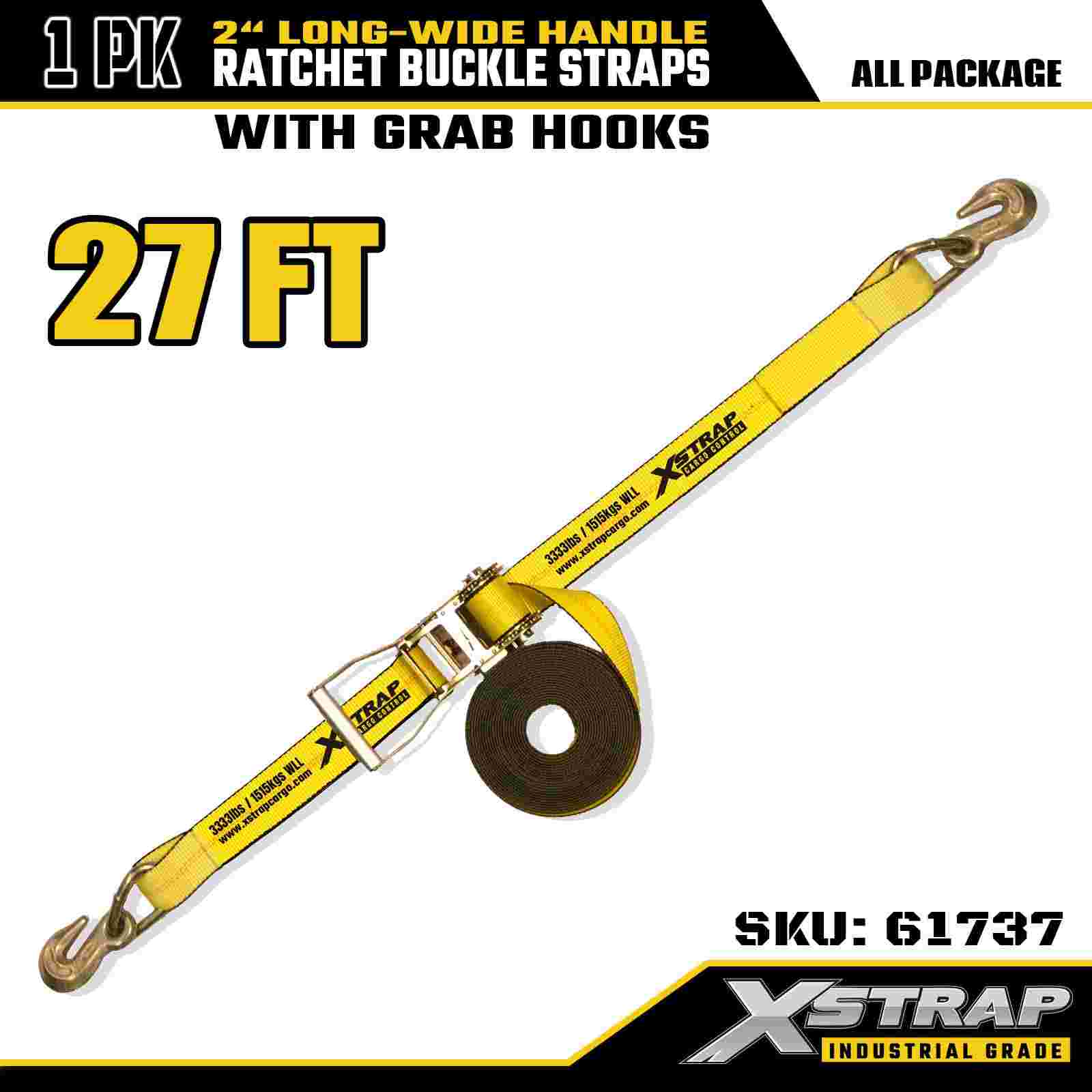 Xstrap 61737 Heavy Duty 2" x 27' 1PK spärrrem med gripkrokar gul, WLL 3 333 lbs, lång spärrrem med brett handtag för maskiner och utrustning