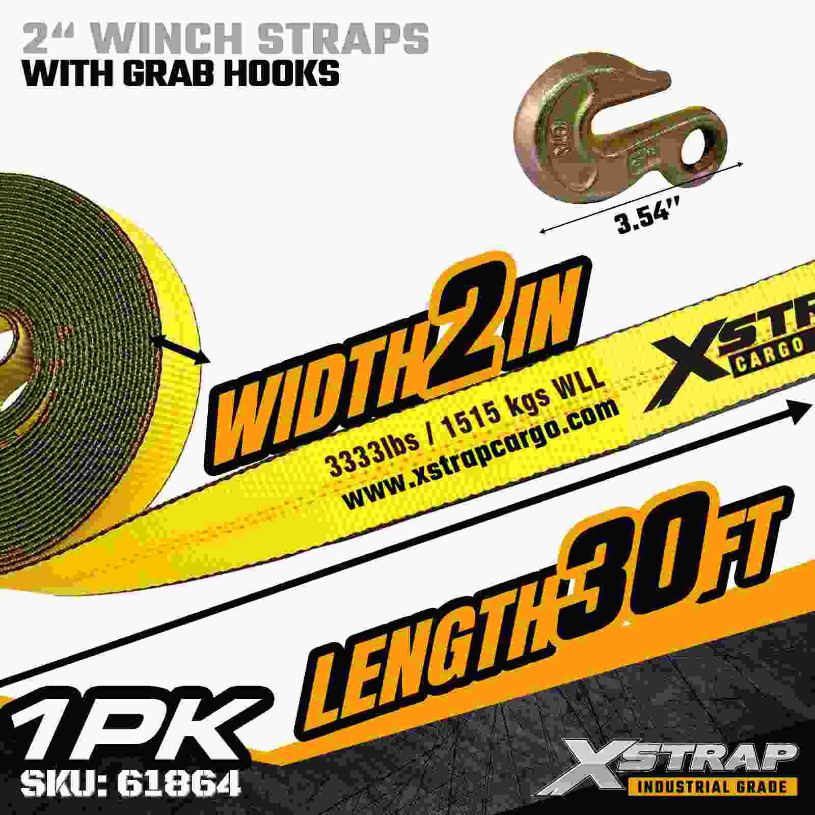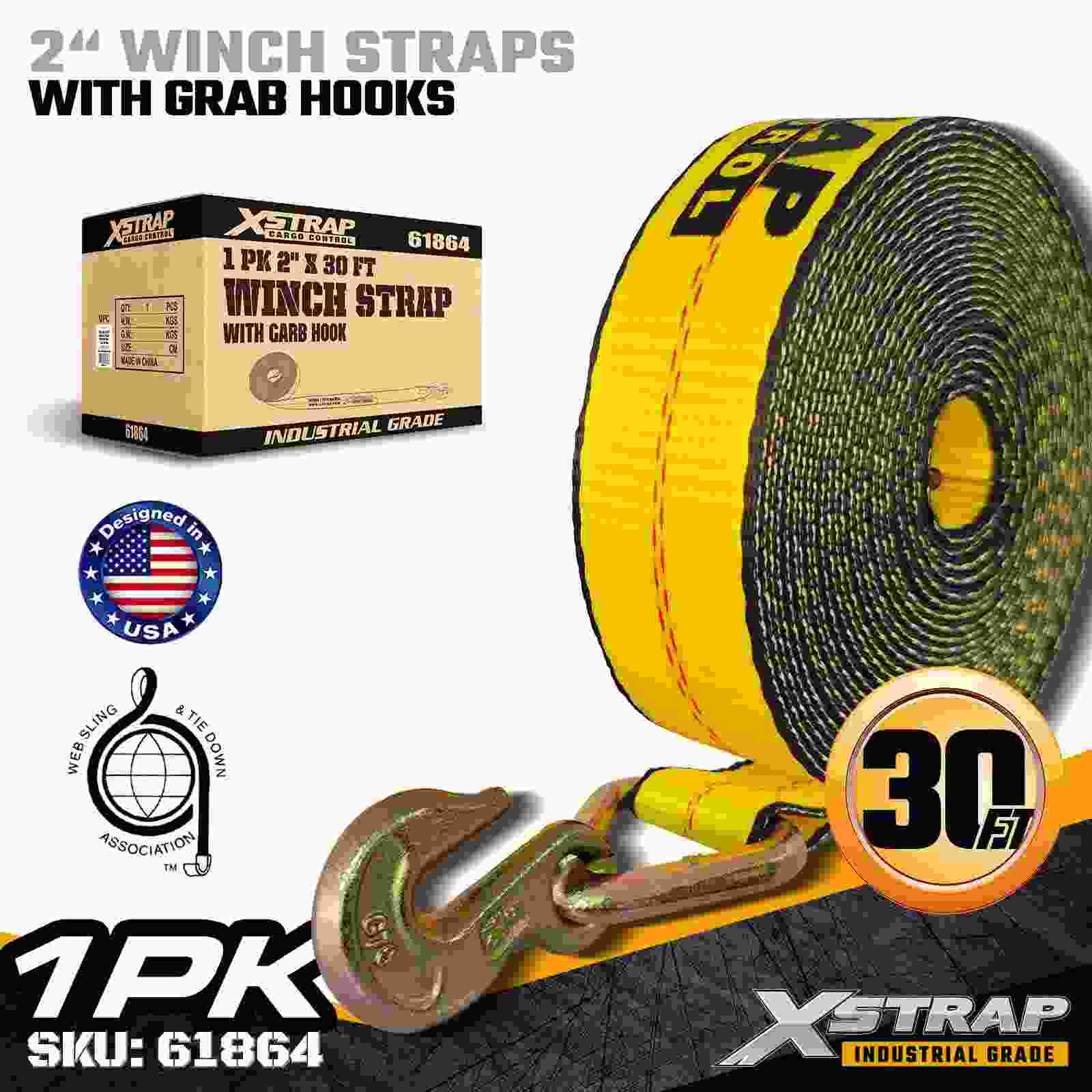 Xstrap 61864 2" × 30 fot Standard Winch Strap är en kraftfull lastsäkringslösning designad för flakvagnar och professionella transporter. Byggd med en robust gripkrok och höghållfast polyesterväv, ger detta 2-tums vinschband en 3 333 lbs arbetsbelastningsgräns och 10,00 lbs prestanda. timmer, pallar, rör, maskiner och allmän frakt under dagliga transporter.