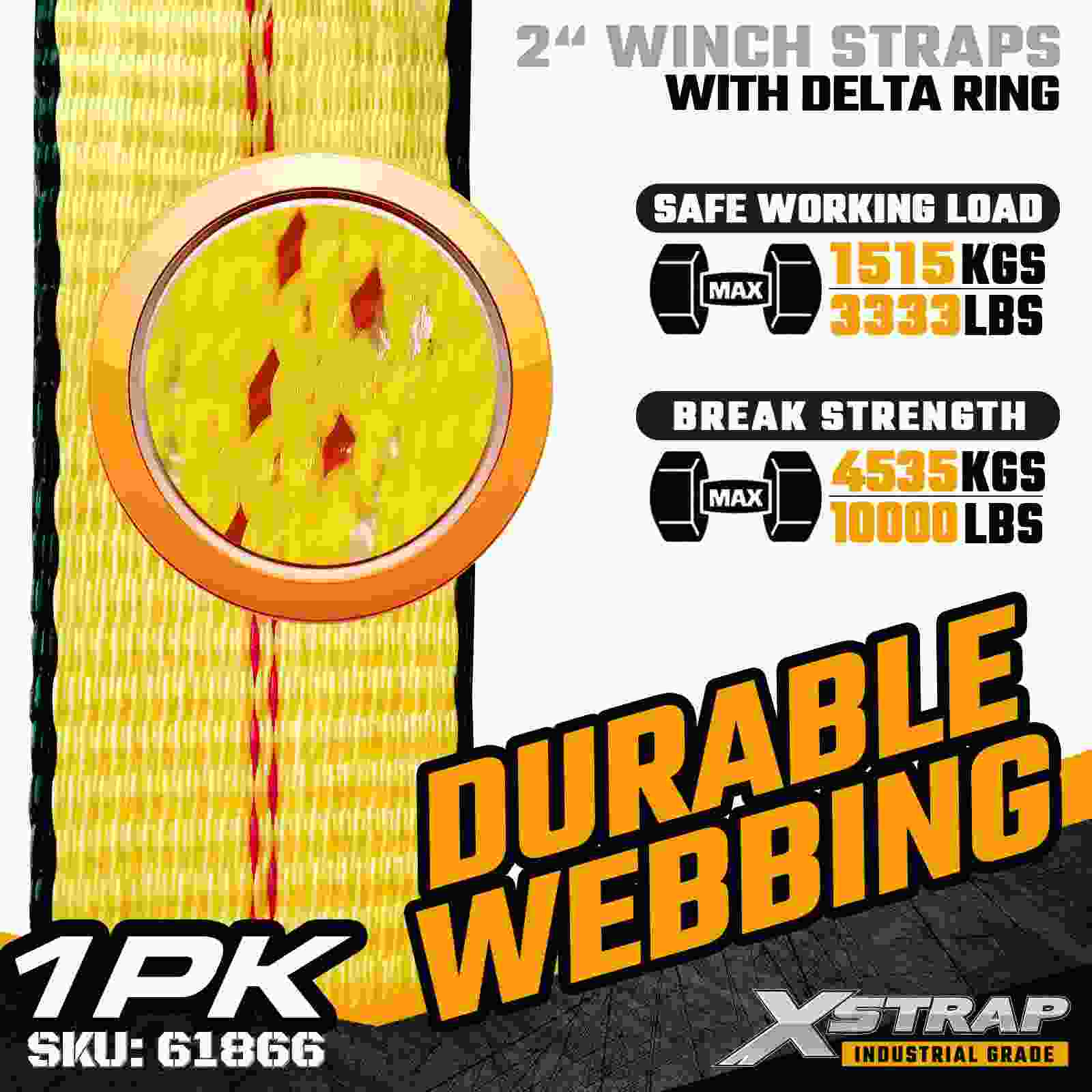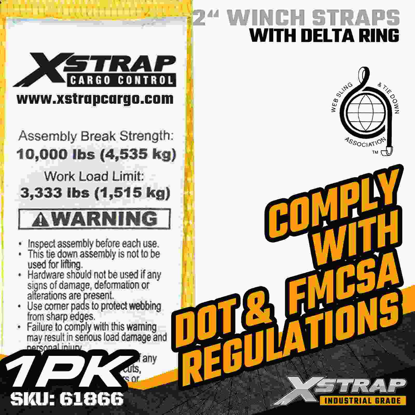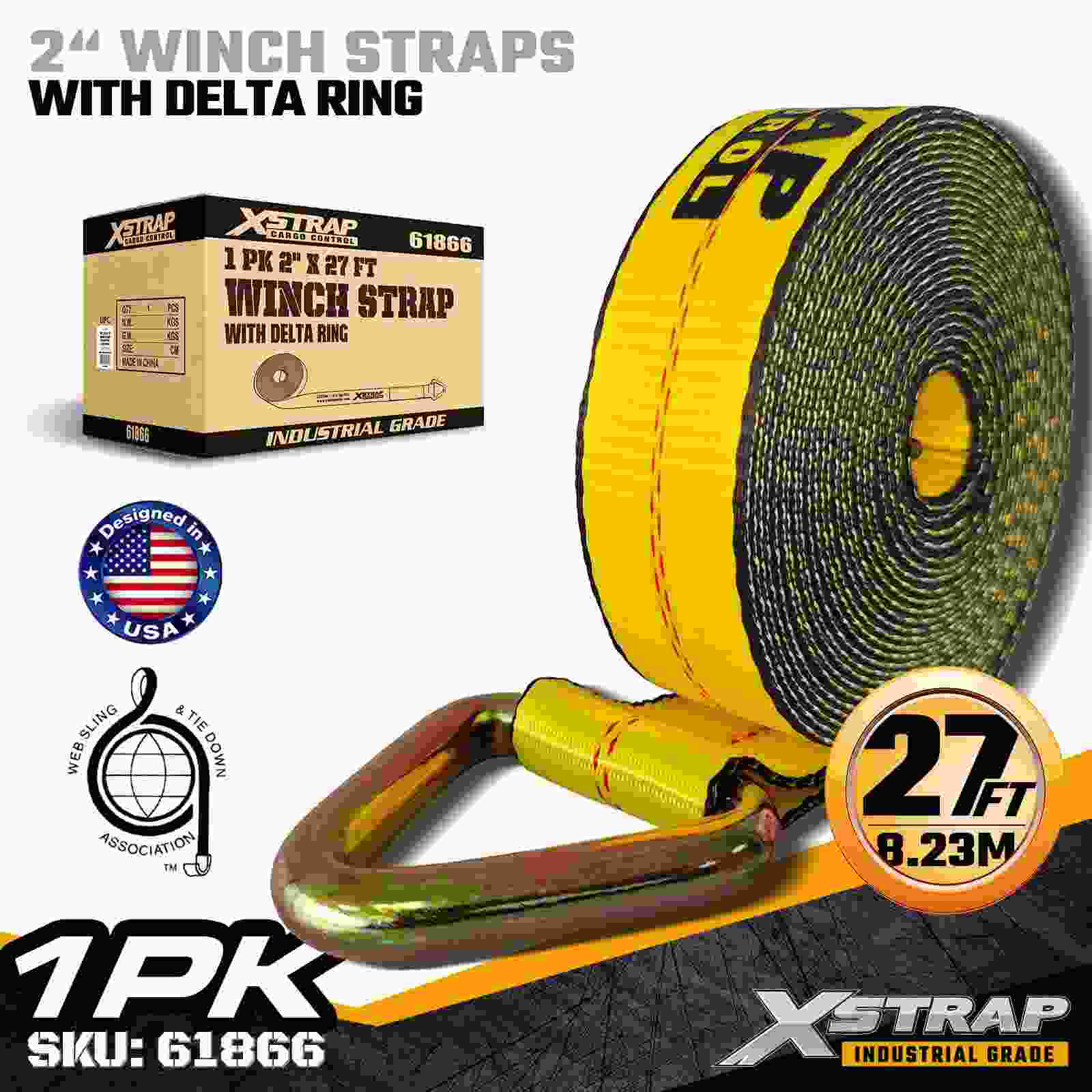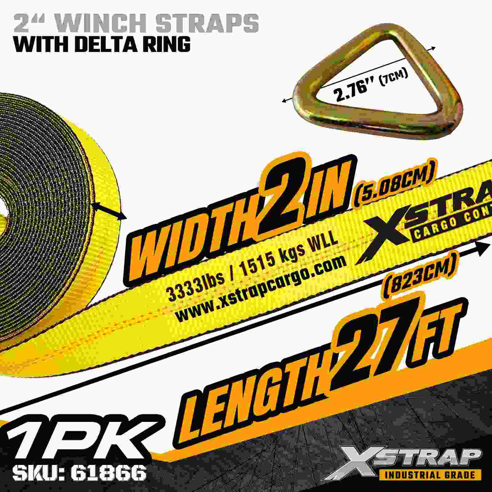 Xstrap 61866 2" × 27 fot Standard Winch Strap är en hållbar och pålitlig lastsäkringsrem designad för flakvagnar och professionella transporter. Med en stark Delta-ring och höghållfast polyesterväv ger denna 2-tums vinschrem en 3 333 lbs arbetsbelastningsgräns och 10,00 pallar är idealisk för bredd, 000 pallar. timmer, rör, maskiner och allmän frakt under dagliga transporter.