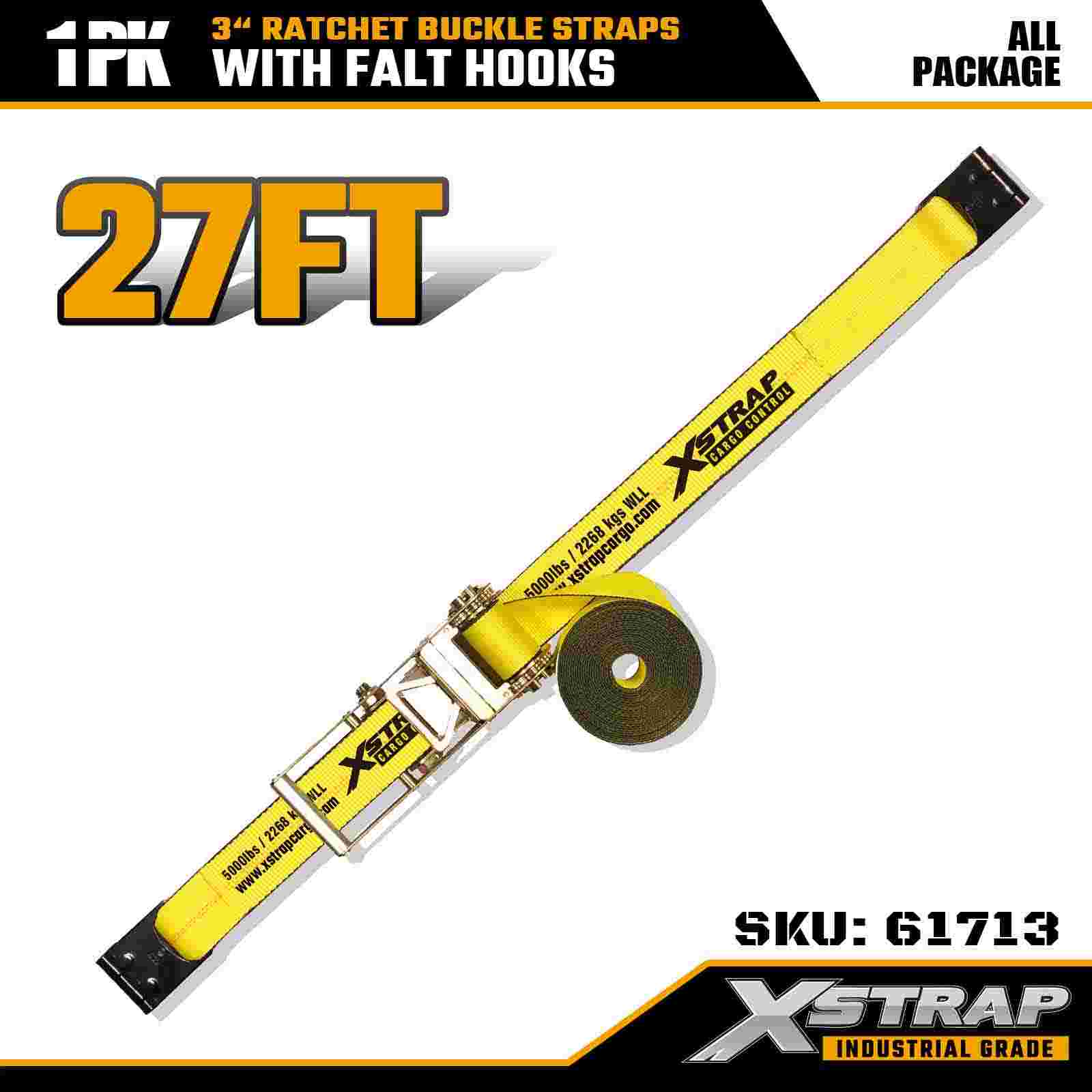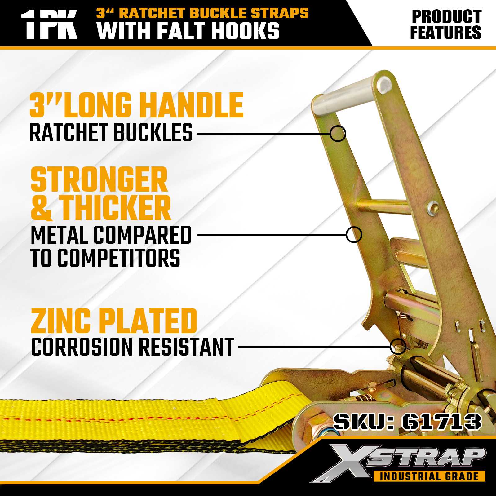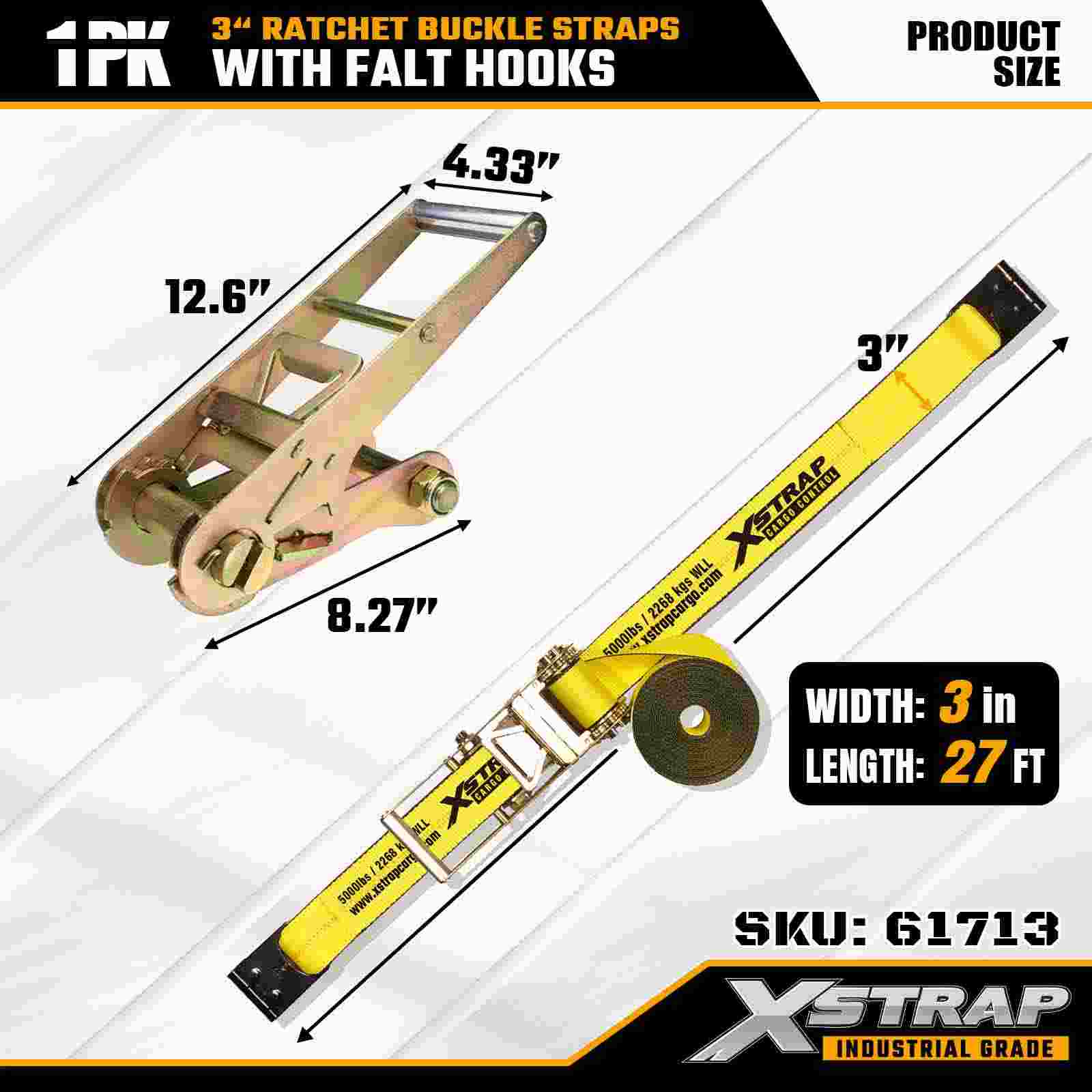 Xstrap 61713 3" x 27ft spärrspänne (1-pack) platta krokar, 5 000 lbs lastkapacitet 15 000 lbs Brotthållfasthet, tunga fäste för lastbilar, släpvagnar och industriell lasttransport.