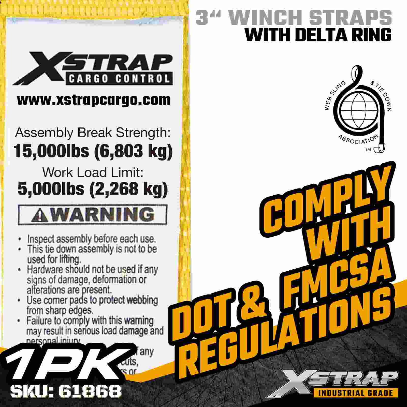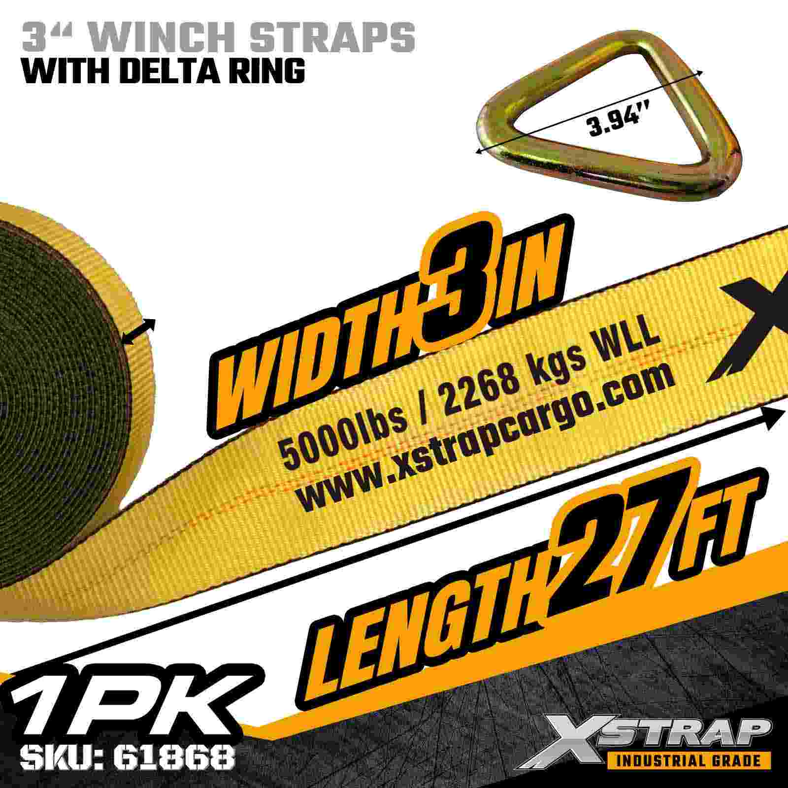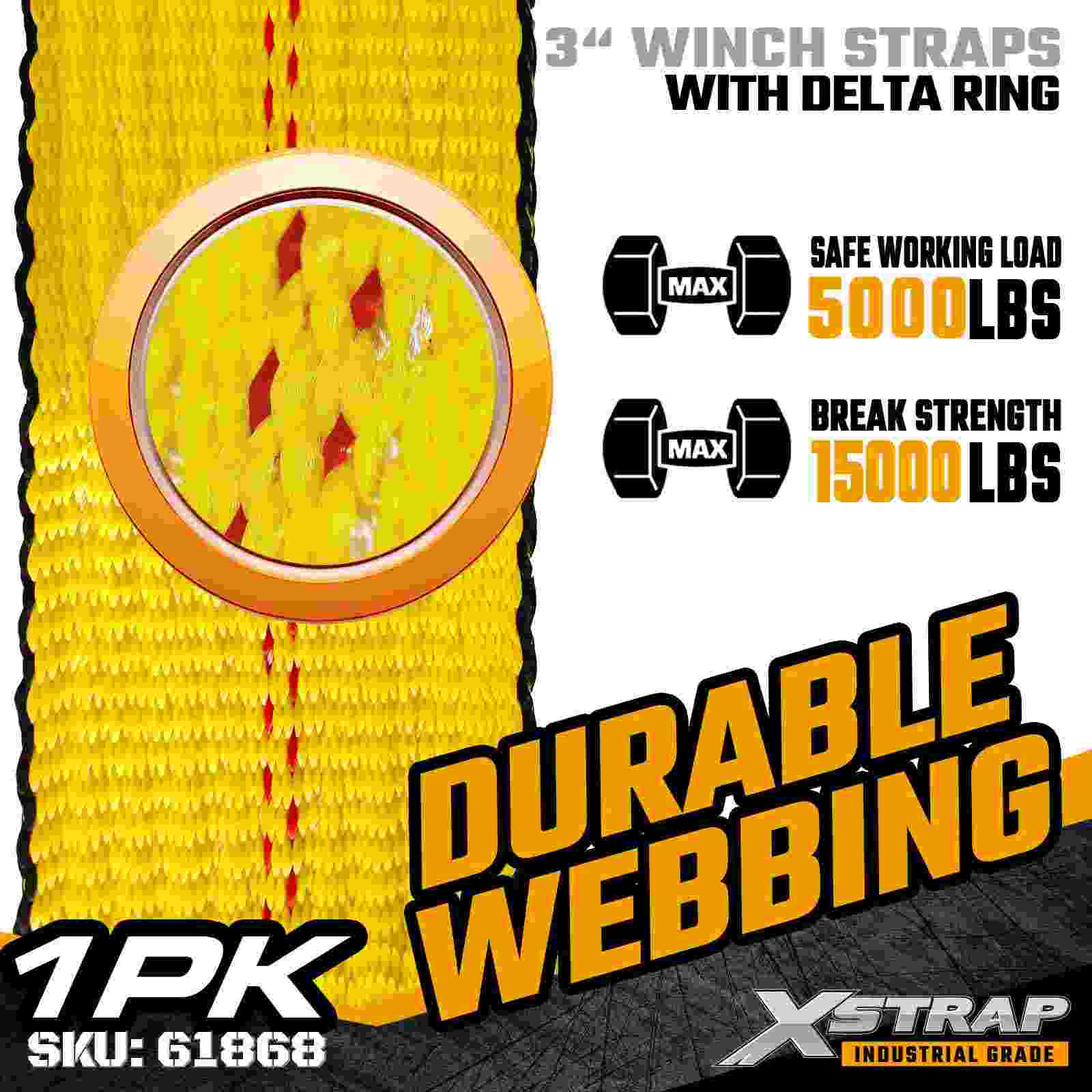 Xstrap 61868 3" × 27 fot Standard Winch Strap är en kraftfull lastsäkringslösning utformad för flakvagnar och högkapacitetstransporter. Med en förstärkt Delta-ring och extra bred 3-tums polyesterväv, ger denna 3-tums vinschrem en 5 000 lbs och 0 lbs Streng 150 bredd. är idealisk för att säkra överdimensionerade laster som timmer, stål, maskiner och industrifrakt under krävande transporter.