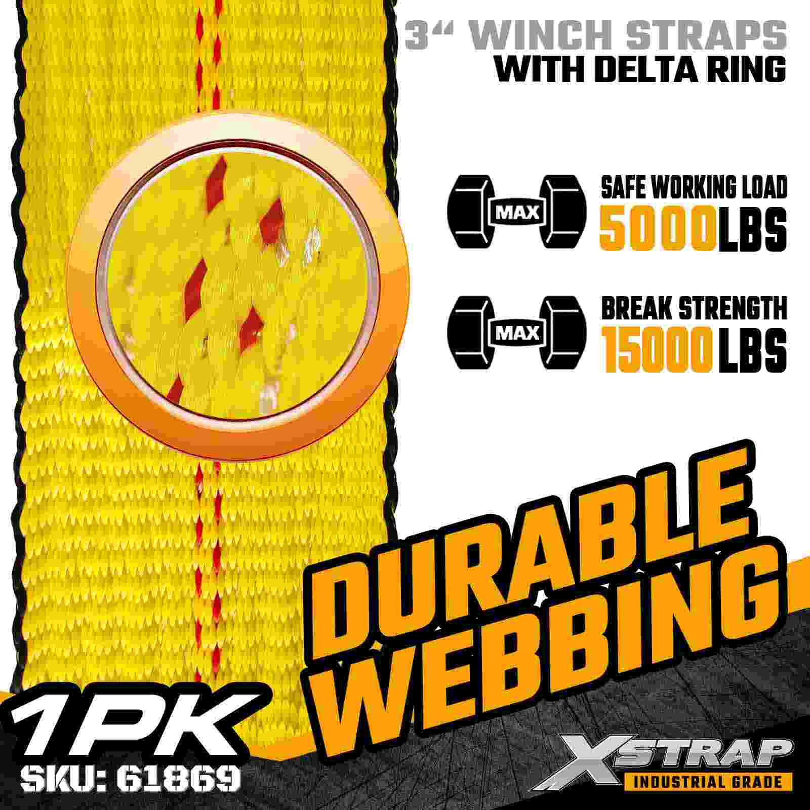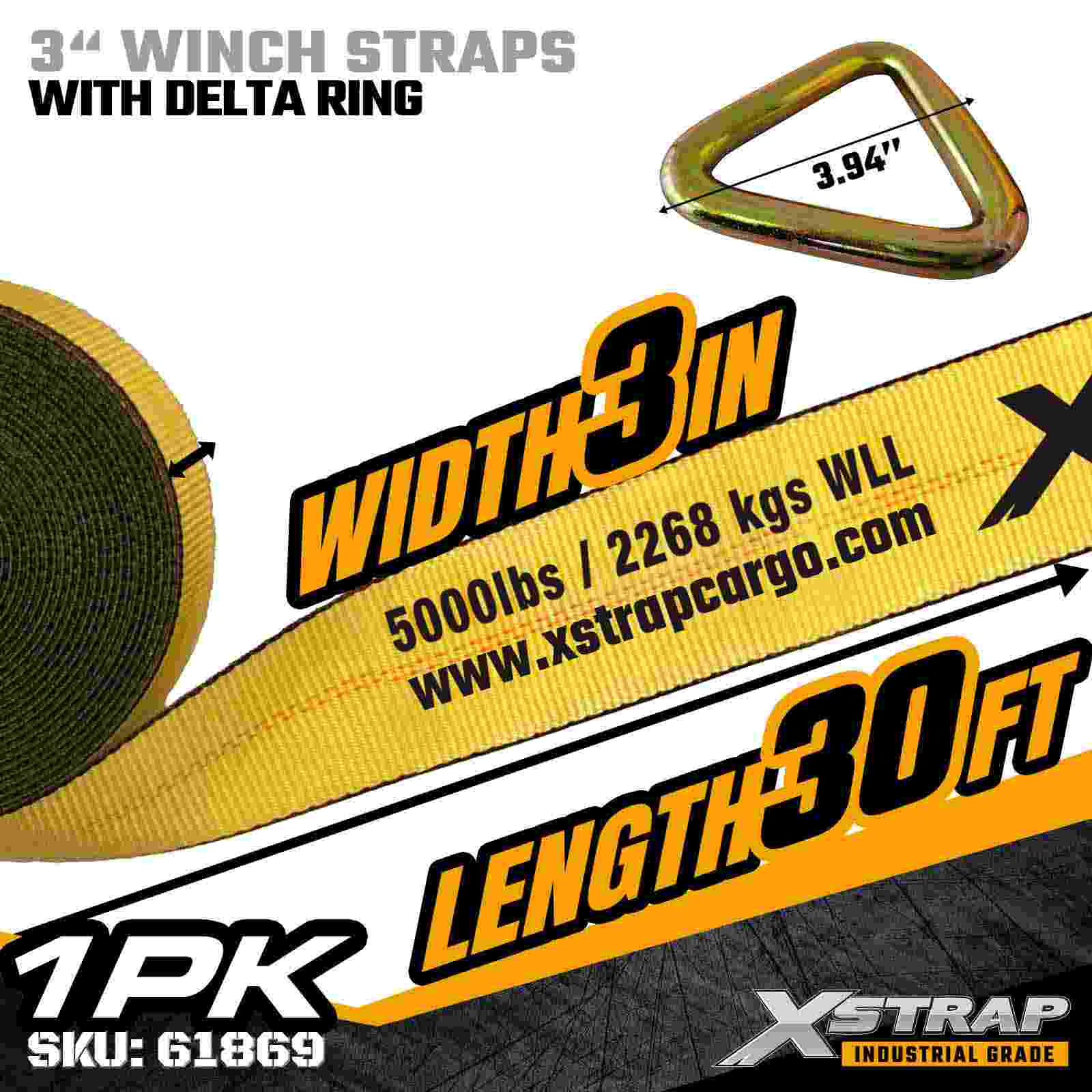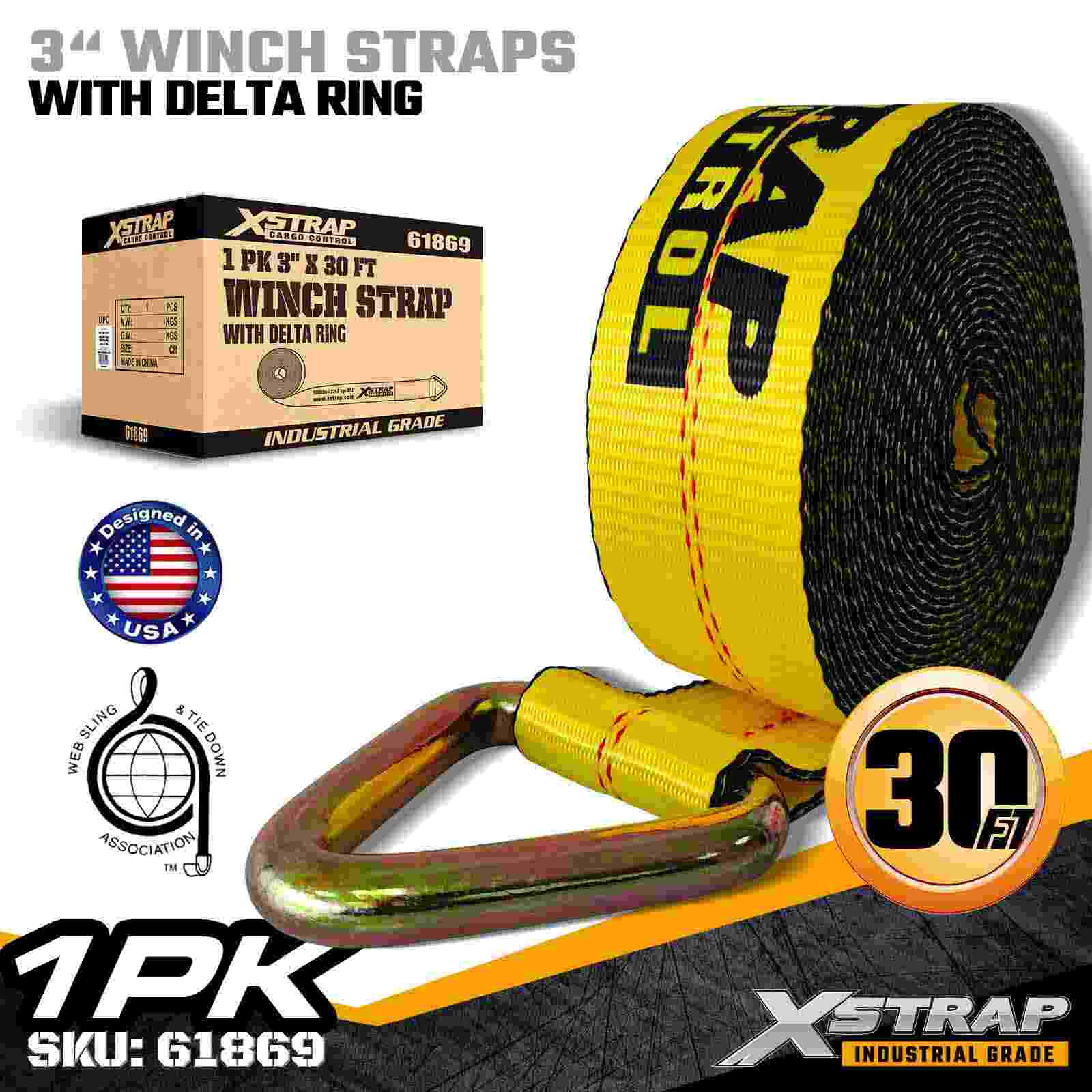Xstrap 61869 3" × 30 ft Standard Winch Strap är en kraftig lastsäkringsrem konstruerad för flakvagnar och högkapacitetstransporter. Med en förstärkt Delta-ring och extra bred 3-tums polyesterväv, ger denna 3-tums vinschrem 5 000 lbs, 00 lbs och Bred 1 lbs. Styrka Den är idealisk för att säkra överdimensionerade laster som timmer, stål, maskiner och industrifrakt under krävande transporter.
