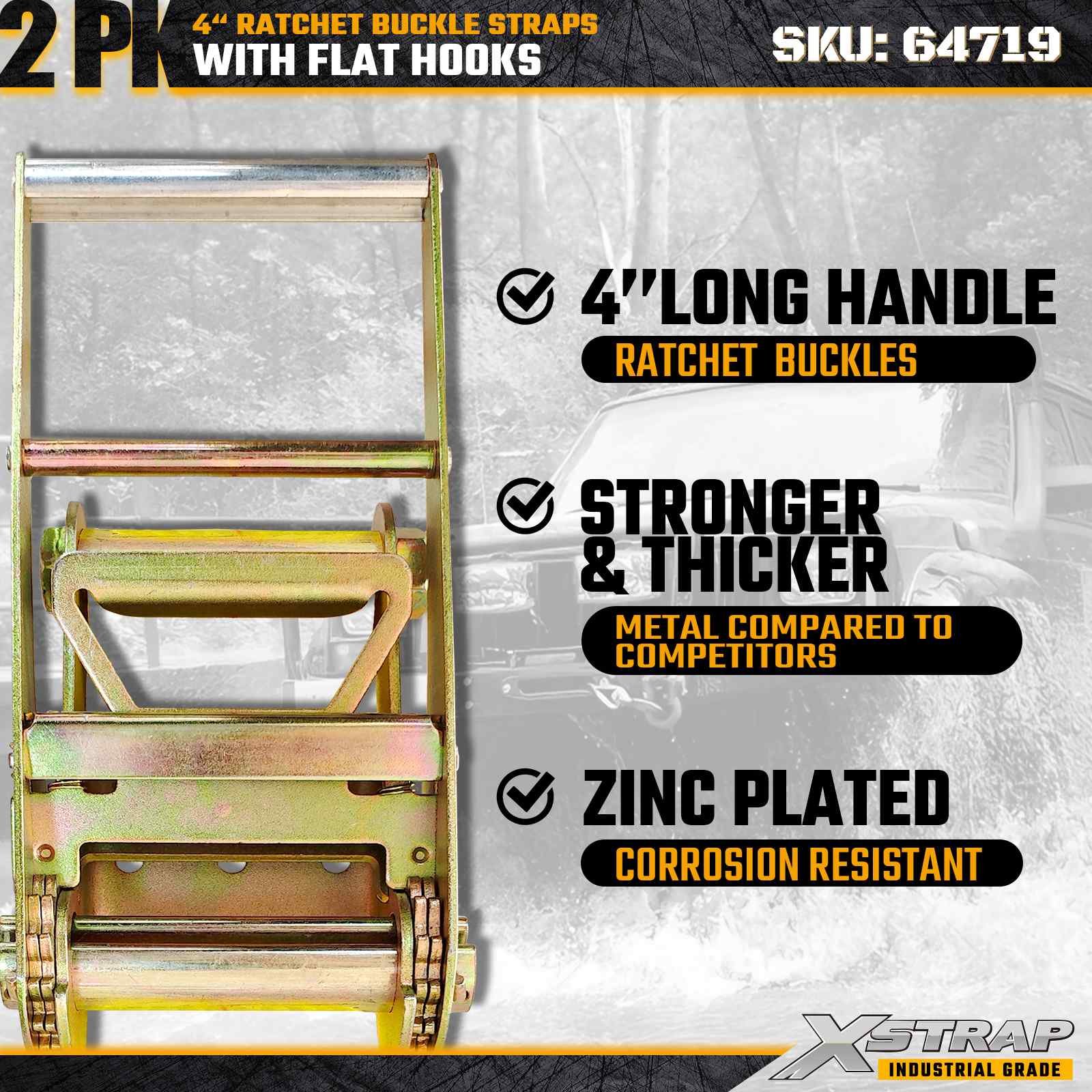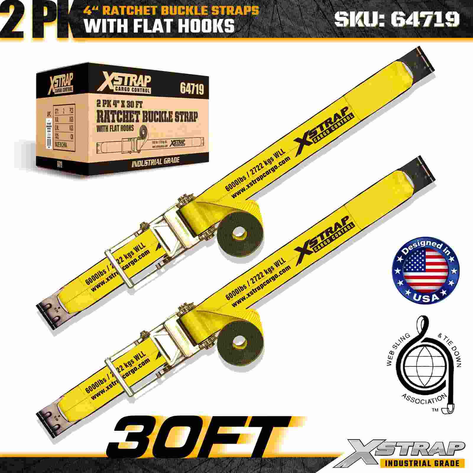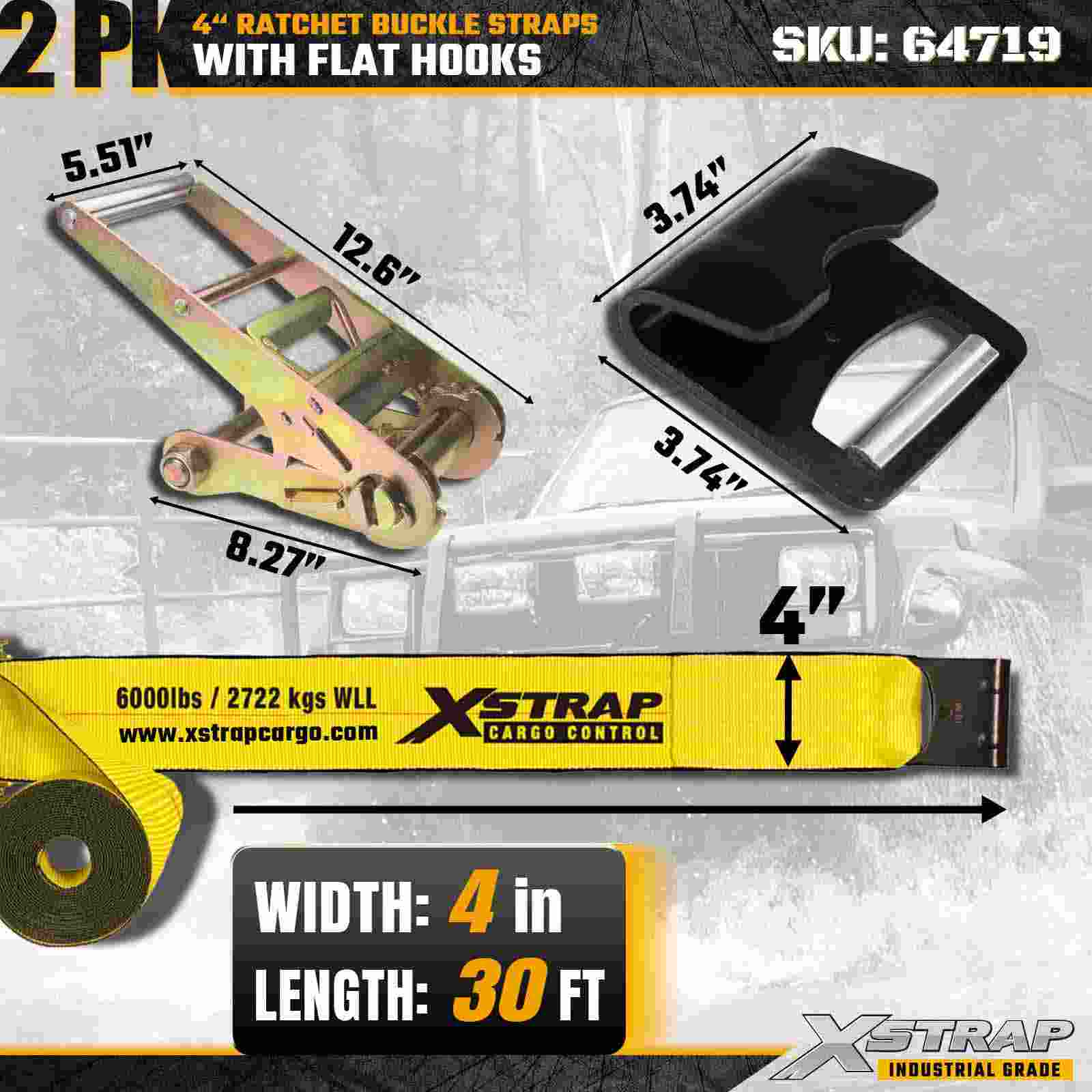 Xstrap 64719 4" × 30 ft spärrspänne (2-pack) levererar kraftig lastsäkring med förstärkta platta krokar och en hållbar spärrmekanism. Bedömd till 6 000 lbs WLL och 18 000 lbs Break Strength, de är idealiska för industriella maskiner och transporter i lastbilar och flacka maskiner.