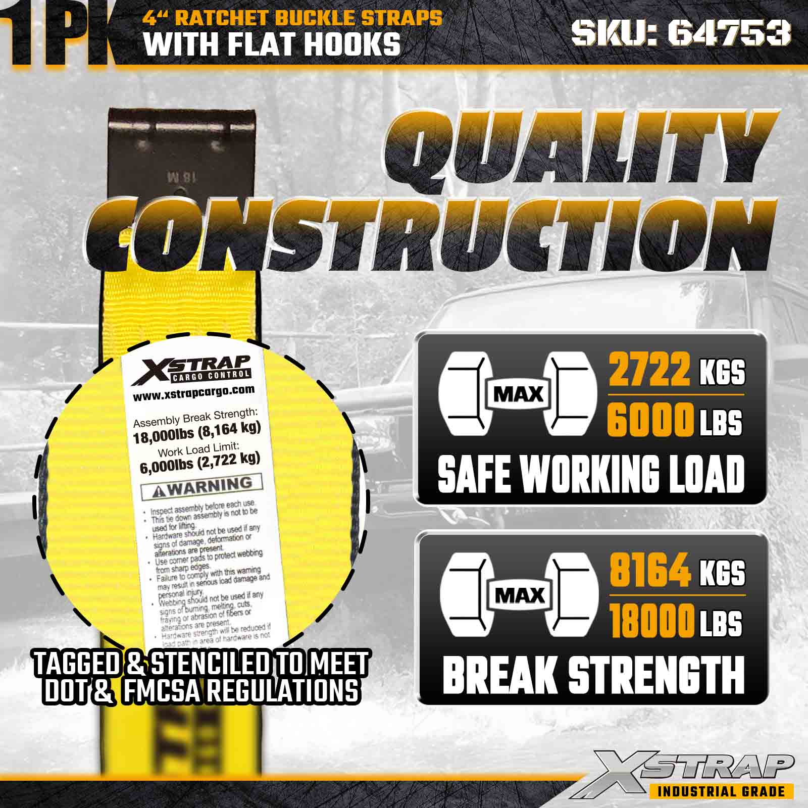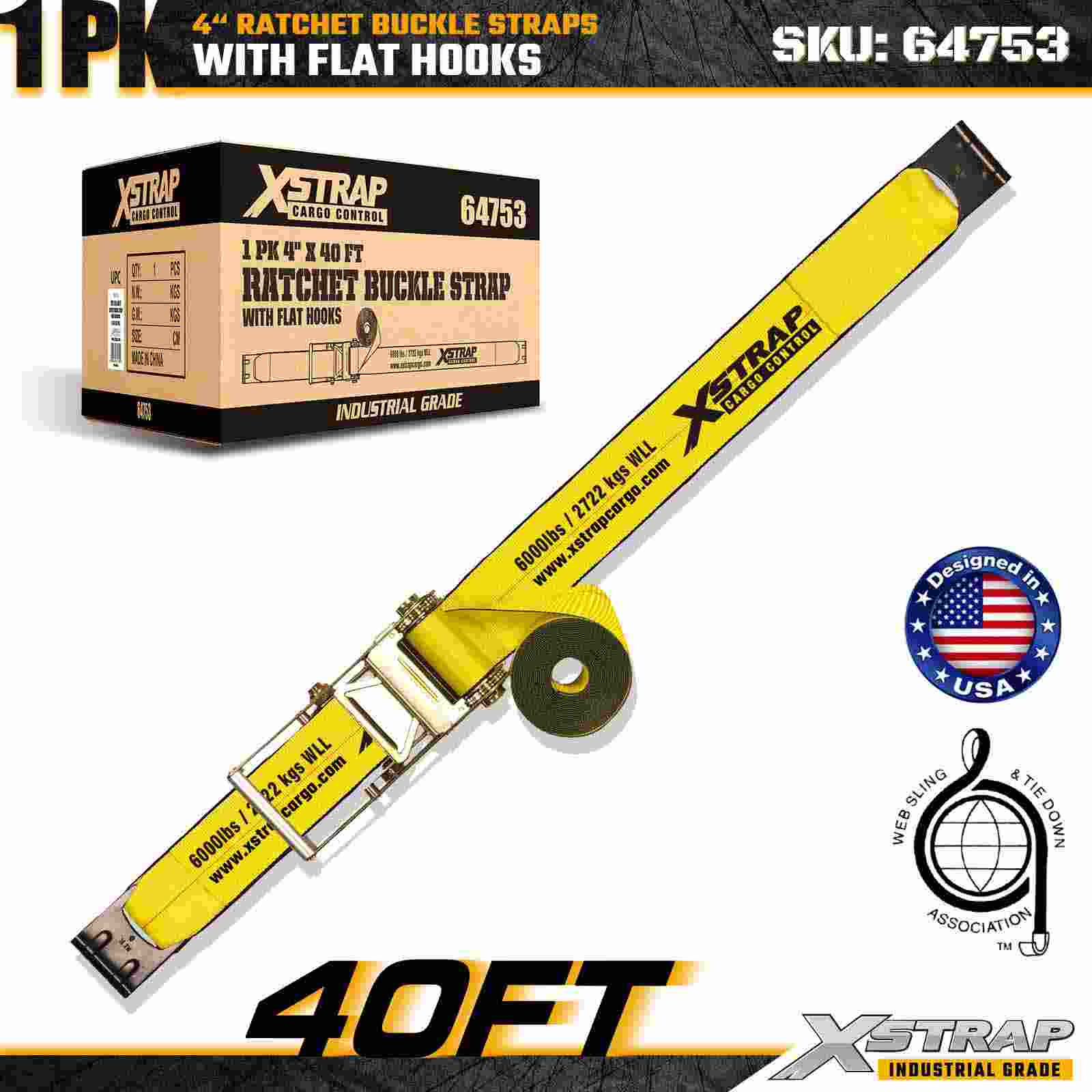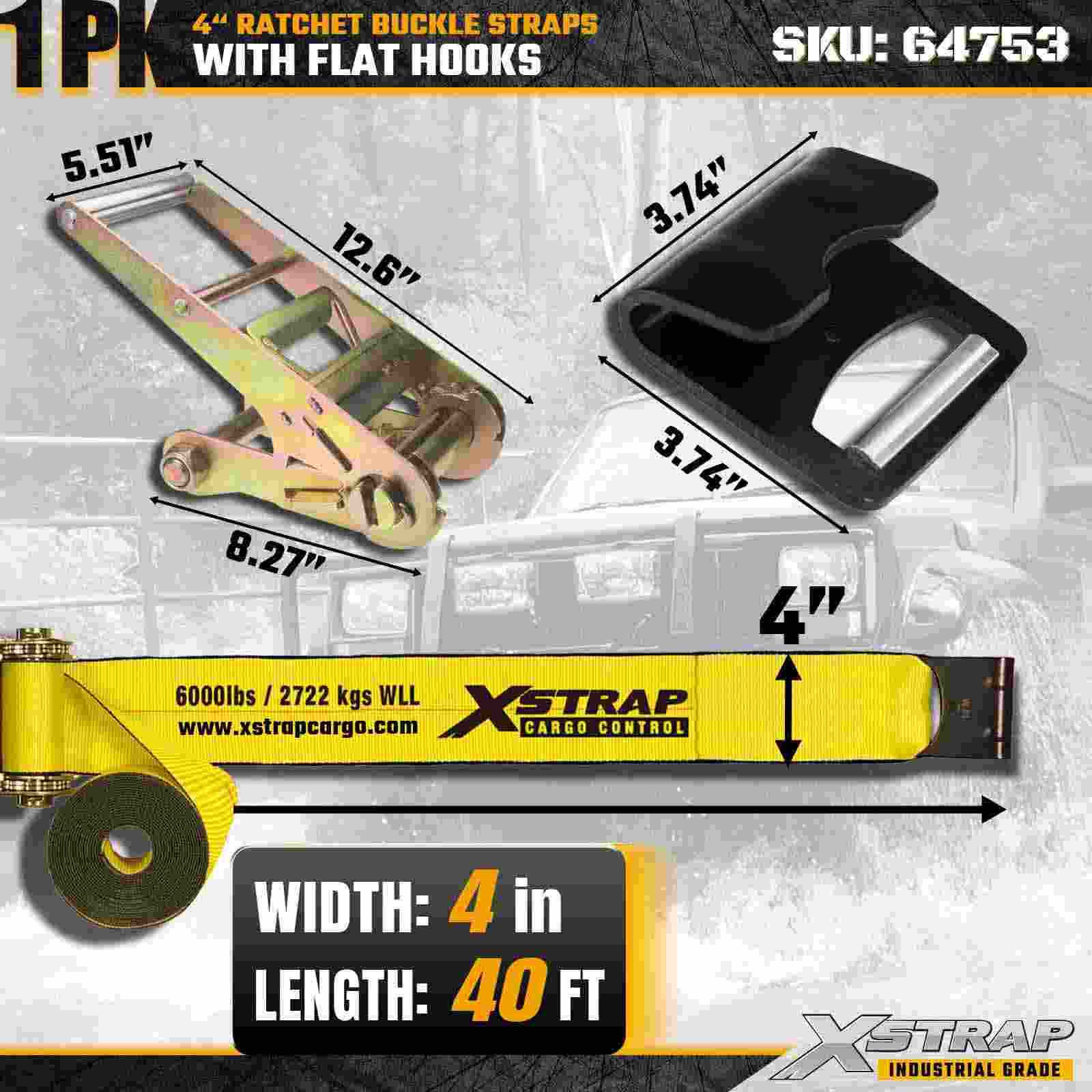 Xstrap 64753 4" × 40 fot spärrspänne (1-pack) är designad för tung lastsäkring, med förstärkta platta krokar och en hållbar spärrmekanism. Med en arbetsbelastningsgräns på 6 000 pund och 18 000 pund är denna extra långa, platta remsa idealisk för brytning överdimensionerade laster, maskintransport och industriella lastapplikationer.