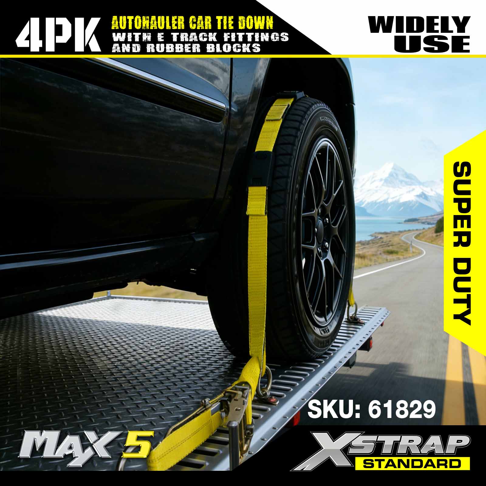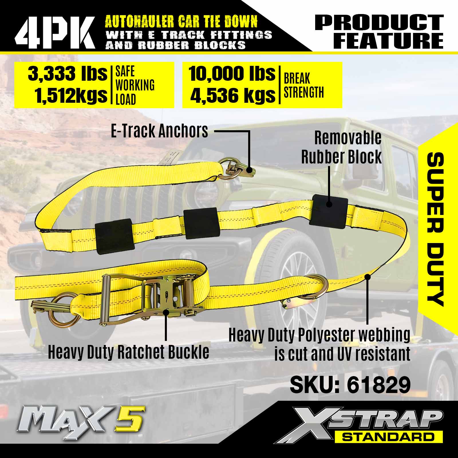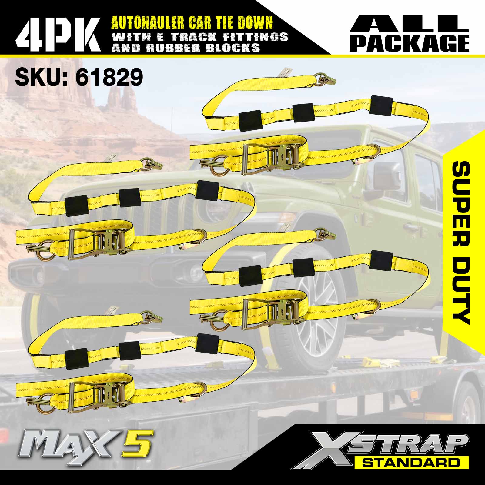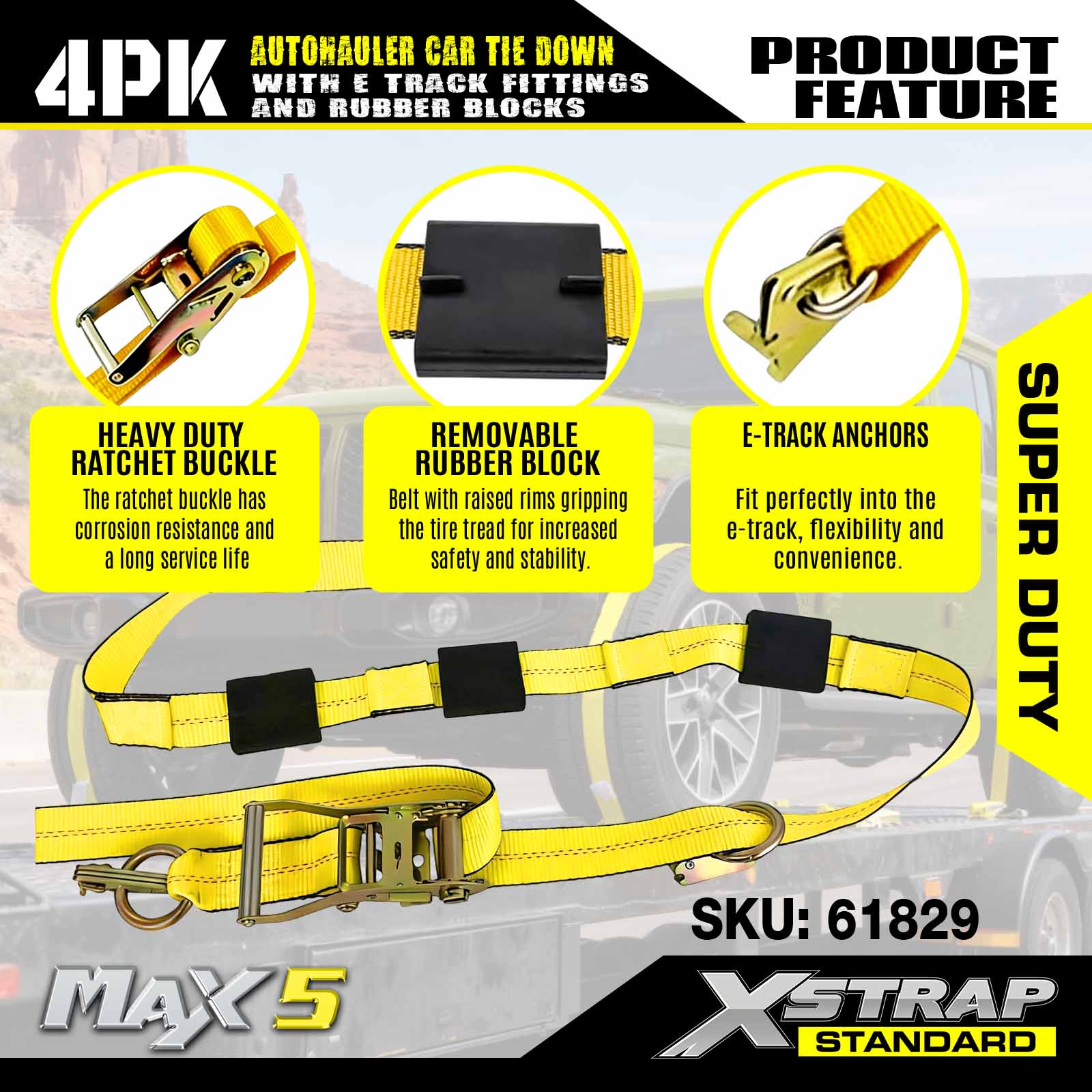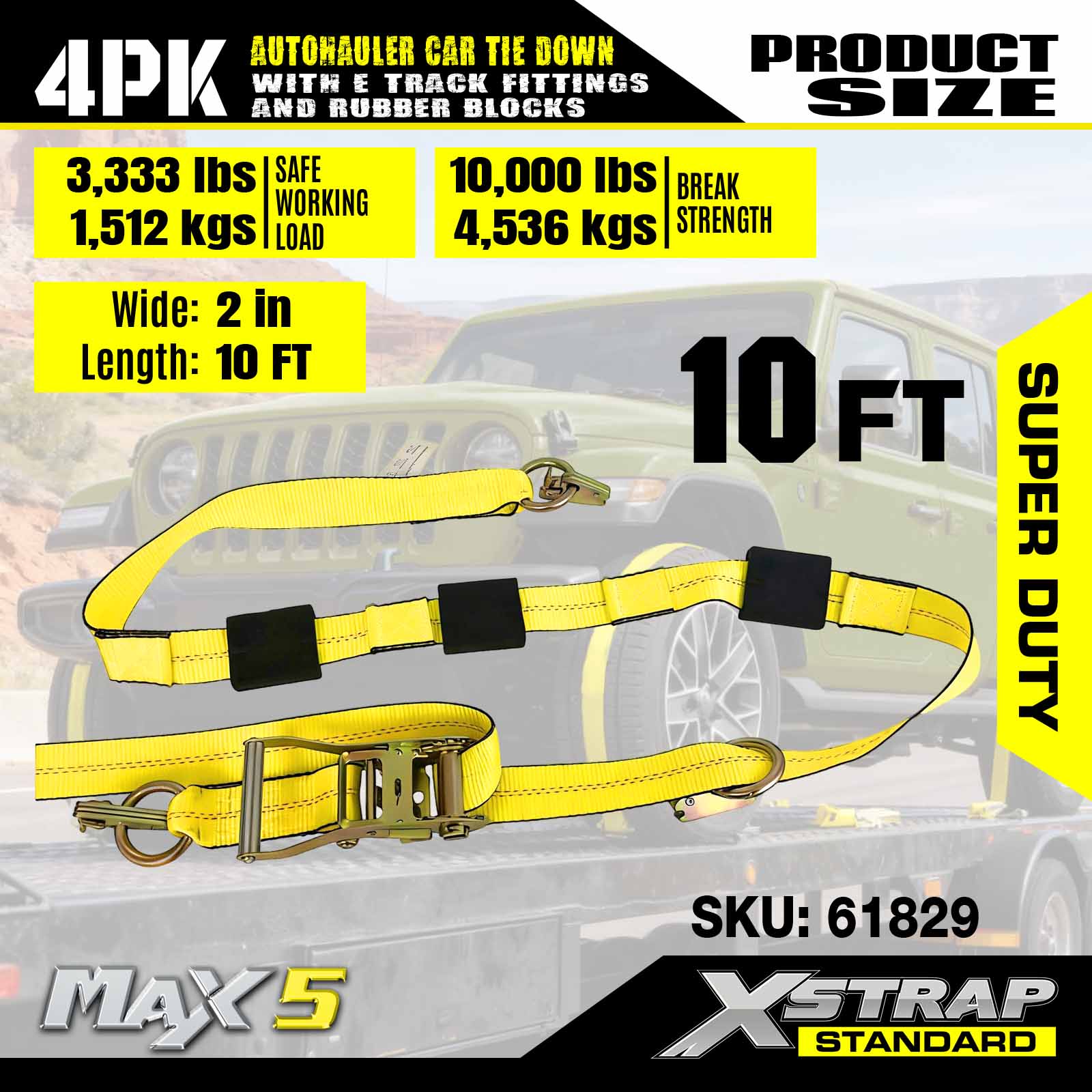 Xstrap E Track Däckremmar för Trailer Heavy Duty 2" x 10" Auto Hauler Strap-10 000 lb garanterad brottstyrka-(4) Premium Vehicle Tie Down Kit med gummiblock Hjulfästningar för lastbil, UTV