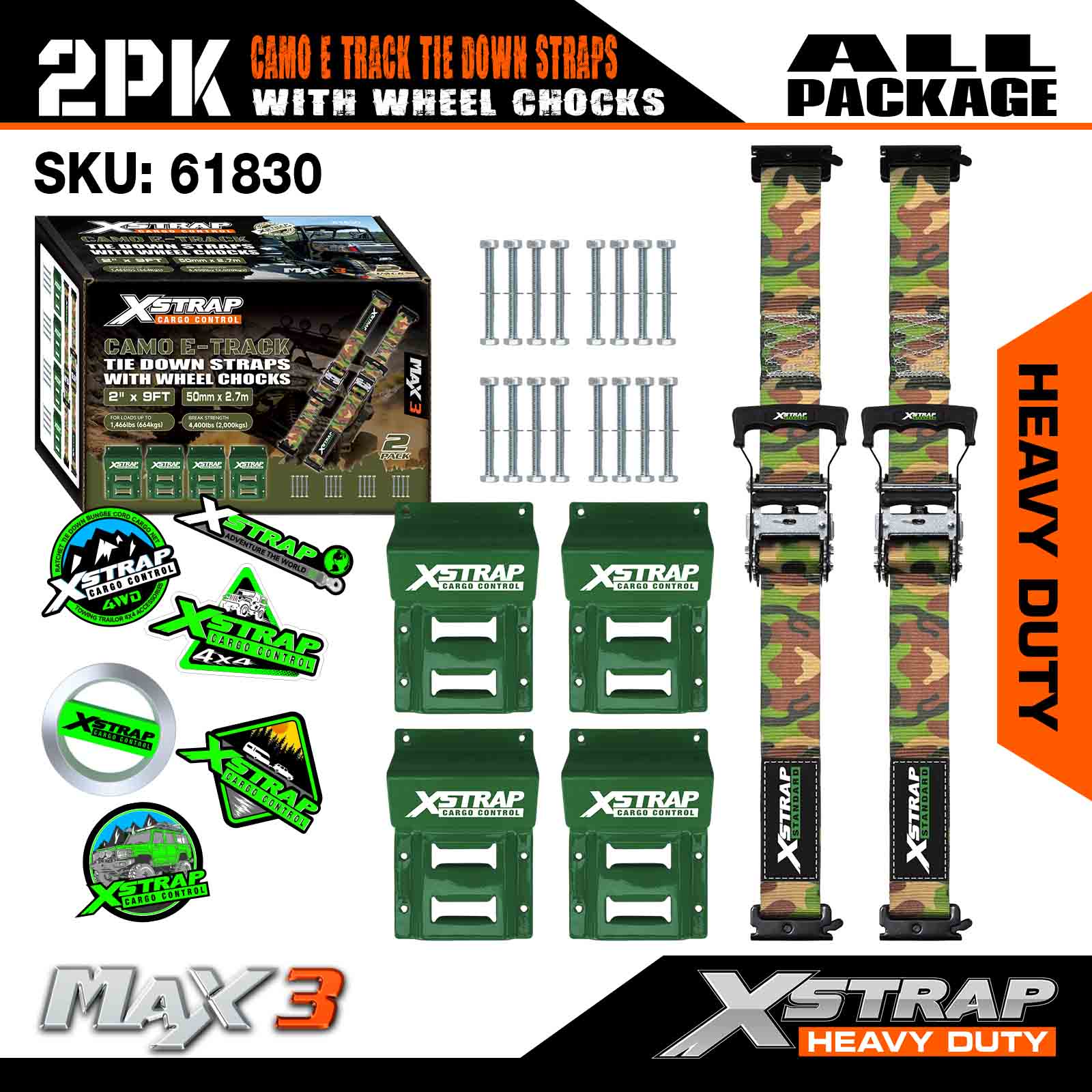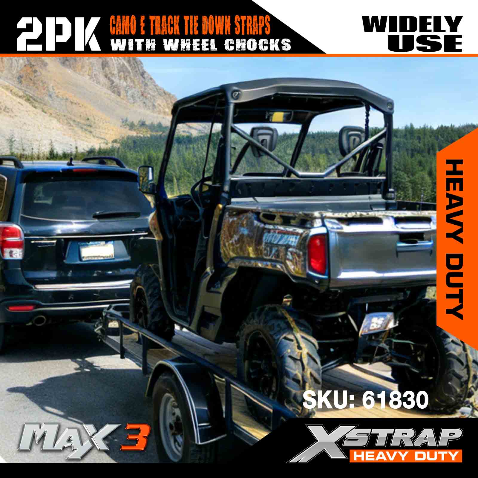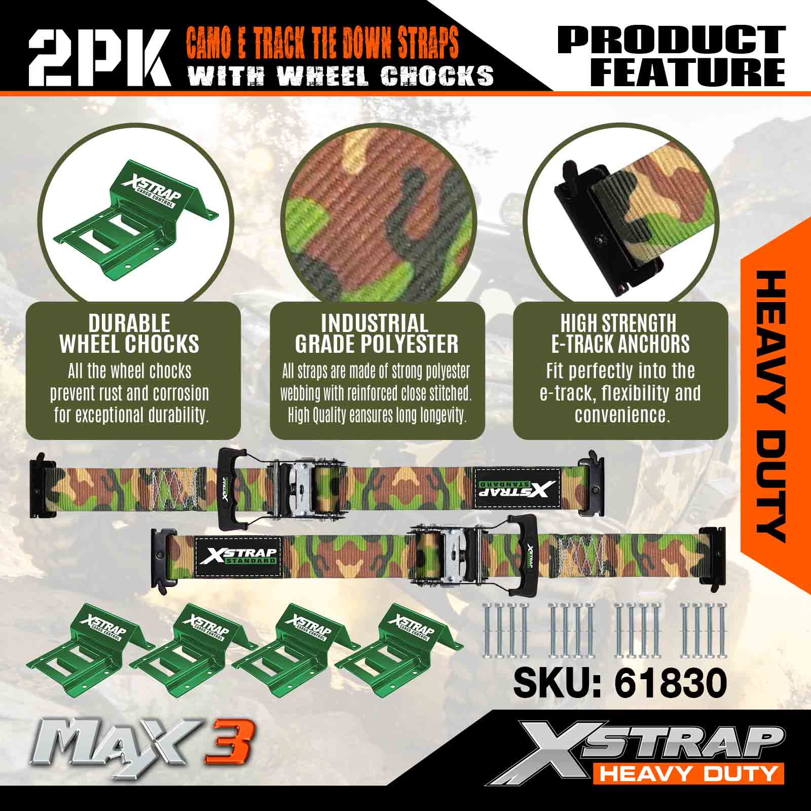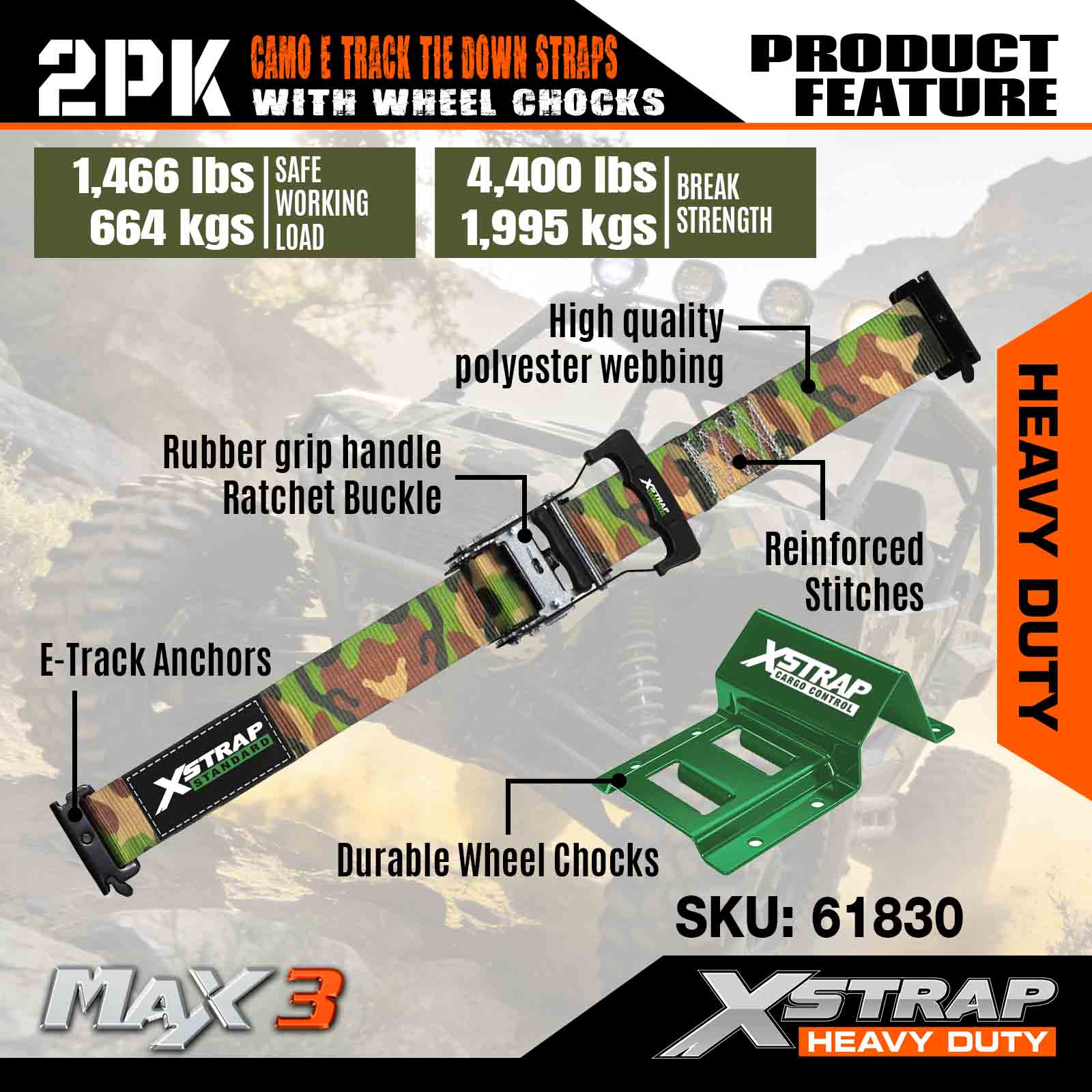 Xstrap Wheel Chock Tie Down Kit 4 400 lb Brottstyrka (2) Heavy Duty Trailer Däck Spärrband (4) Hjulklossar - E Track System för ATV, UTV, Gräsklippare Fyrhjuling - CAMO