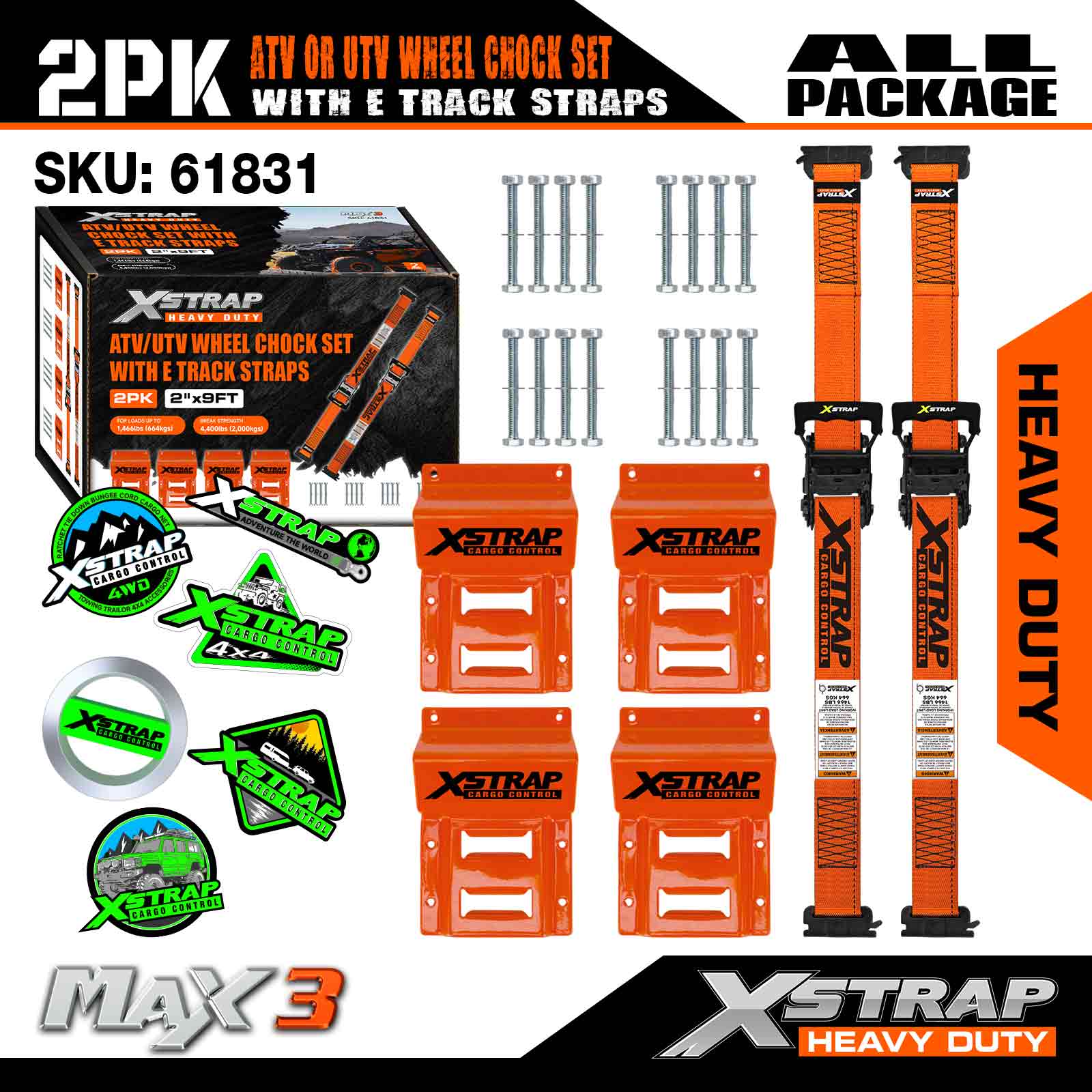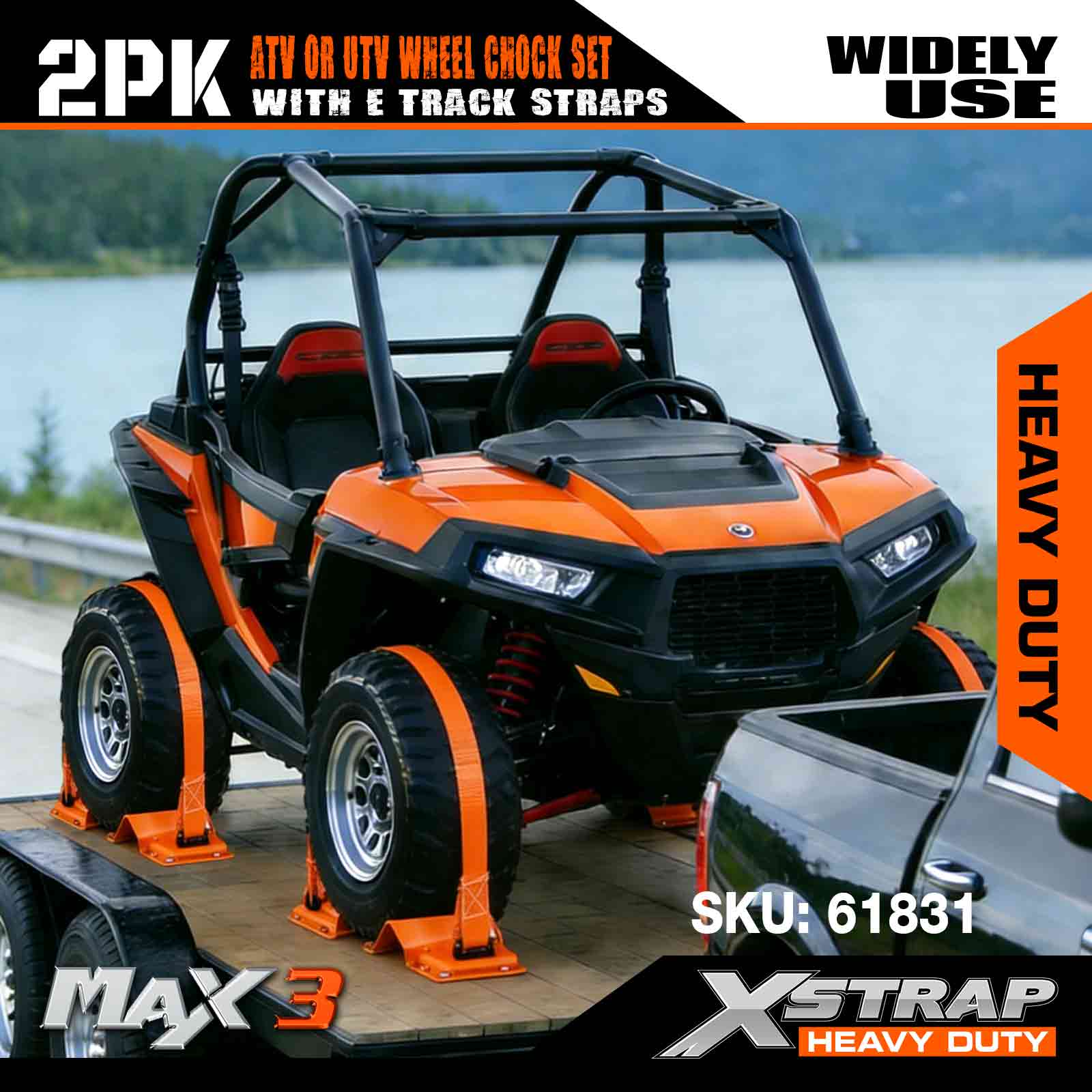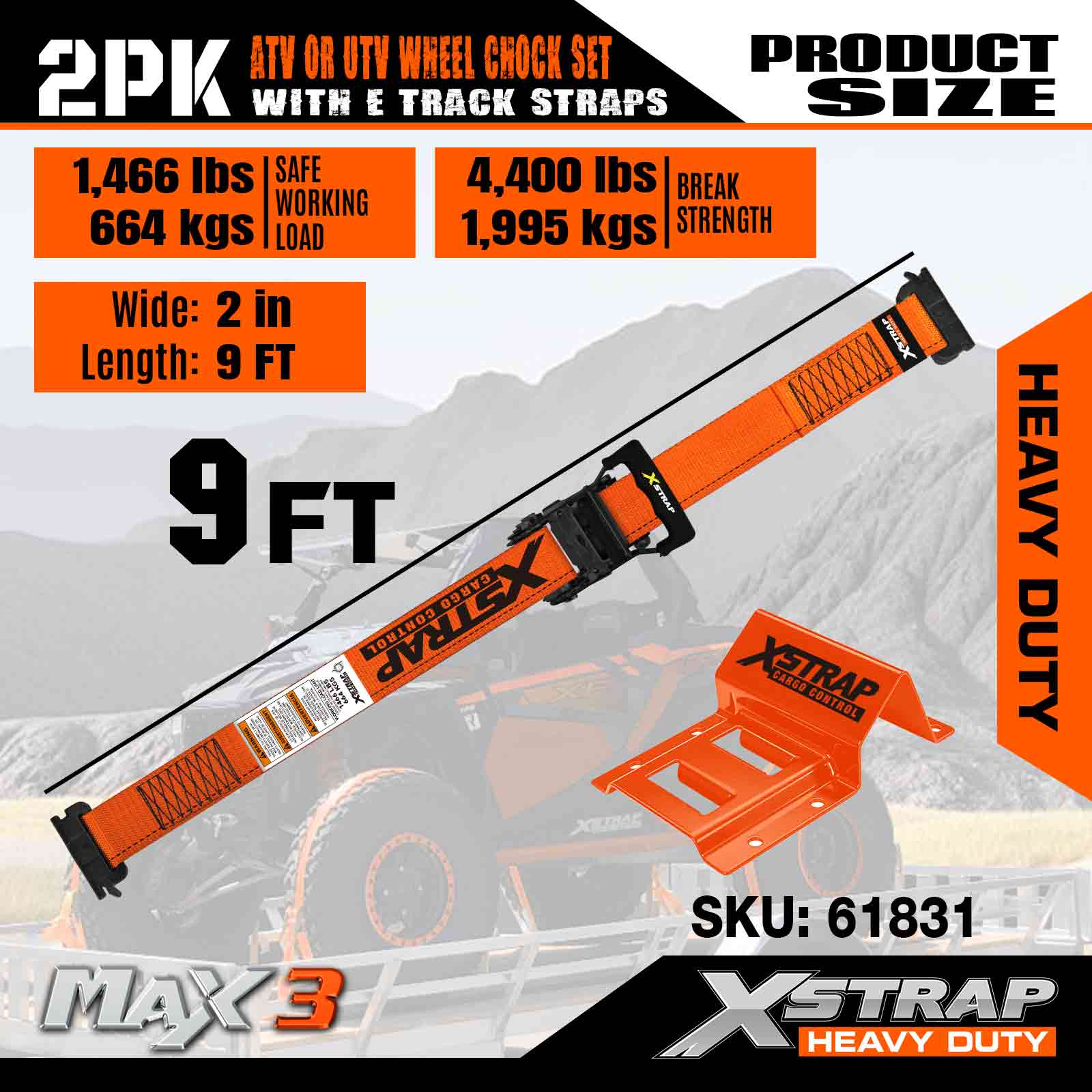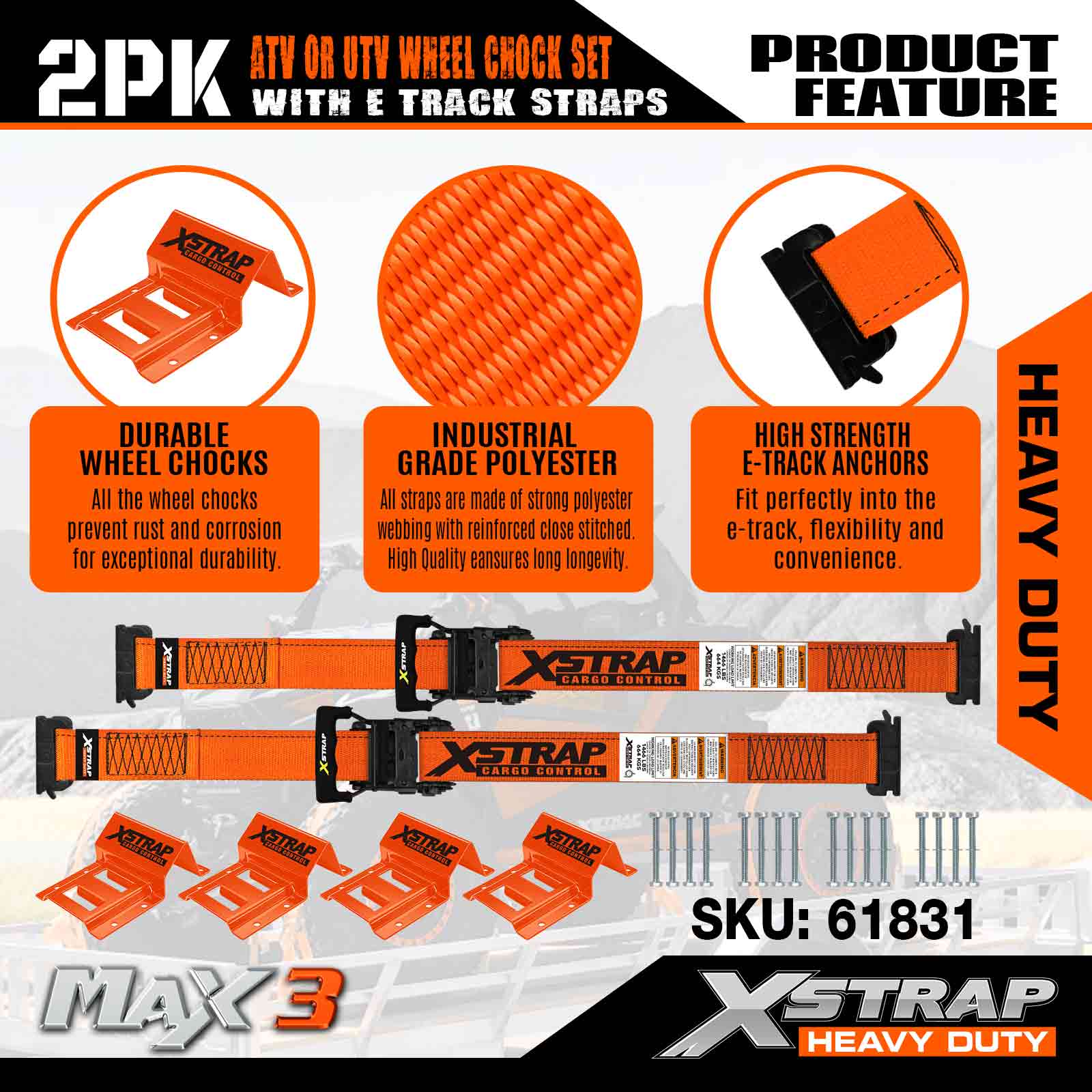 Xstrap UTV Hjulklossfäste 4 400 lb Brottstyrka (4) Kraftiga släphjulsspärrband (8) Hjulklossar - E Track System för ATV, UTV, Gräsklippare Fyrhjuling - Orange