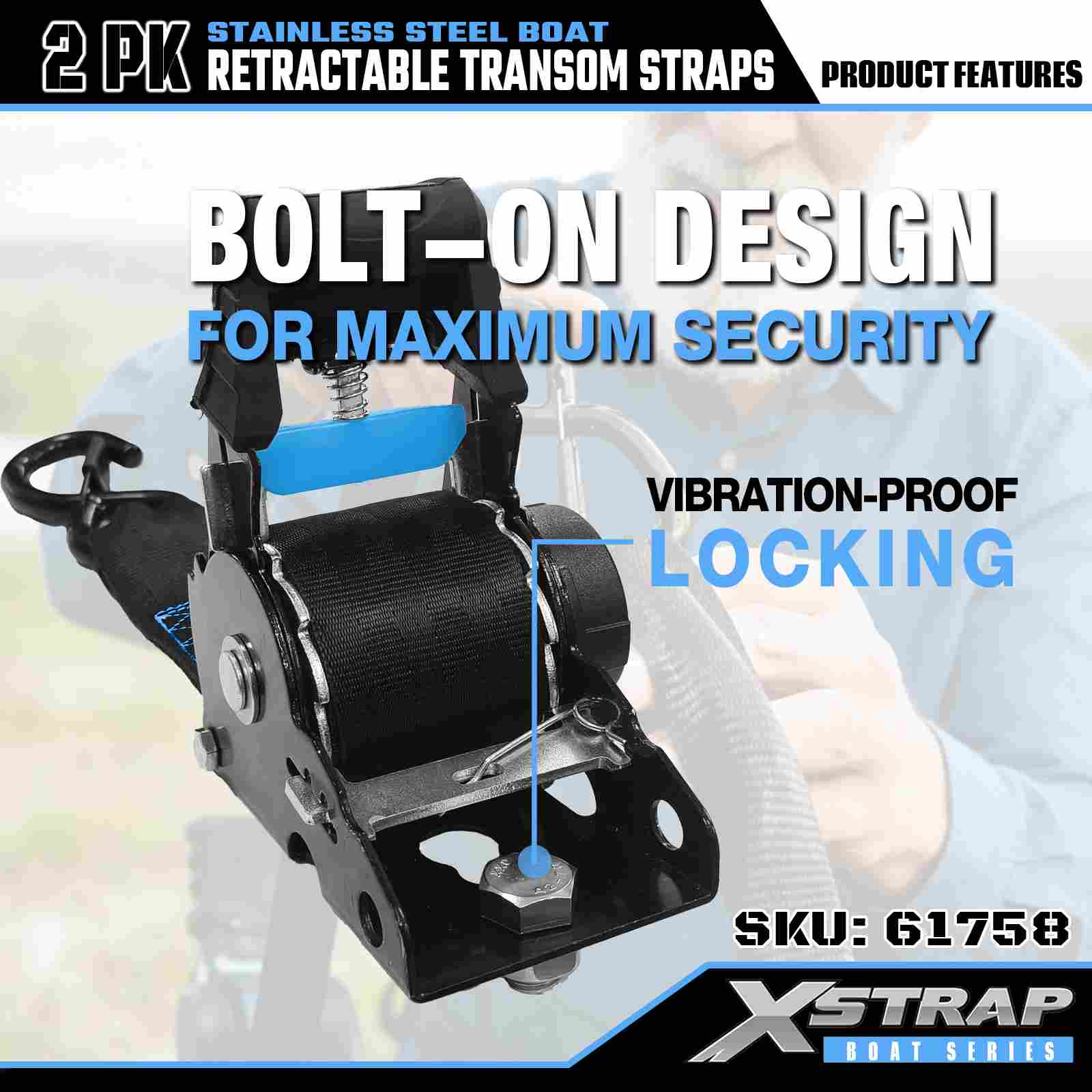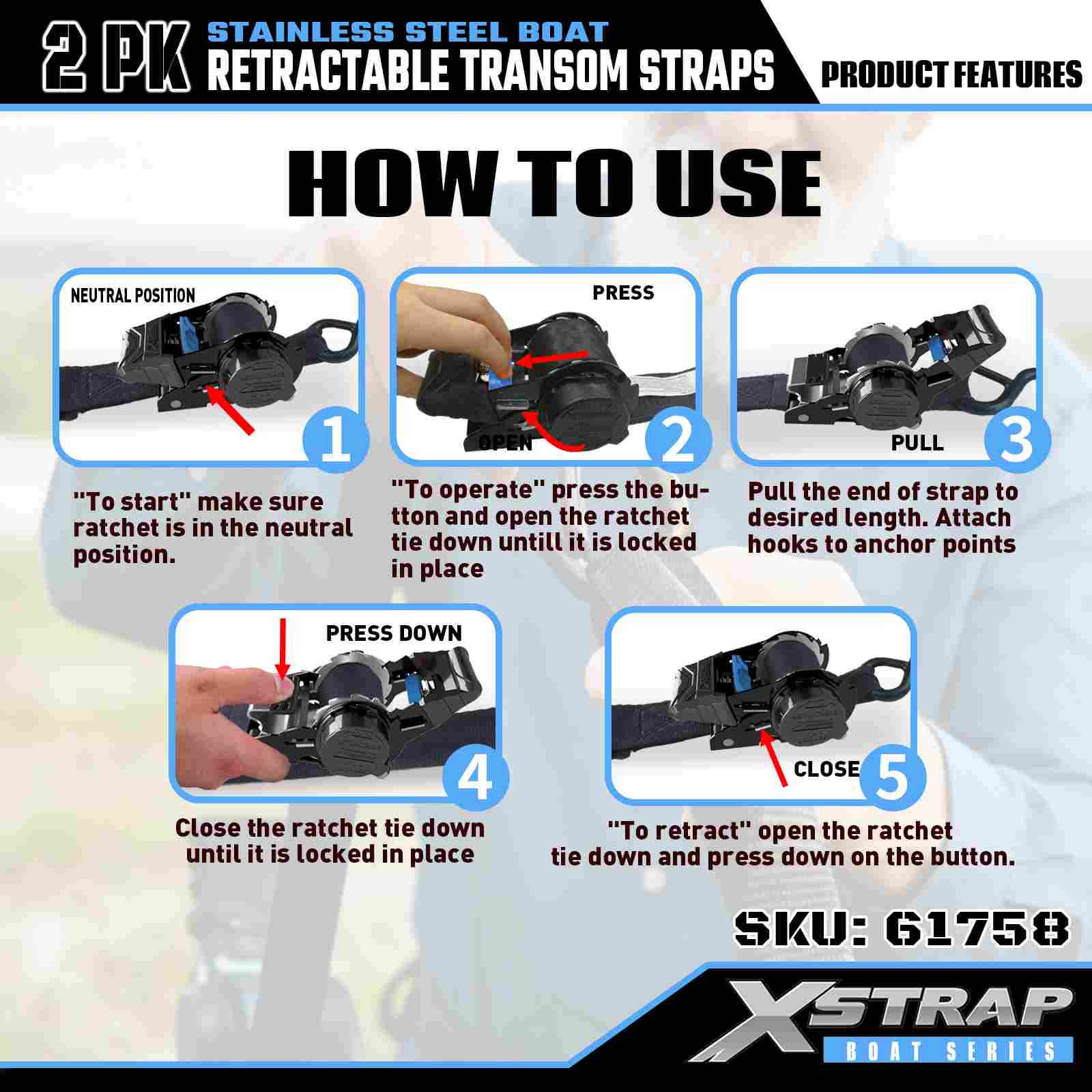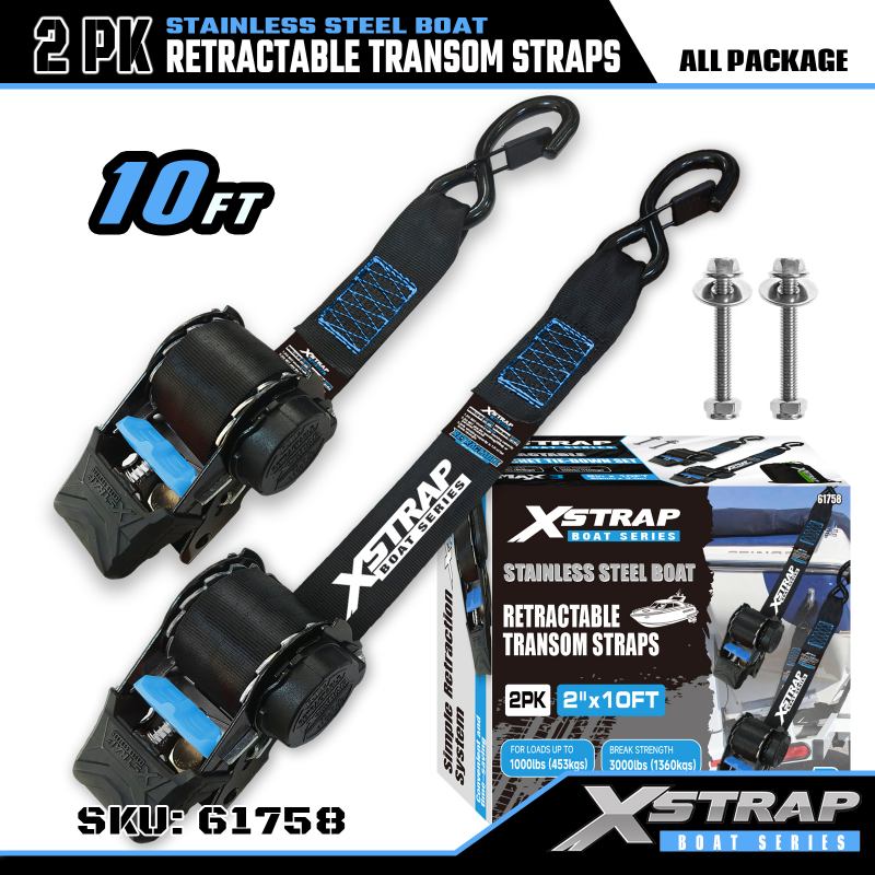 Xstrap 2PK infällbar akterspegelsrem för båt med Safety S-krokar, 2" x 3,6" polyesterbindningsrem Infällbar rem, 1000lbs Kapacitet Lastsurrning Säkringsremmar med Safety S-krok för den seriösa proffsen för att säkra lastsläp, plattsläp, skidbåt, liten bil.