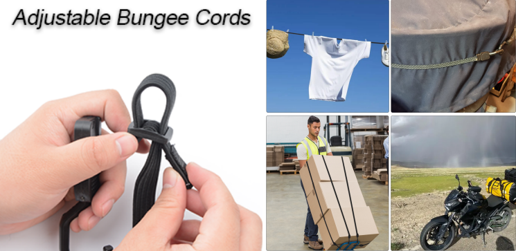 Justerbara bungee-snören ger ökad stabilitet och minskad tendens att gräva i föremål. De är mångsidiga och lämpliga för ett brett spektrum av applikationer, inklusive utrustning, organisering av förvaring, bindning av bagage eller presenningar, säker utomhusutrustning, trädgård, garage eller reseapplikationer.