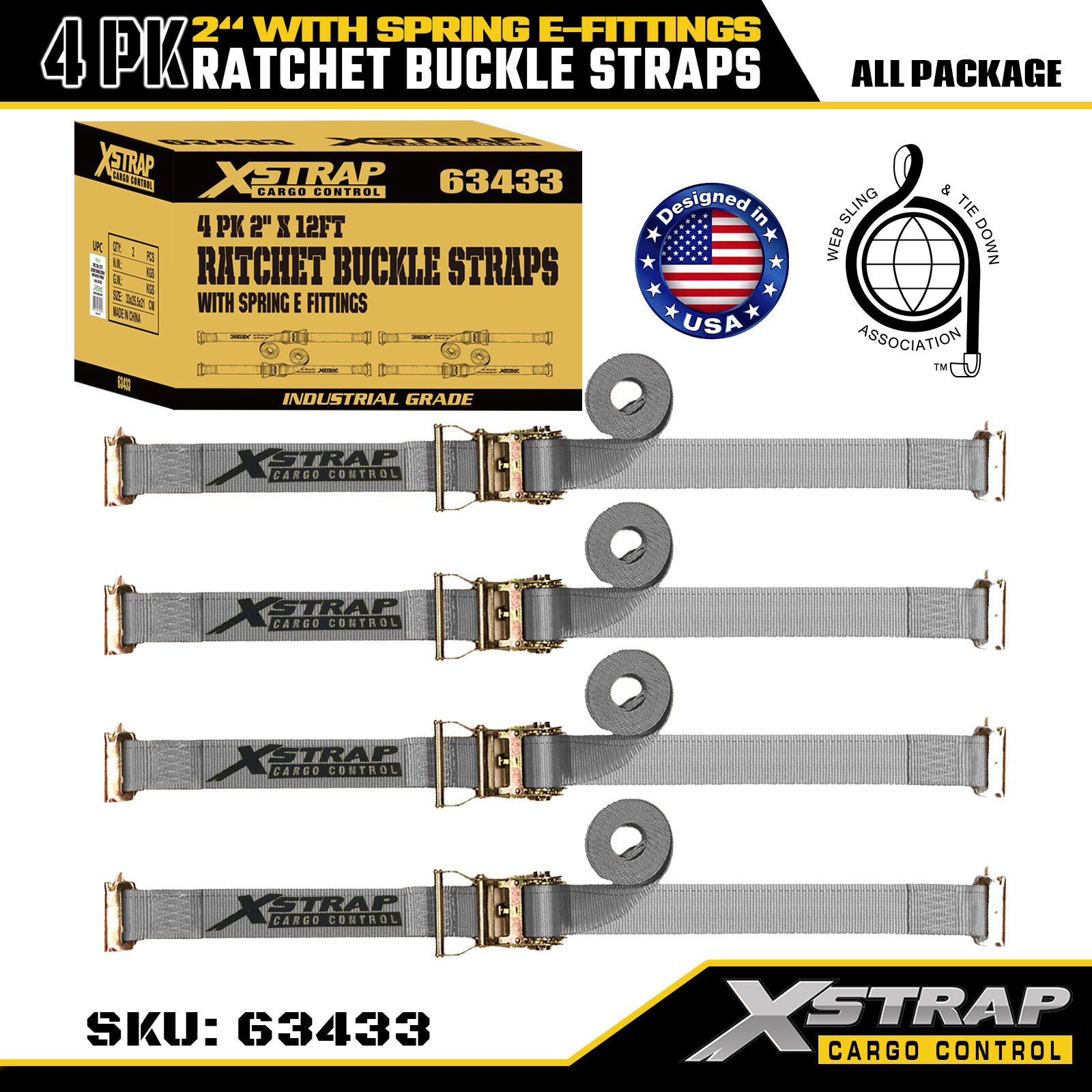 Xstrap 4-pack spärrremmar, 2" x 16" polyester lastsäkringsremmar, 1467 lbs säker arbetsbelastning och 4401 lbs brotthållfasthet, med metall E-krokar för lastbil, gräsklippare, terränghjulingar2. Produktspecifikation: