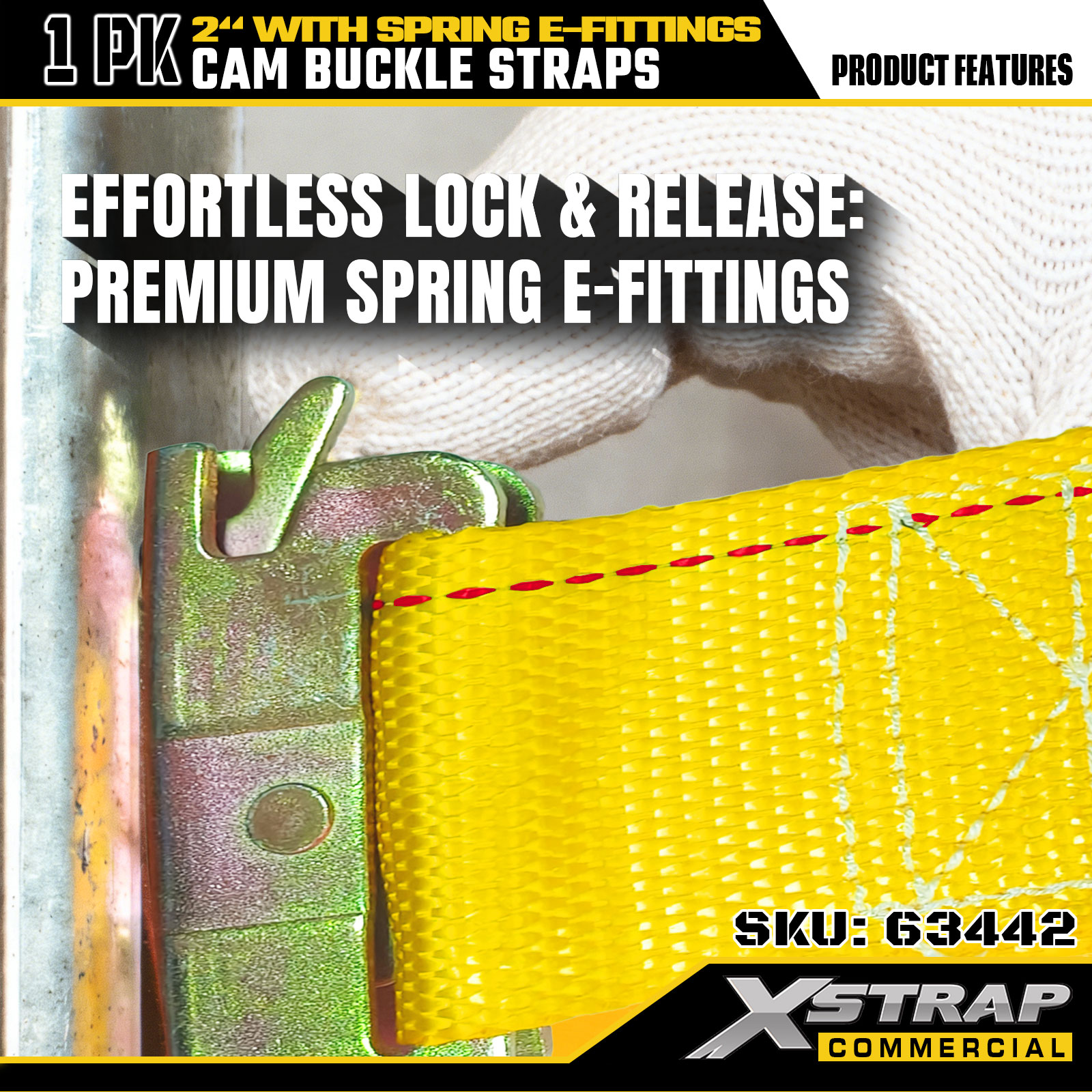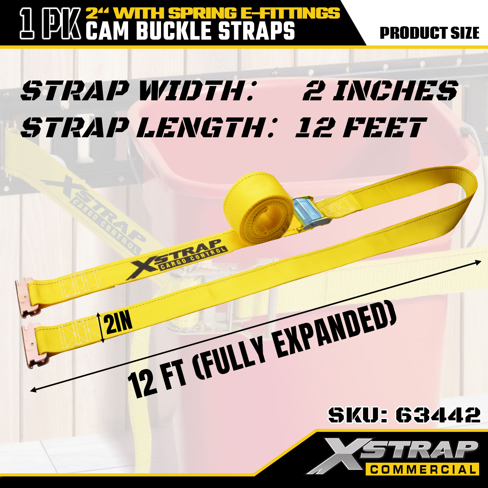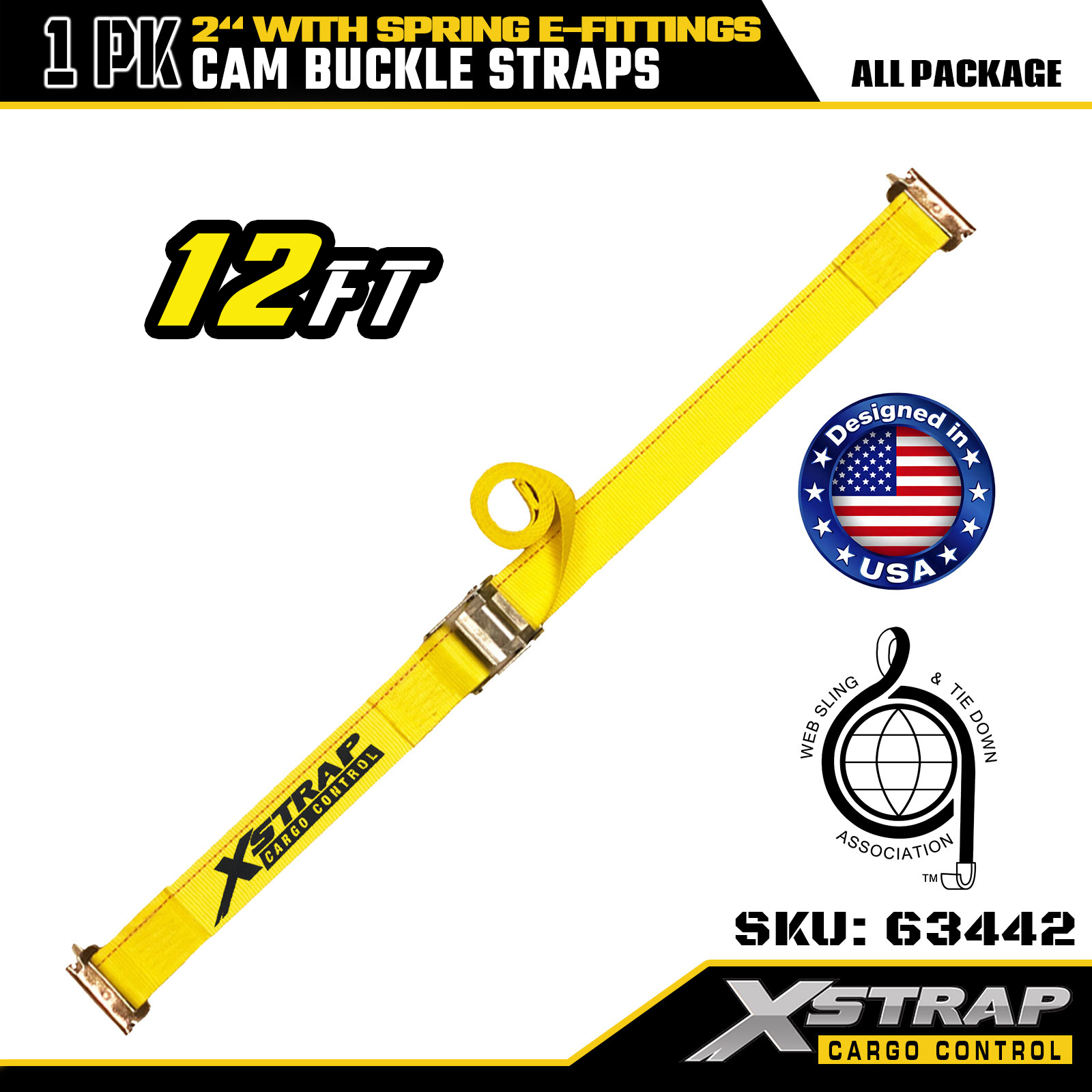 Xstrap 63442 Heavy-Duty Cam Spänne Strap 2" x 12' (1PK) - Gul polyester med fjäder E-kopplingar, 1000 lbs SWL & 453 lbs brottstyrka för förflyttning, lastkontroll och transport