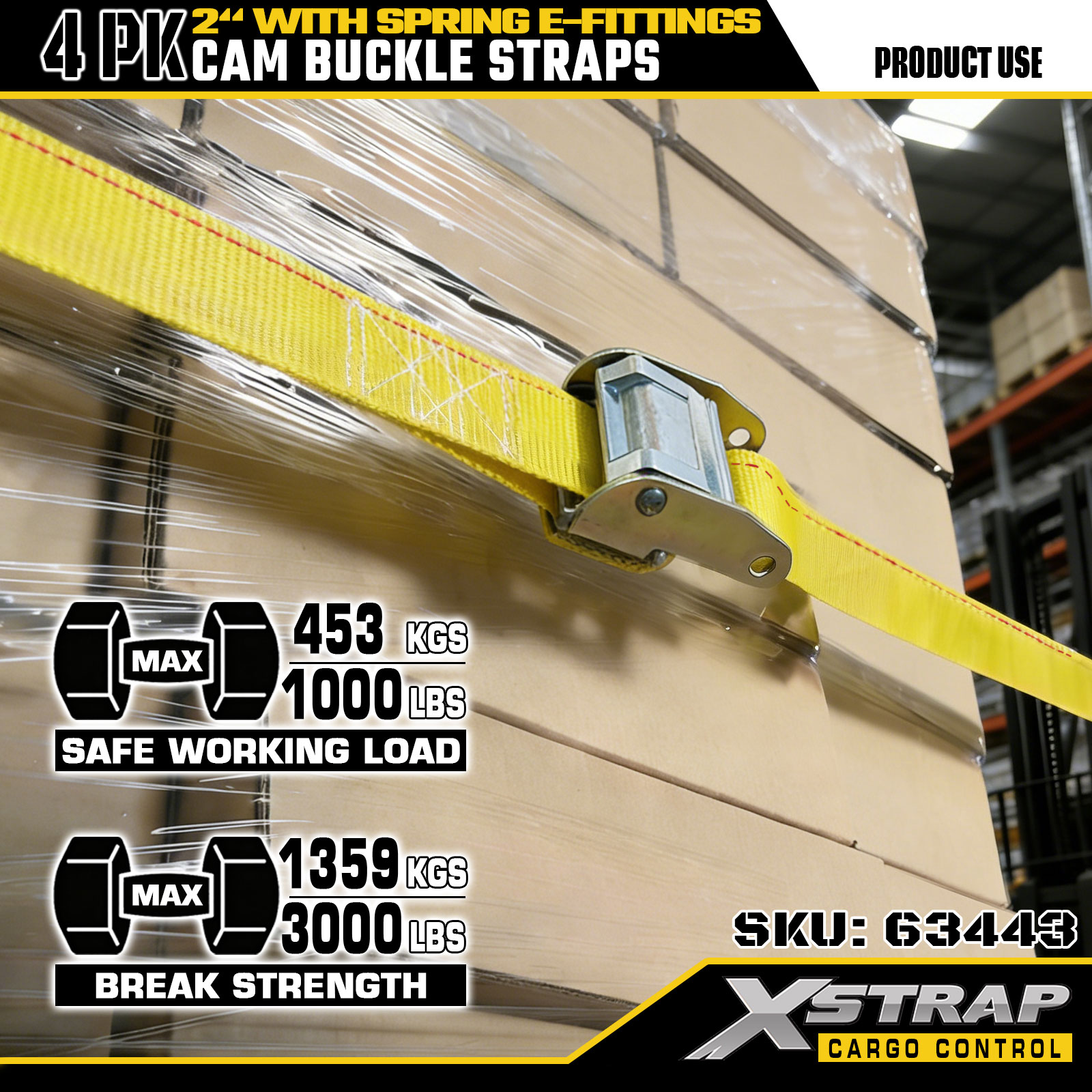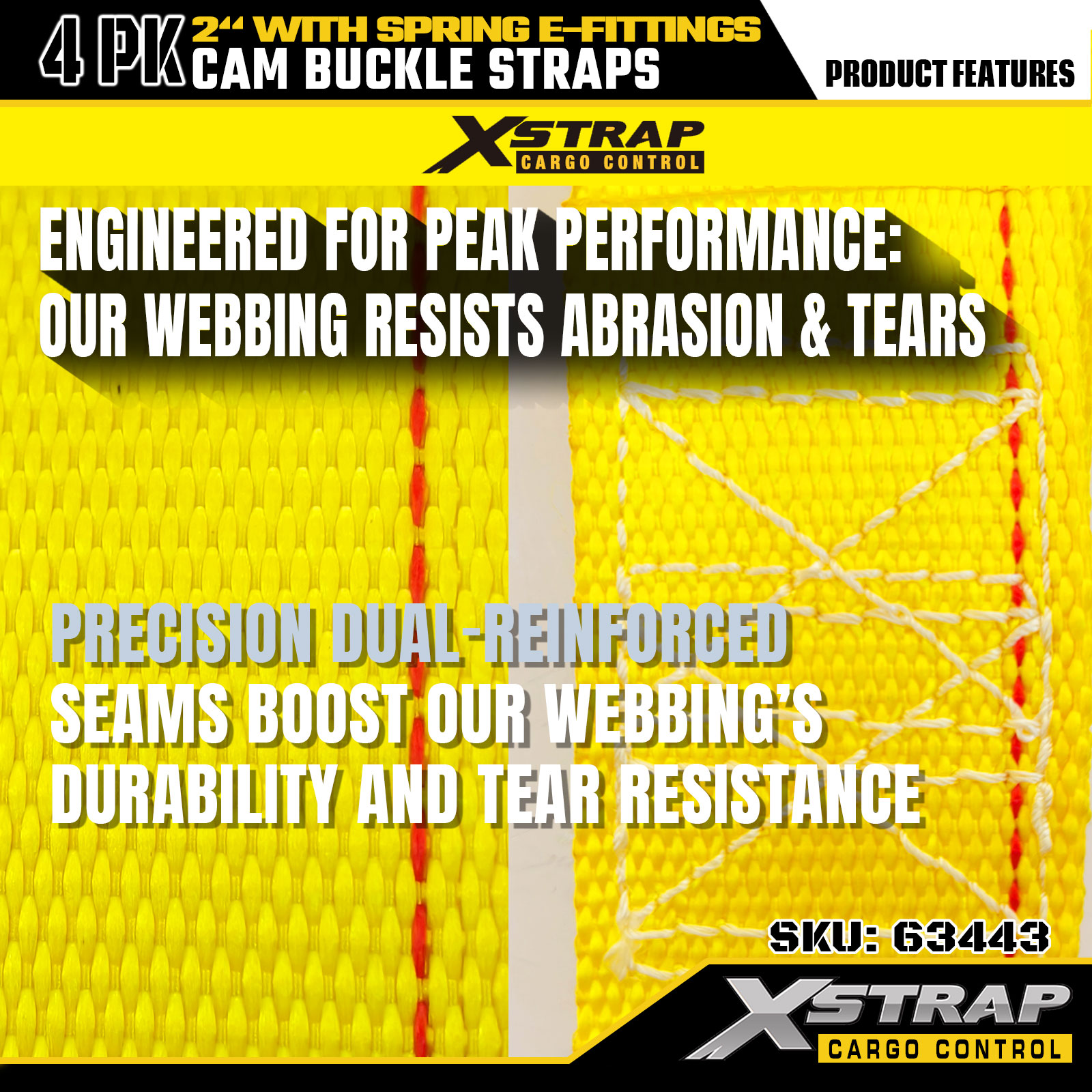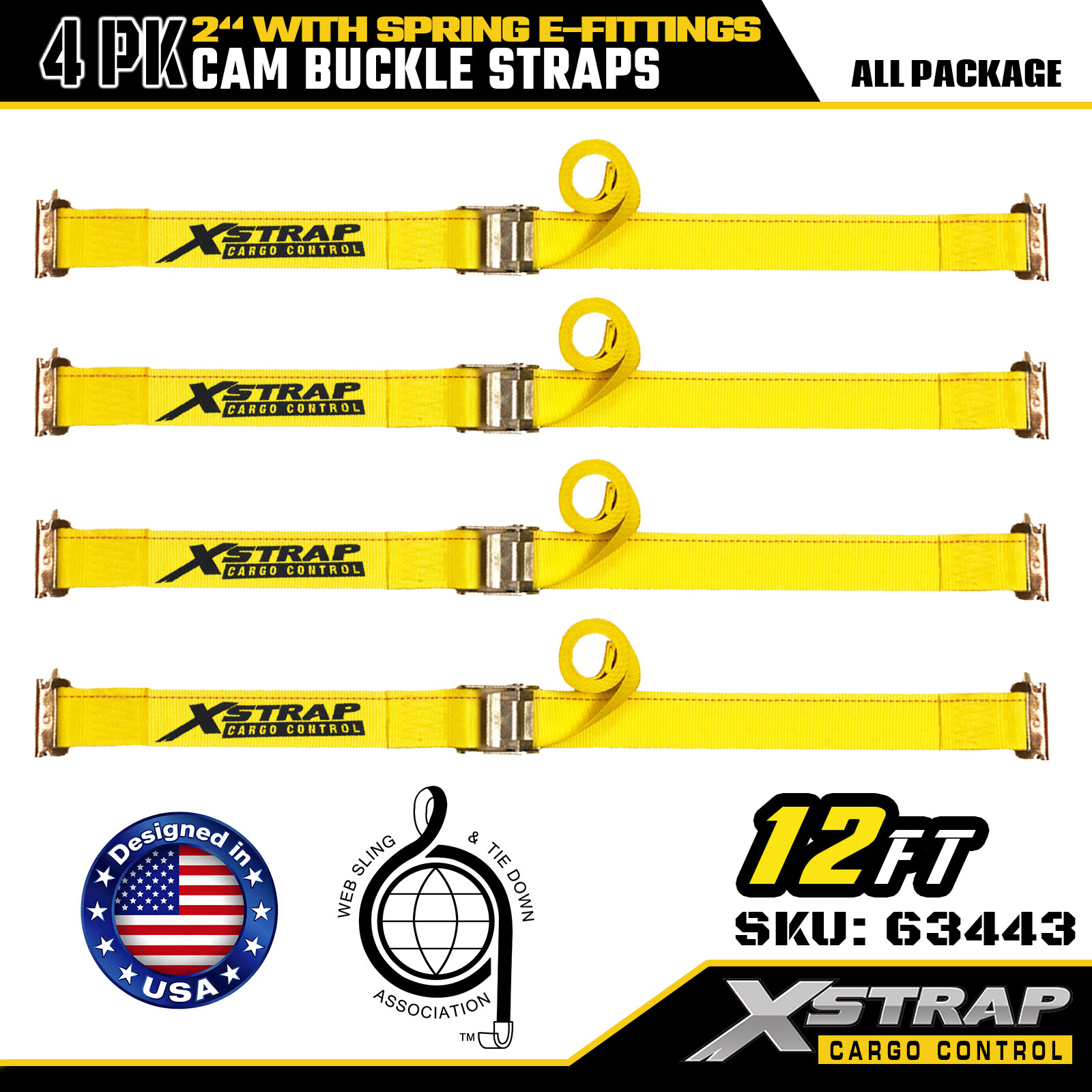 Xstrap 63443 4-pack 2" x 12" gula kamspänne med fjäderbeslag, 1000 lbs SWL & 453 lbs brottstyrka för lasthantering, omlokalisering och transitering