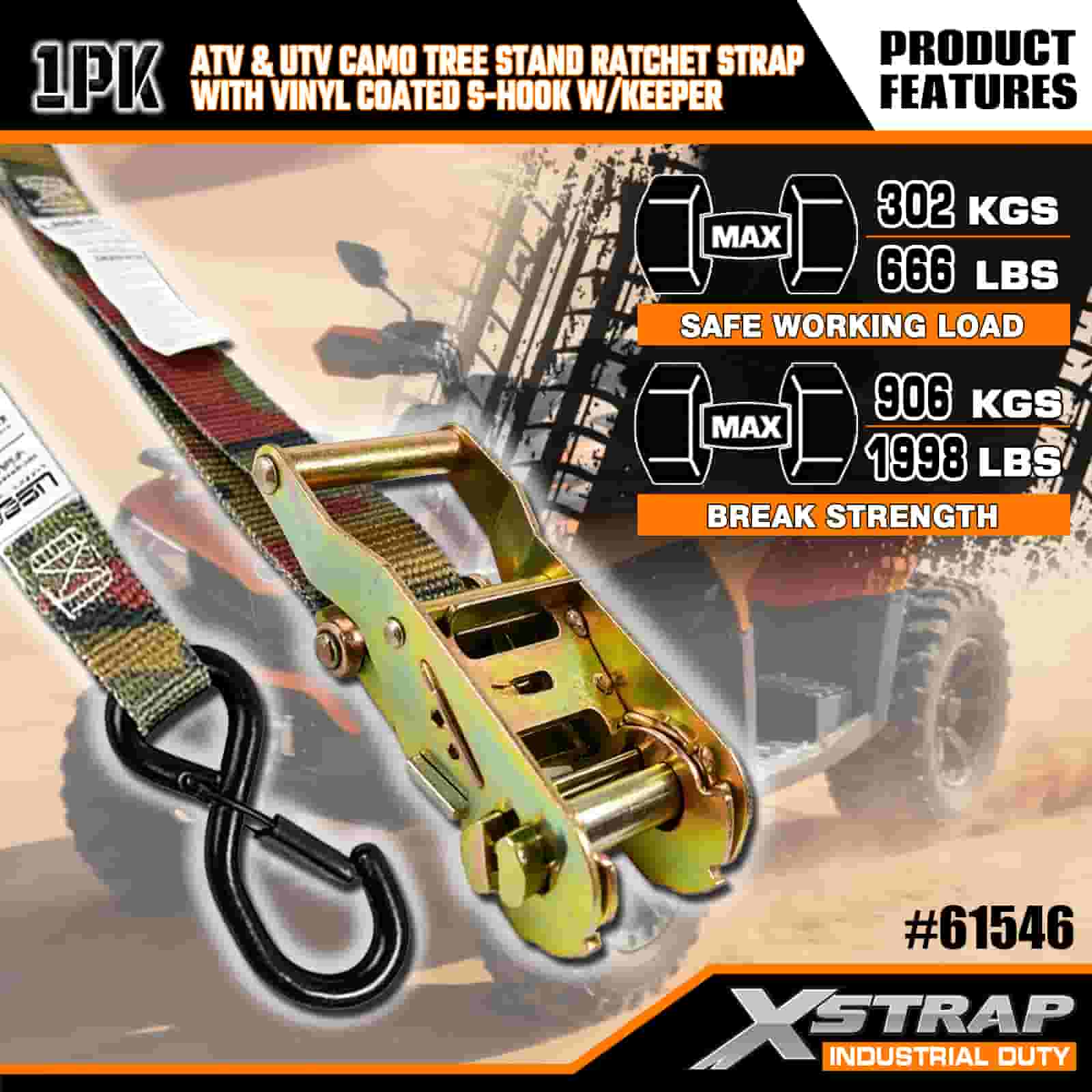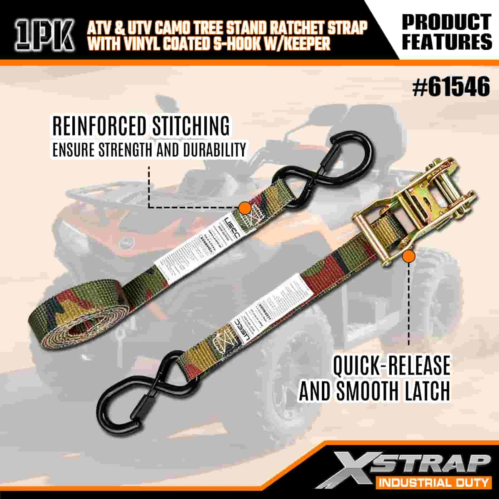 - Blend in, Lock In: Kamouflagedesignen låter remmen smälta in i utomhusmiljön, medan dess förstärkta sömmar och kraftiga spärr håller din ATV, trädställning eller motorcykel tätt låst. Du behöver inte längre oroa dig för att flytta last i ojämn terräng.