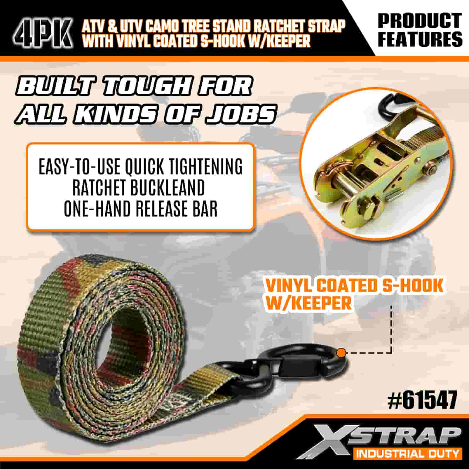 - Väderbeständig och reptålig: De vinylbelagda S-krokarna förhindrar repor på ditt fordon eller trädställning, medan den korrosionsbeständiga spärrhaken står emot regn, snö och fukt. Camobandet motstår UV-skador och fransar, så det förblir starkt säsong efter säsong.