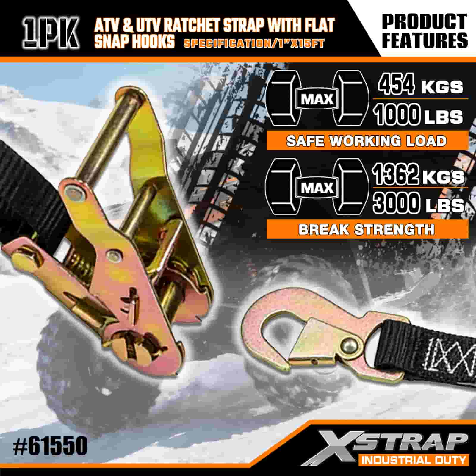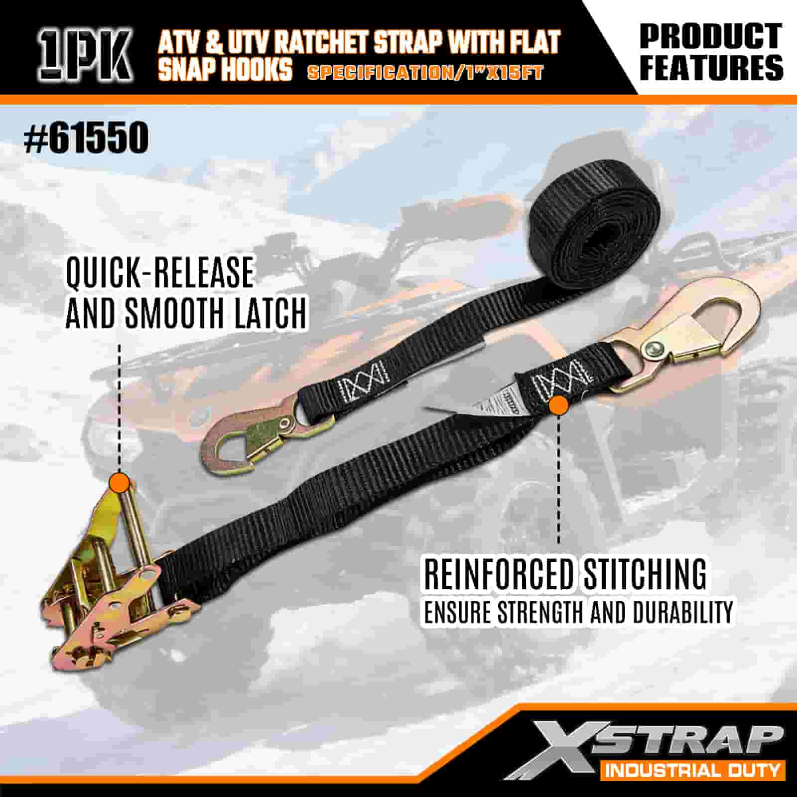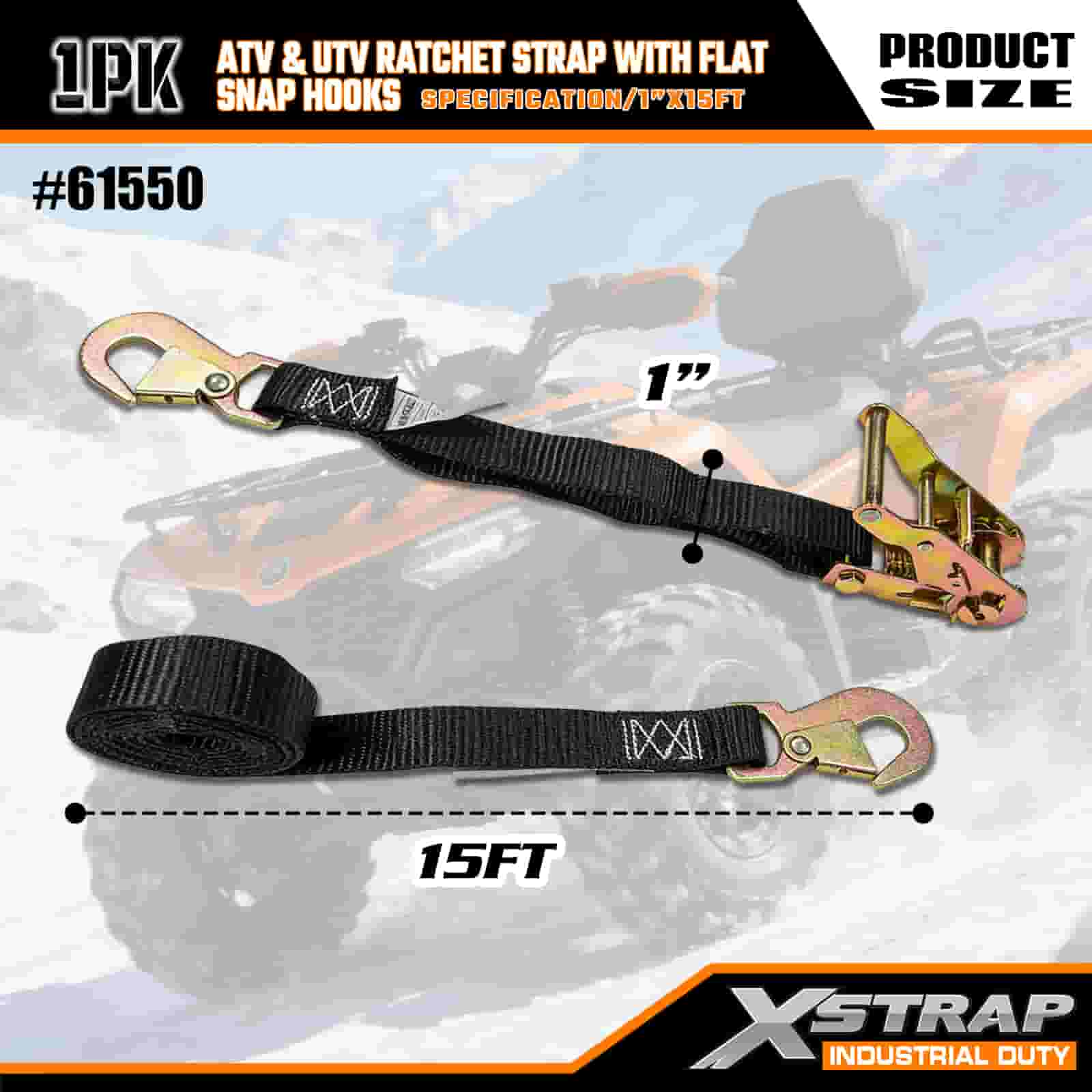 Xstrap ATV- och AUV-spärrrem med platta snäpphakar, 1" x 15' polyesterbindningsrem Spärrrem, 1000 pund kapacitet Lastsurrningssäkringsremmar med platt knäppning för släpvagn, plattbäddssläp, skidbåt, liten bil, tung utrustning.