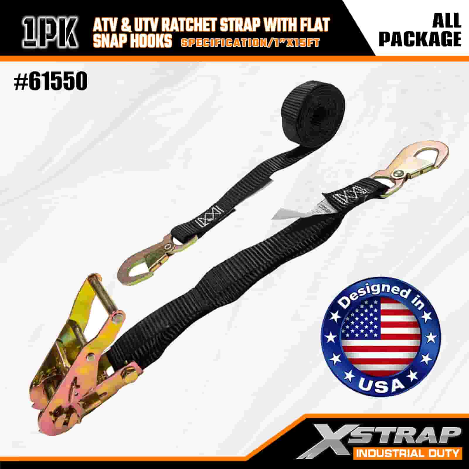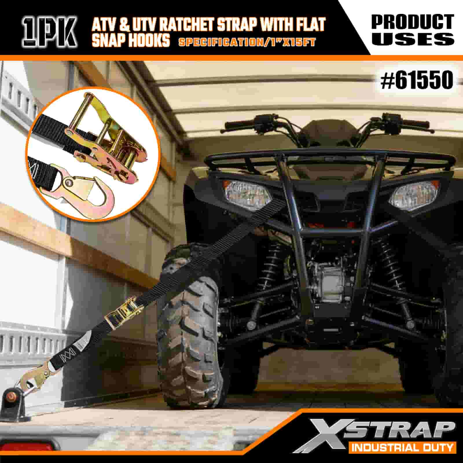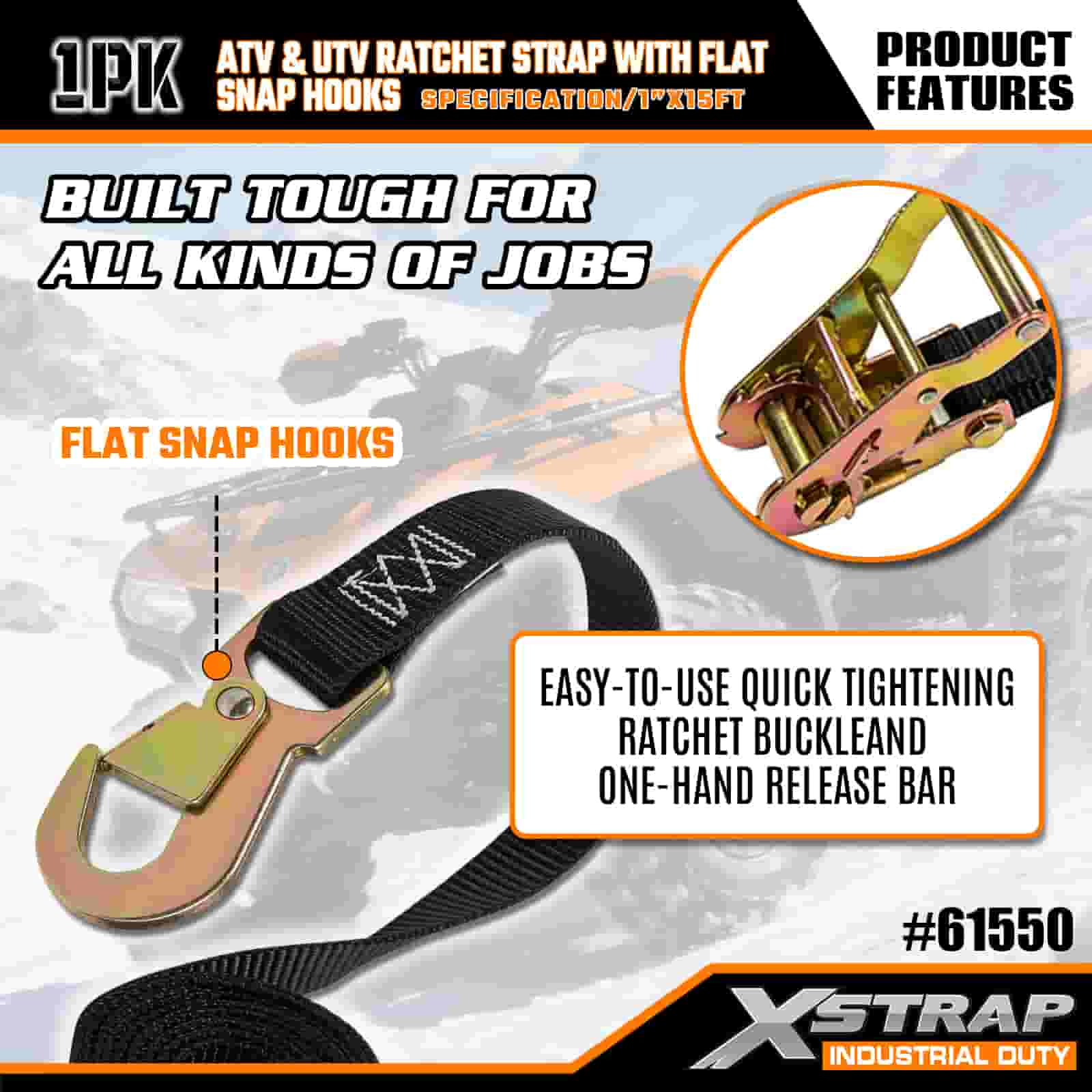 Xstrap ATV- och AUV-spärrrem med platta snäpphakar, 1" x 15' polyesterbindningsrem Spärrrem, 1000 pund kapacitet Lastsurrningssäkringsremmar med platt knäppning för släpvagn, plattbäddssläp, skidbåt, liten bil, tung utrustning.