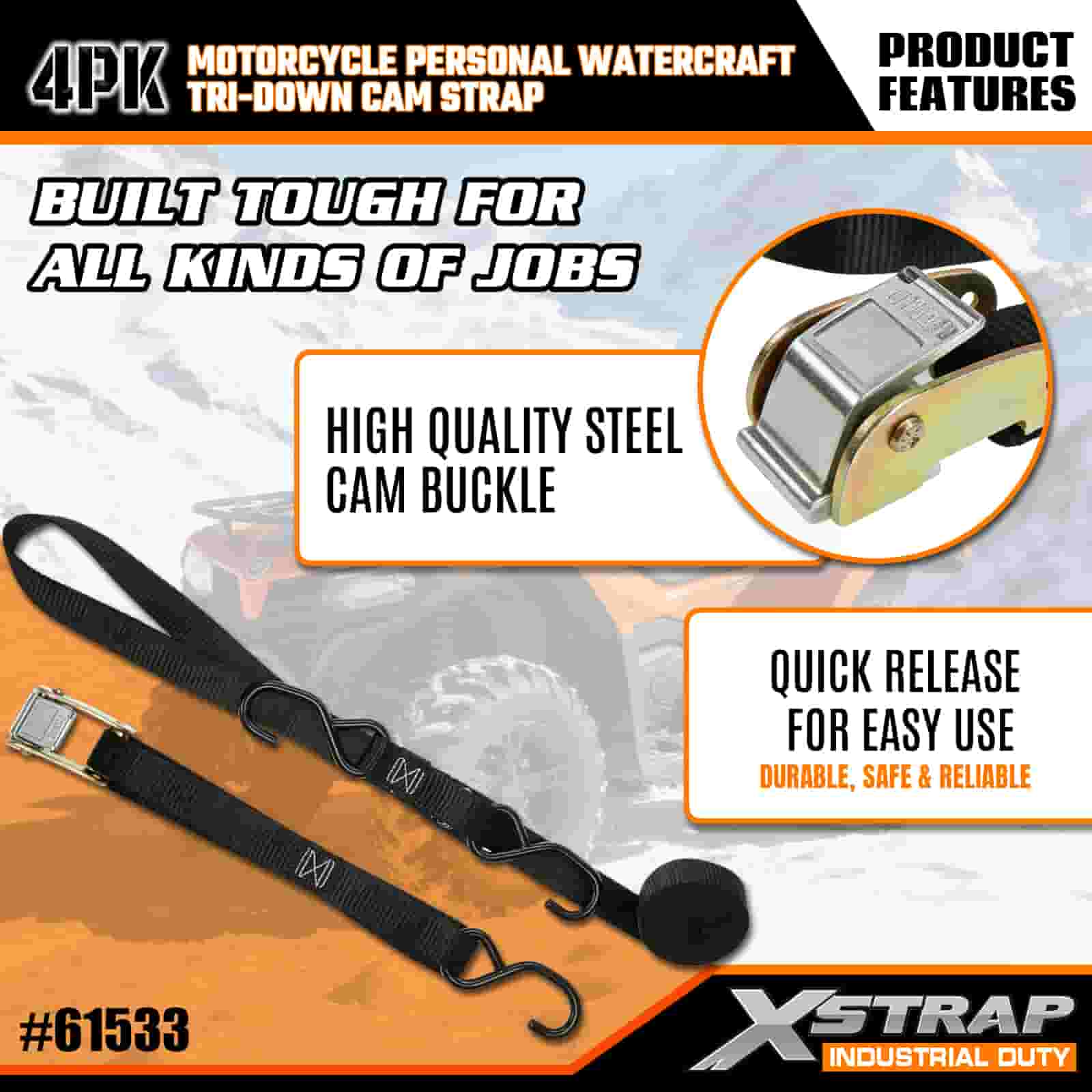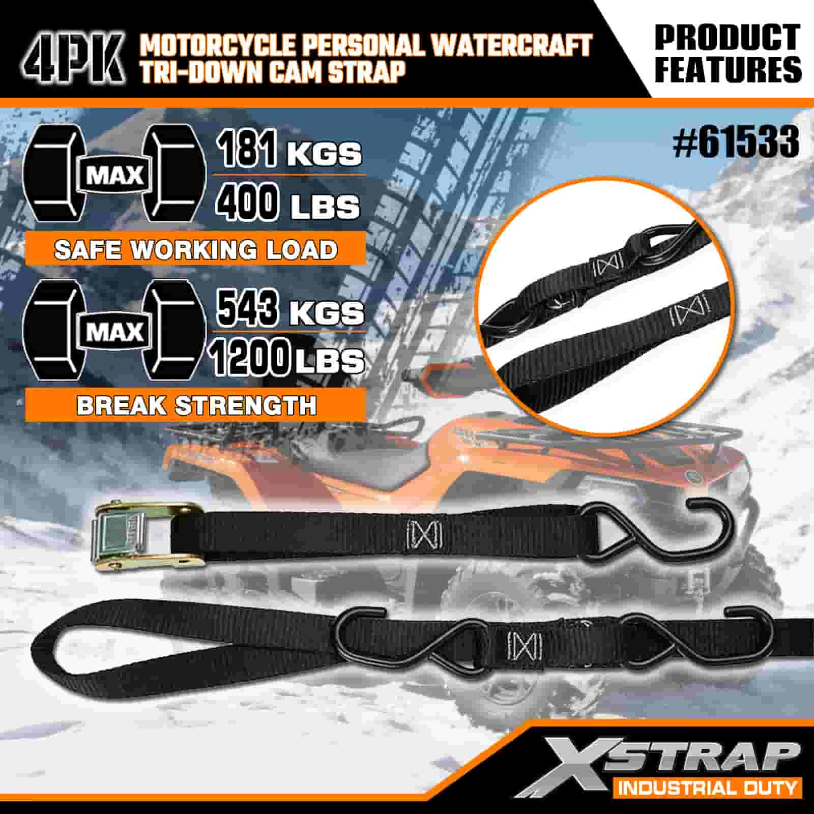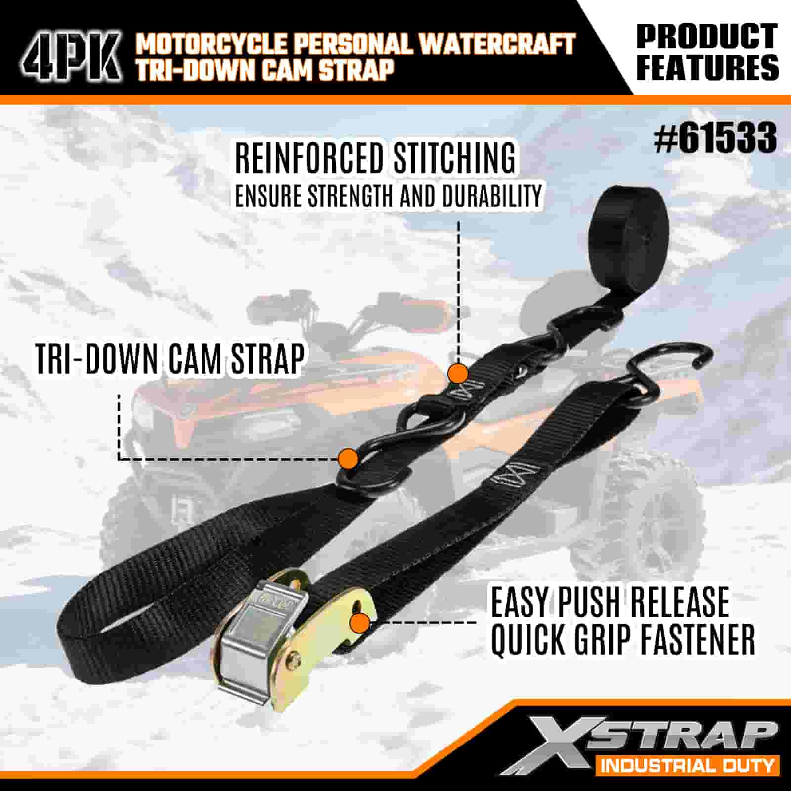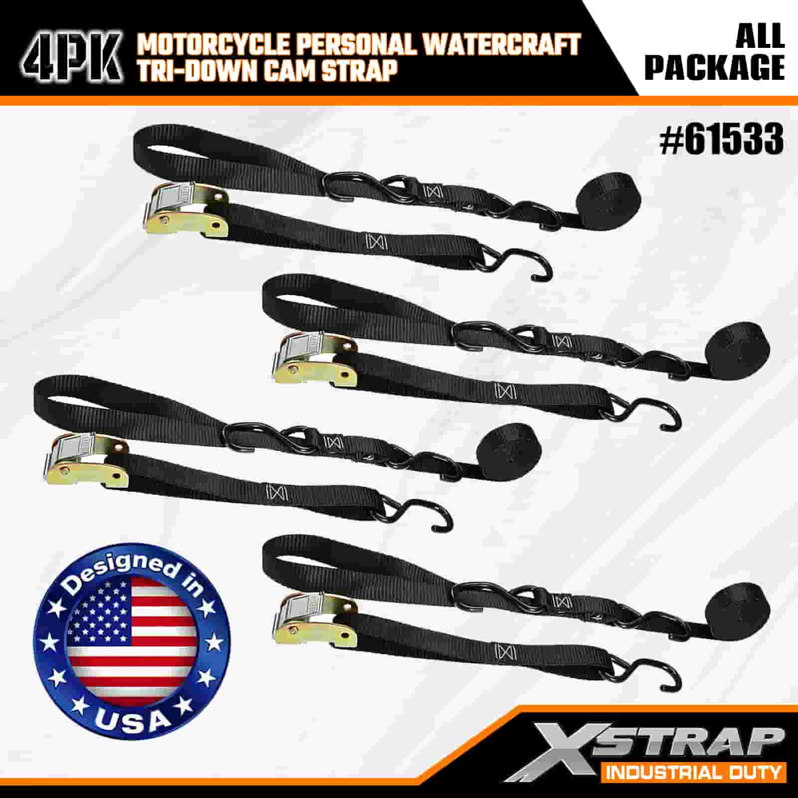 Xstrap 4PK Motorcykel Vattenskoter Tri-Down Cam Strap, 1" x 6" Polyester Tie Down Strap Dragspärrspänne, 400lbs Kapacitet Cargo Surrning Säkringsremmar med S-krokar för den seriösa proffsen för att säkra lastsläp, platt släp, skidbåt, liten bil.