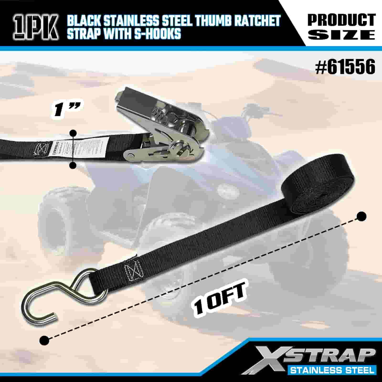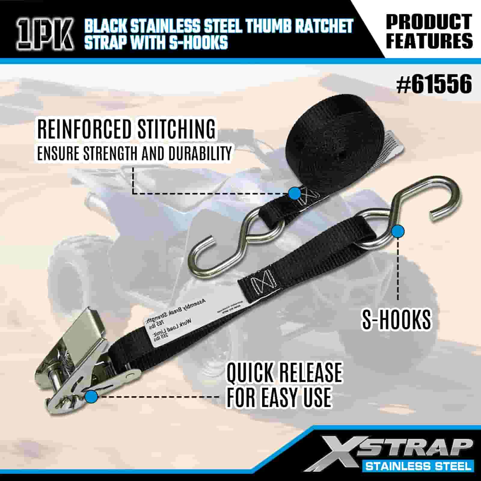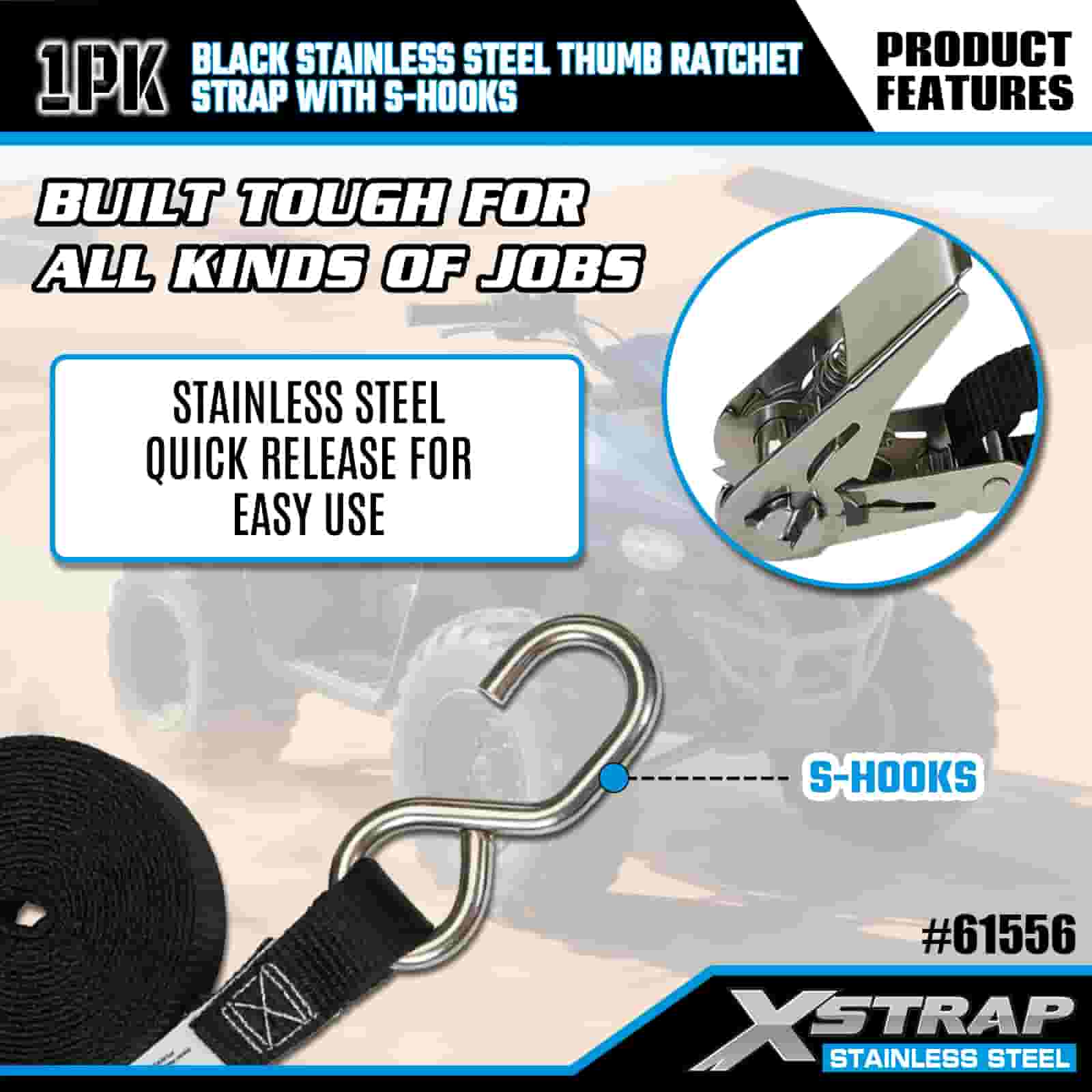 Xstrap svart tumspärr i rostfritt stål med S-krokar, 1 tum x 10″ polyesterbindningsrem Spärrrem, 255lbs Kapacitet Lastsurrningssäkringsremmar med S-krokar för släp, plattbäddssläp, skidbåt, liten bil, tung utrustning.