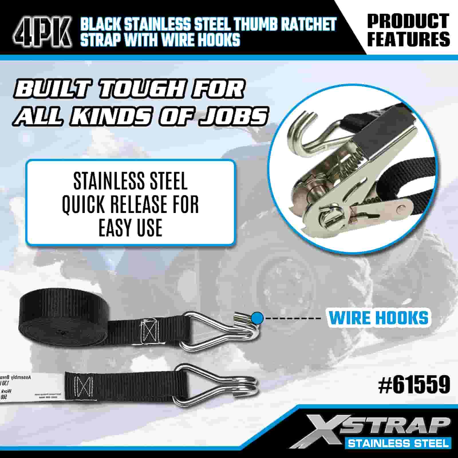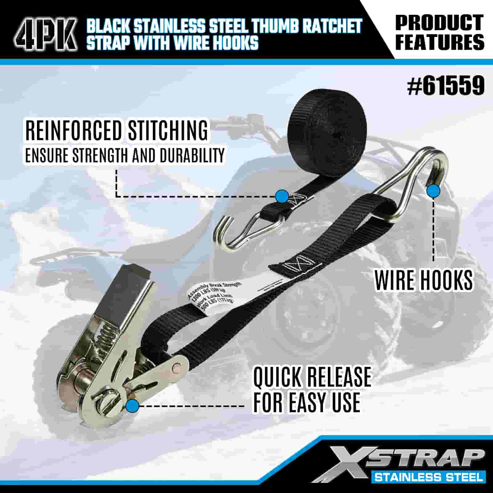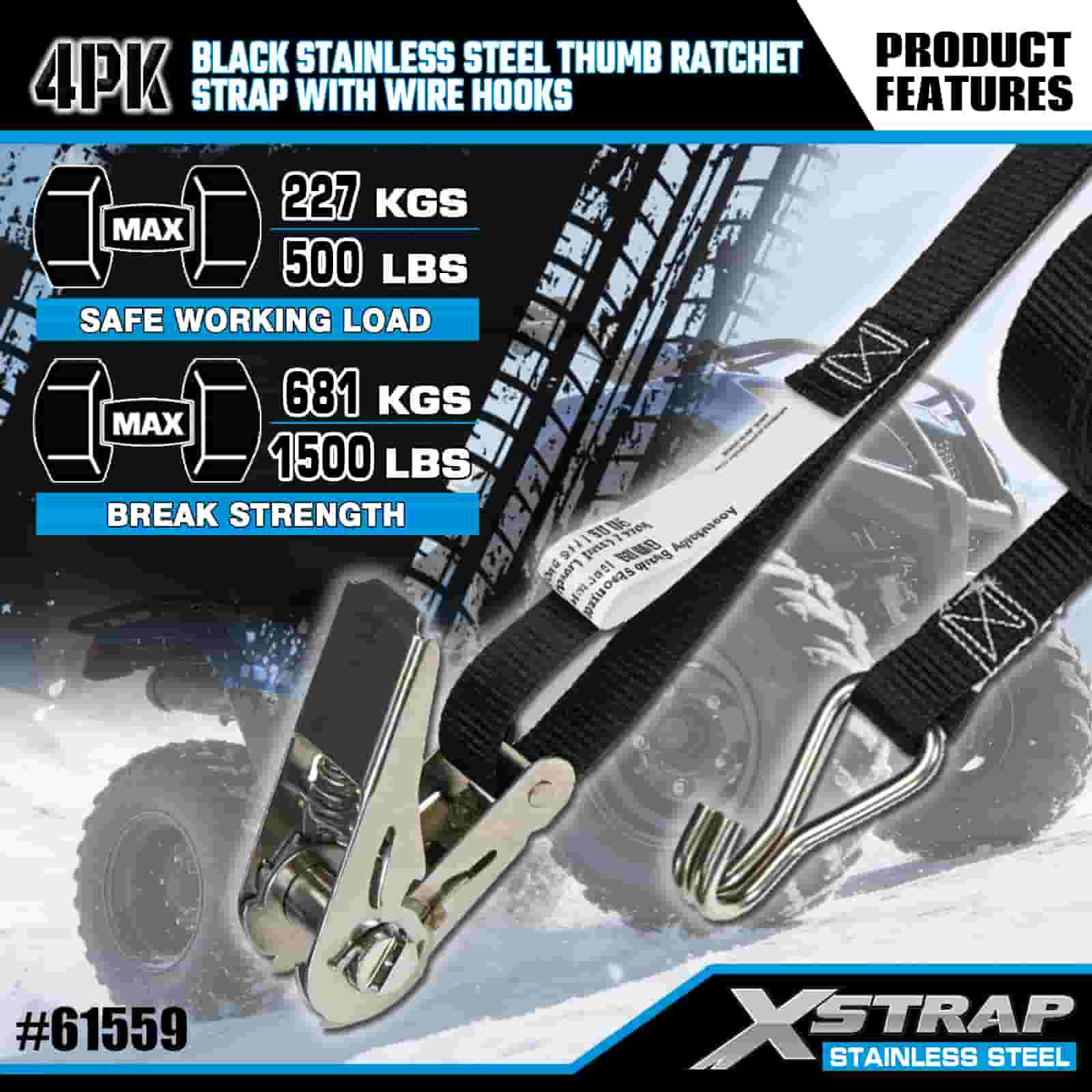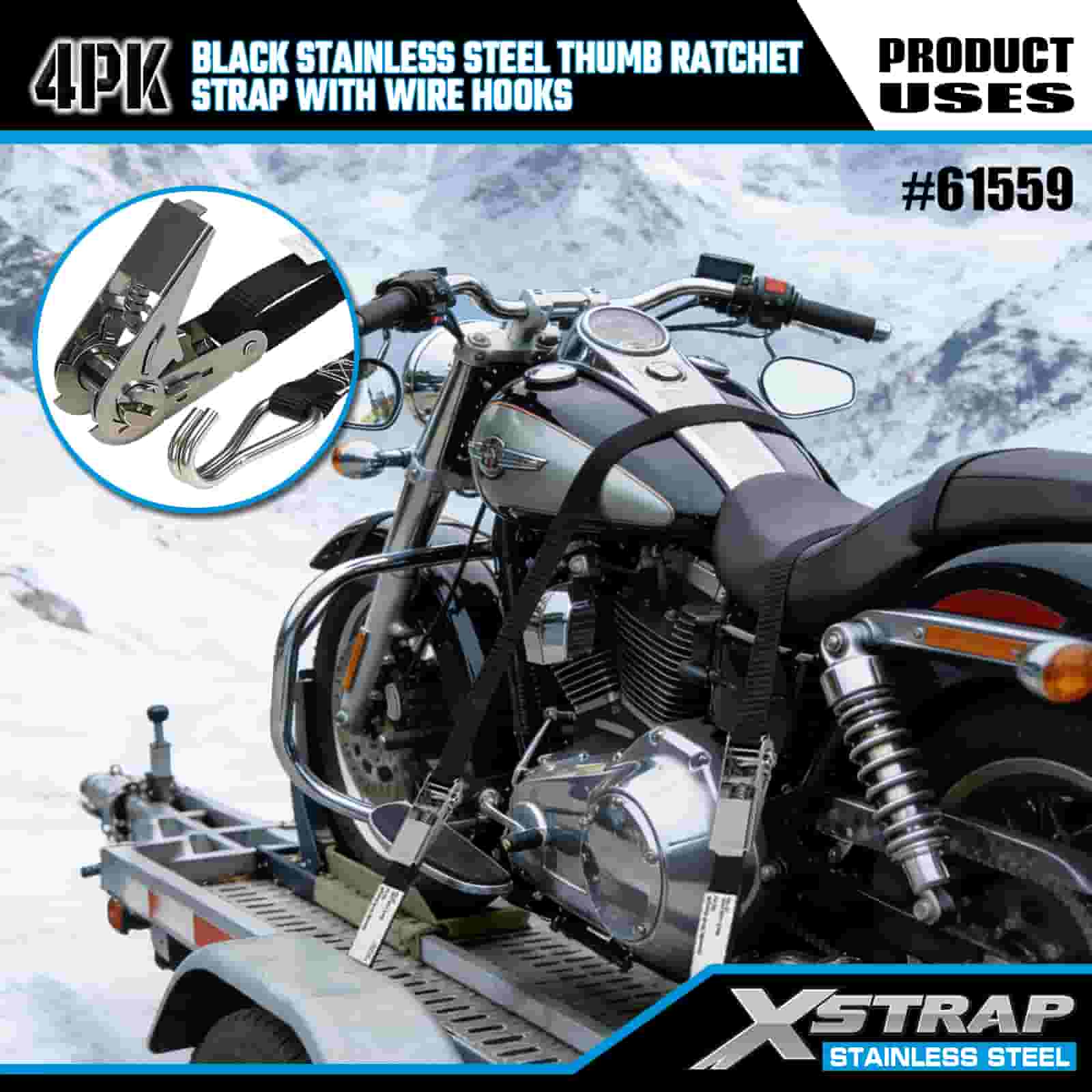 - Äventyr & industriell tuff, byggd för att prestera. Denna spärrrem i rostfritt stål är konstruerad för både terrängtransport av motorcyklar och tunga arbetsplatser, byggd för att hantera lera, snö och dagligt slitage. Lita på XStraps 20 år av lastkontrollexpertis för ett lastrum du kan lita på, oavsett terräng.
