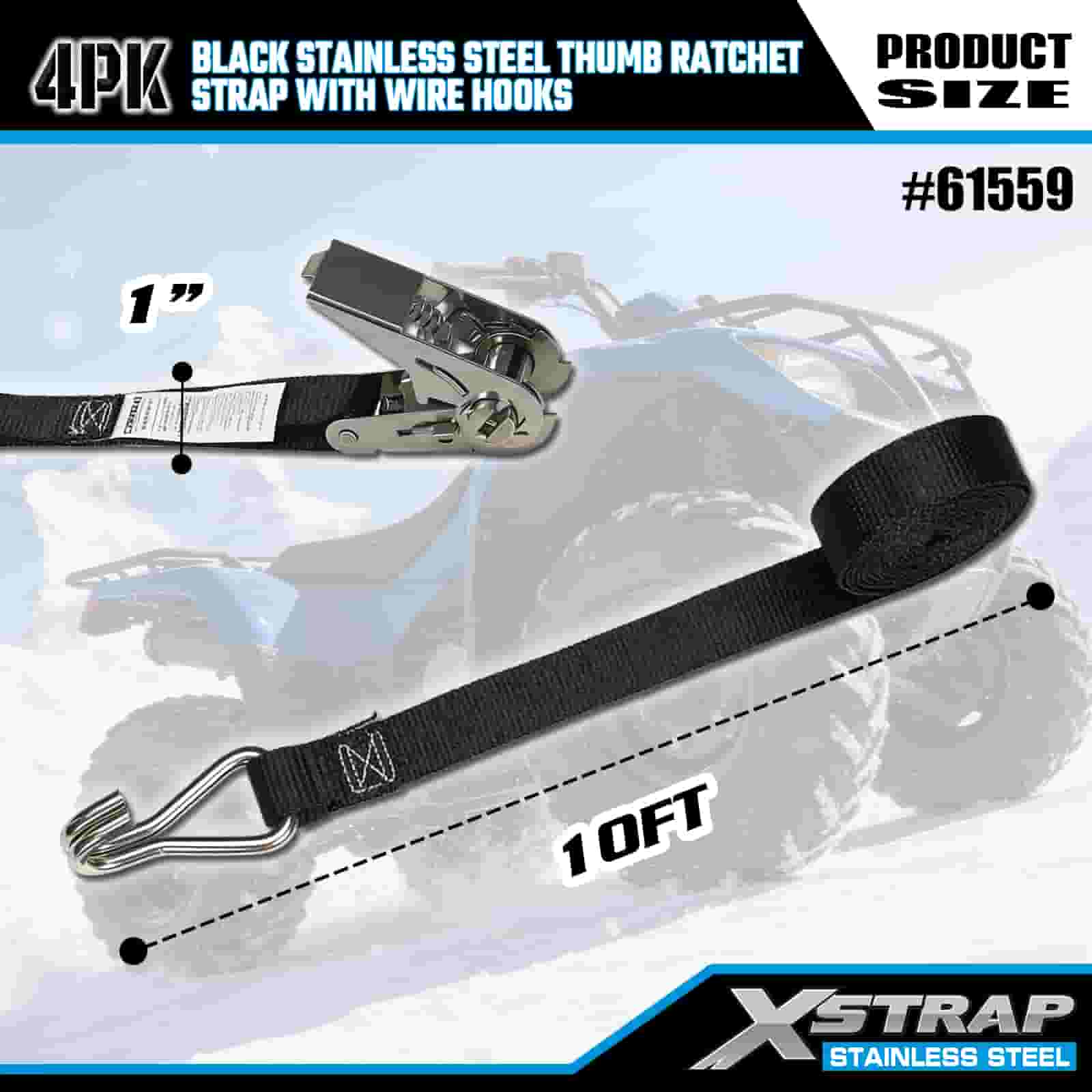 Xstrap 4PK svart tumspärr i rostfritt stål med trådkrokar, 1" x 10" polyesterbindningsrem Spärrrem, 500lbs Kapacitet Lastsurrning Säkringsremmar med trådkrokar för släpvagn, plattbäddssläp, skidbåt, liten bil, tung utrustning.