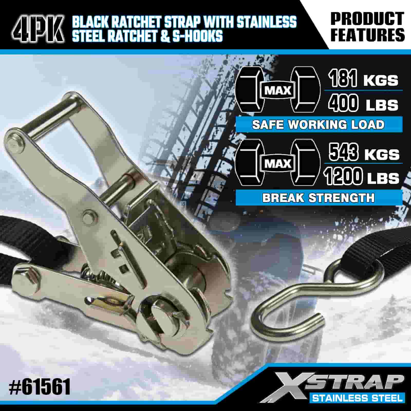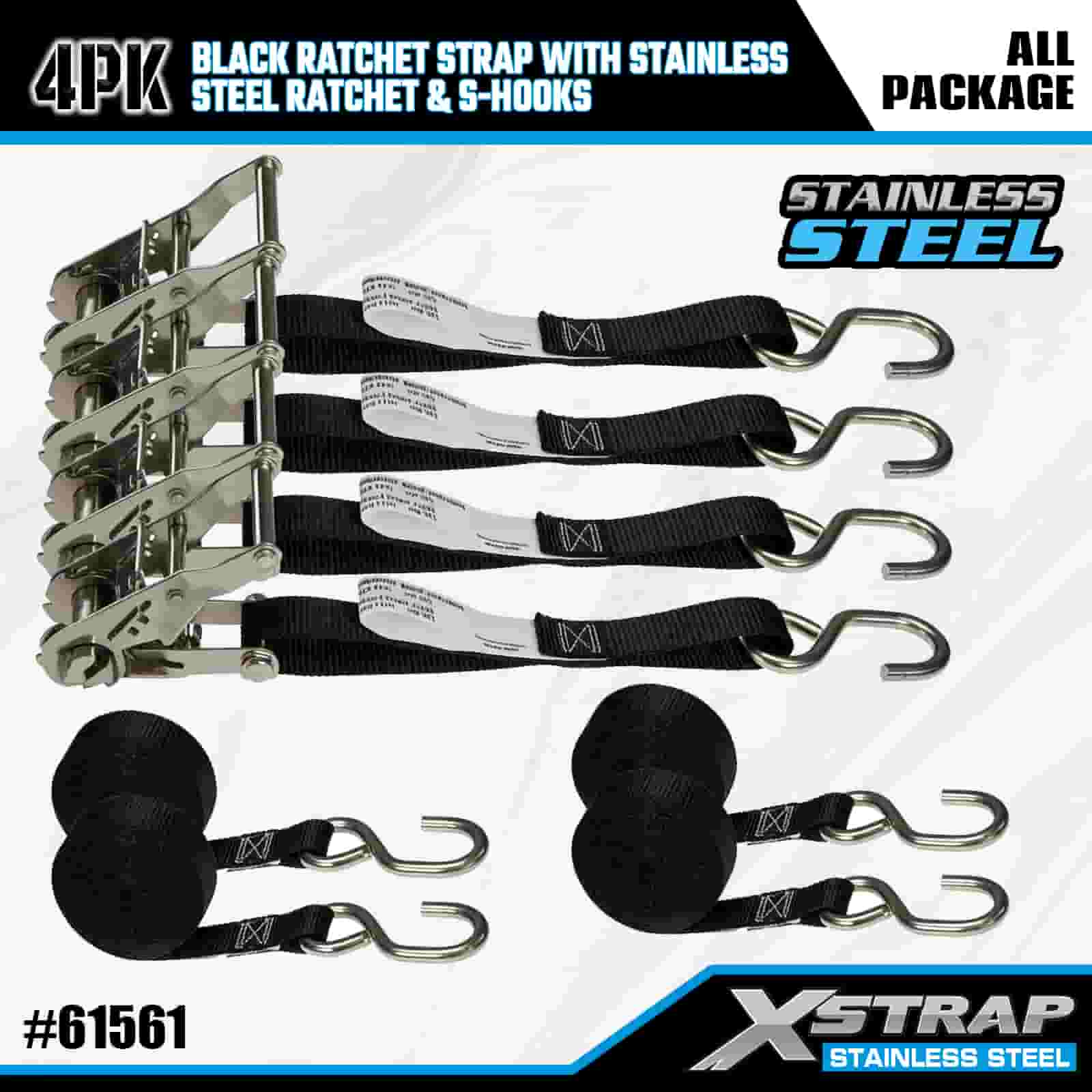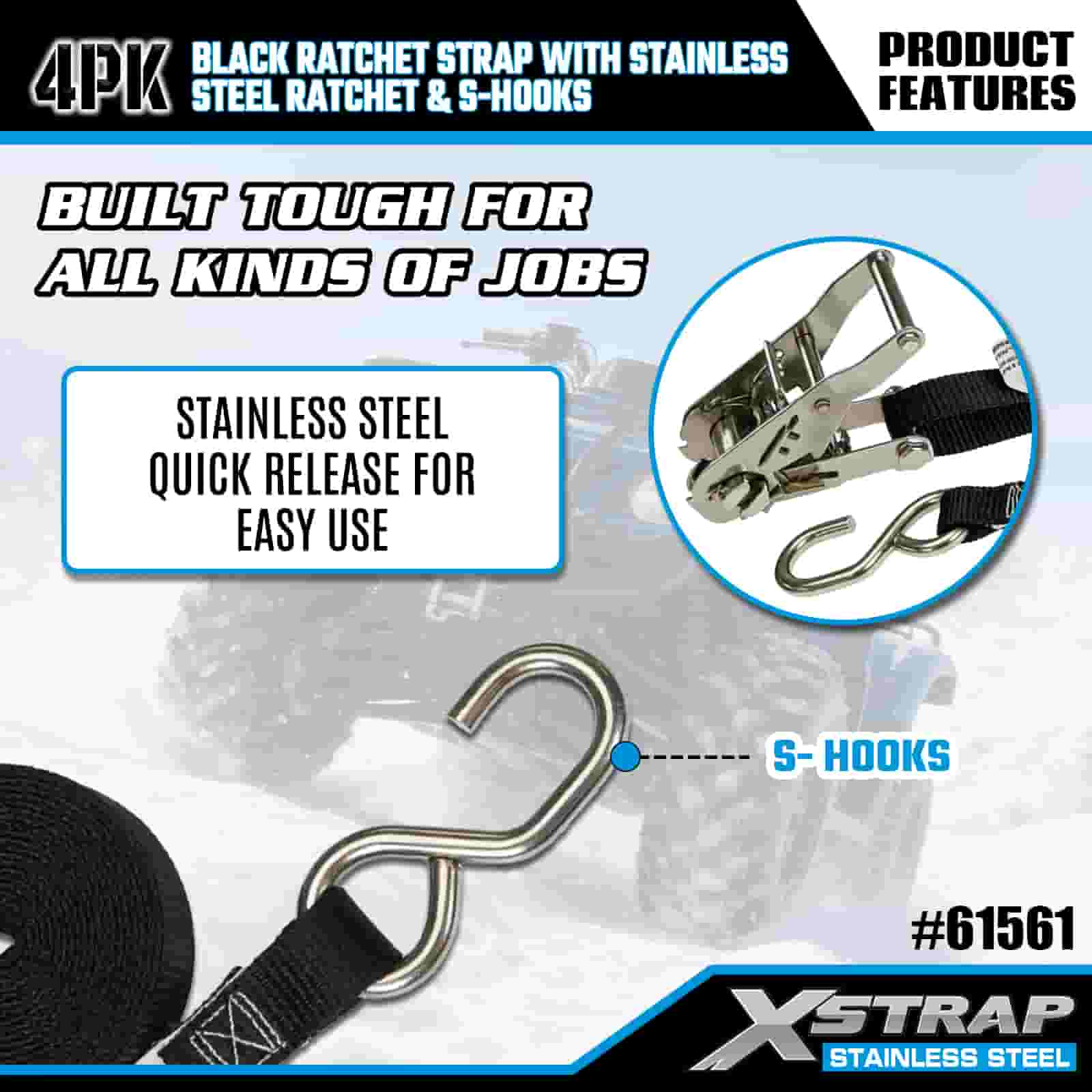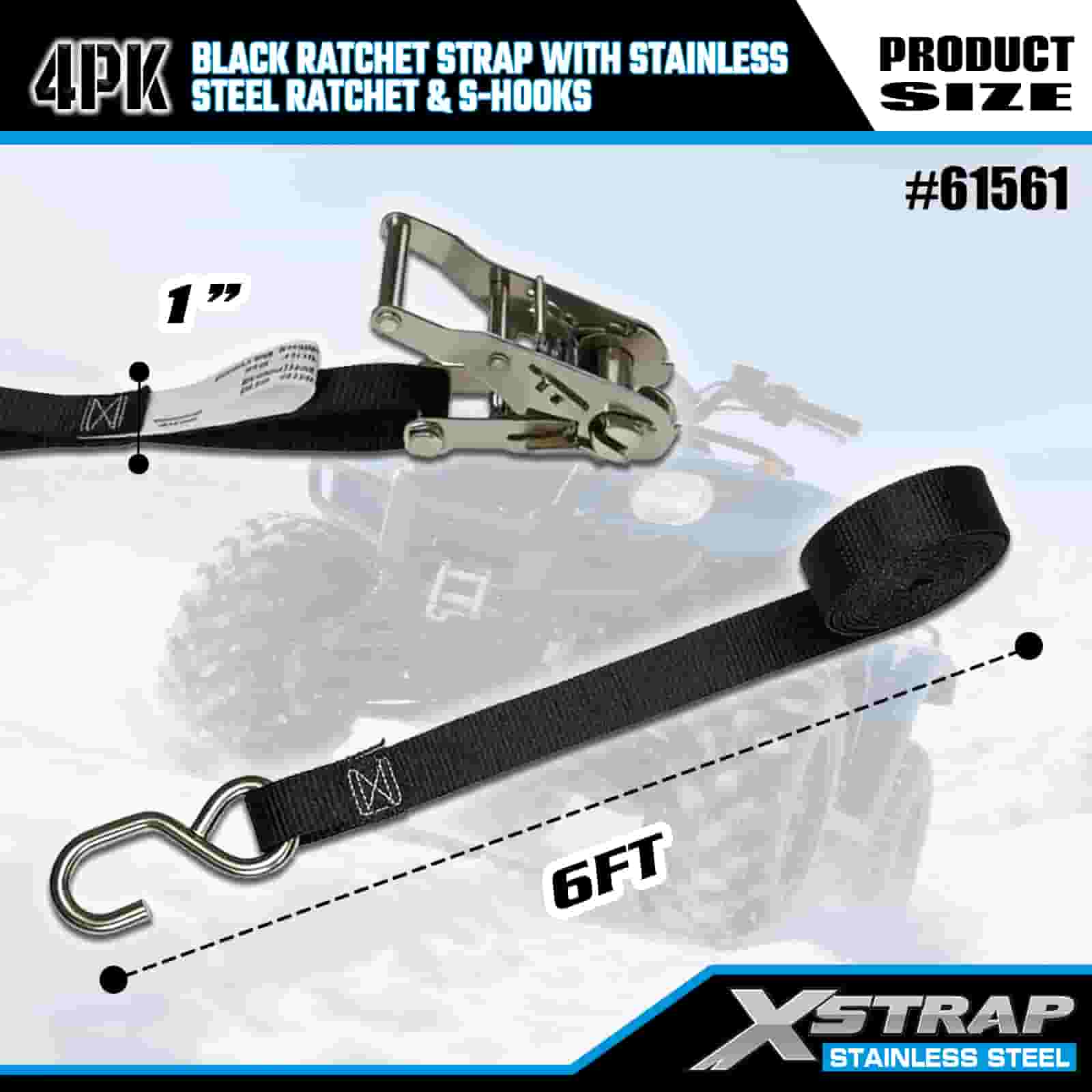 Xstrap 4PK Svart Ratchet Strap med Rostfri Steel Ratchet och S-krokar, 1” x 6″ Polyester Tie Down Ratchet Strap, 400lbs Kapacitet Cargo Surrning Säkringsremmar med S-krokar för släp, plattbäddssläp, skidbåt, liten bil, tung utrustning.
