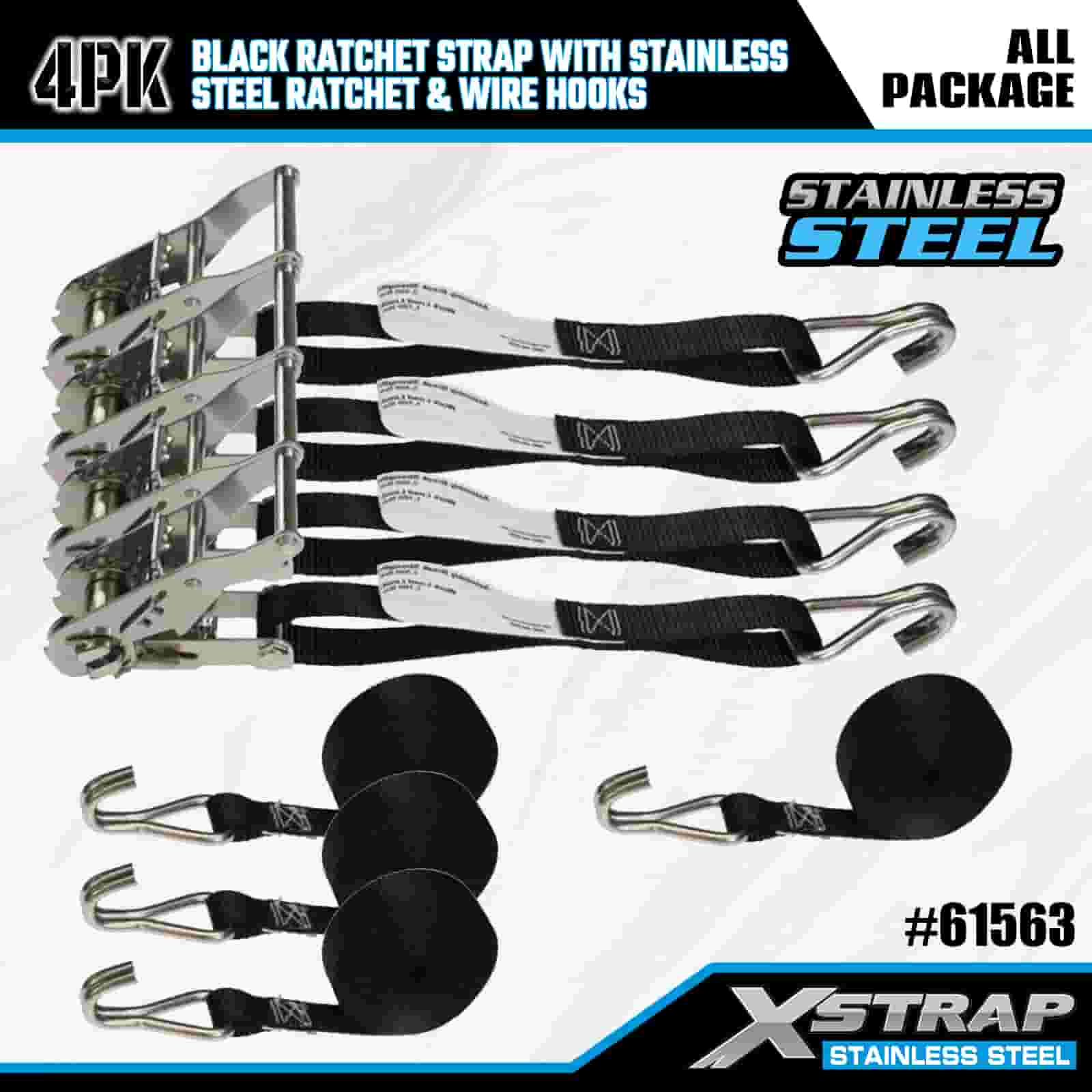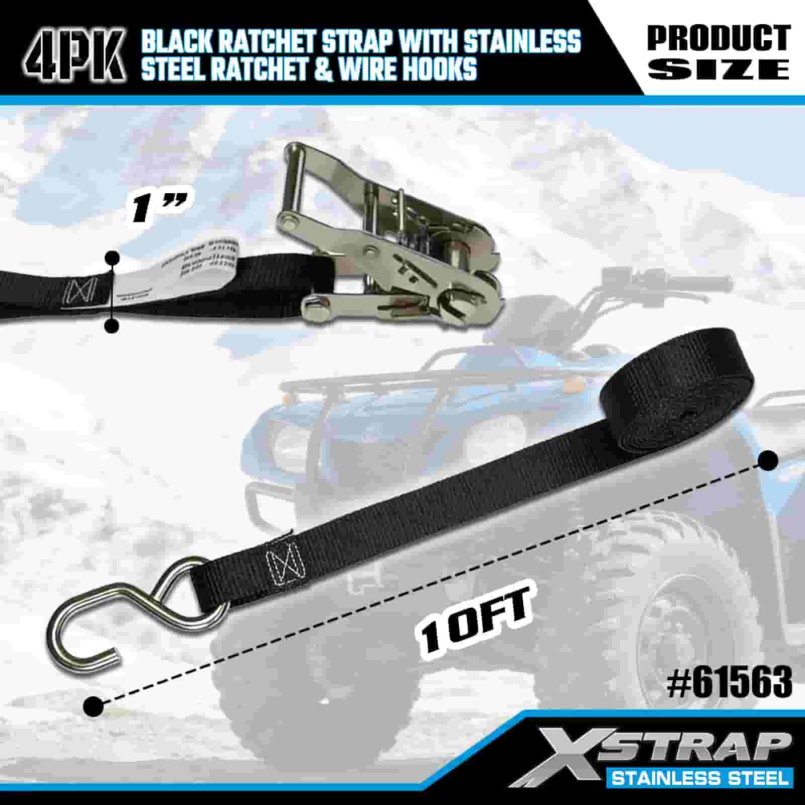 Xstrap 4PK svart spärrrem med spärrhakar i rostfritt stål och trådkrokar, 1" x 10" polyesterbindningsrem Spärrrem, 1000lbs Kapacitet Lastsurrning Säkringsremmar med trådkrokar för släp, platt släp, skidbåt, liten bil, tung utrustning.