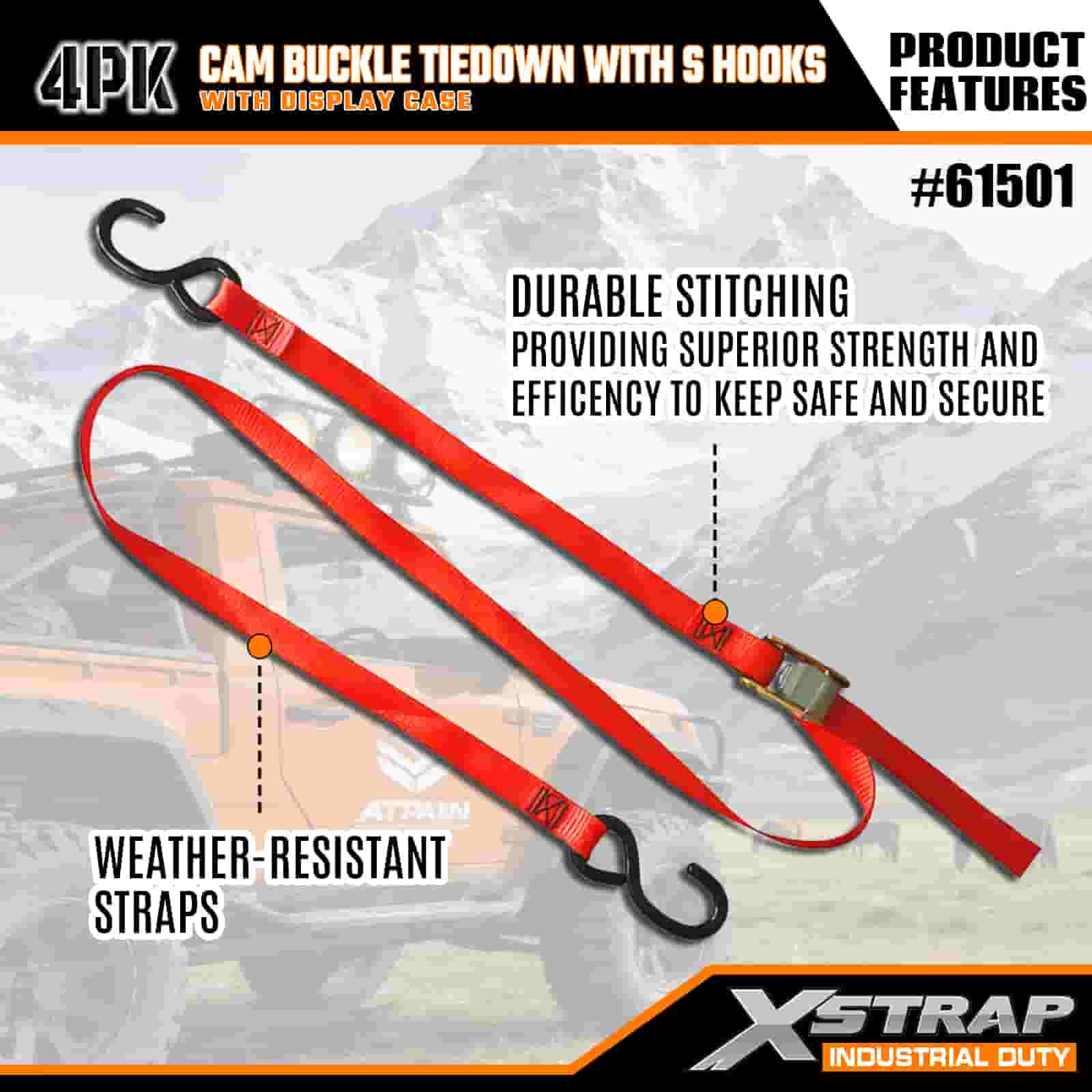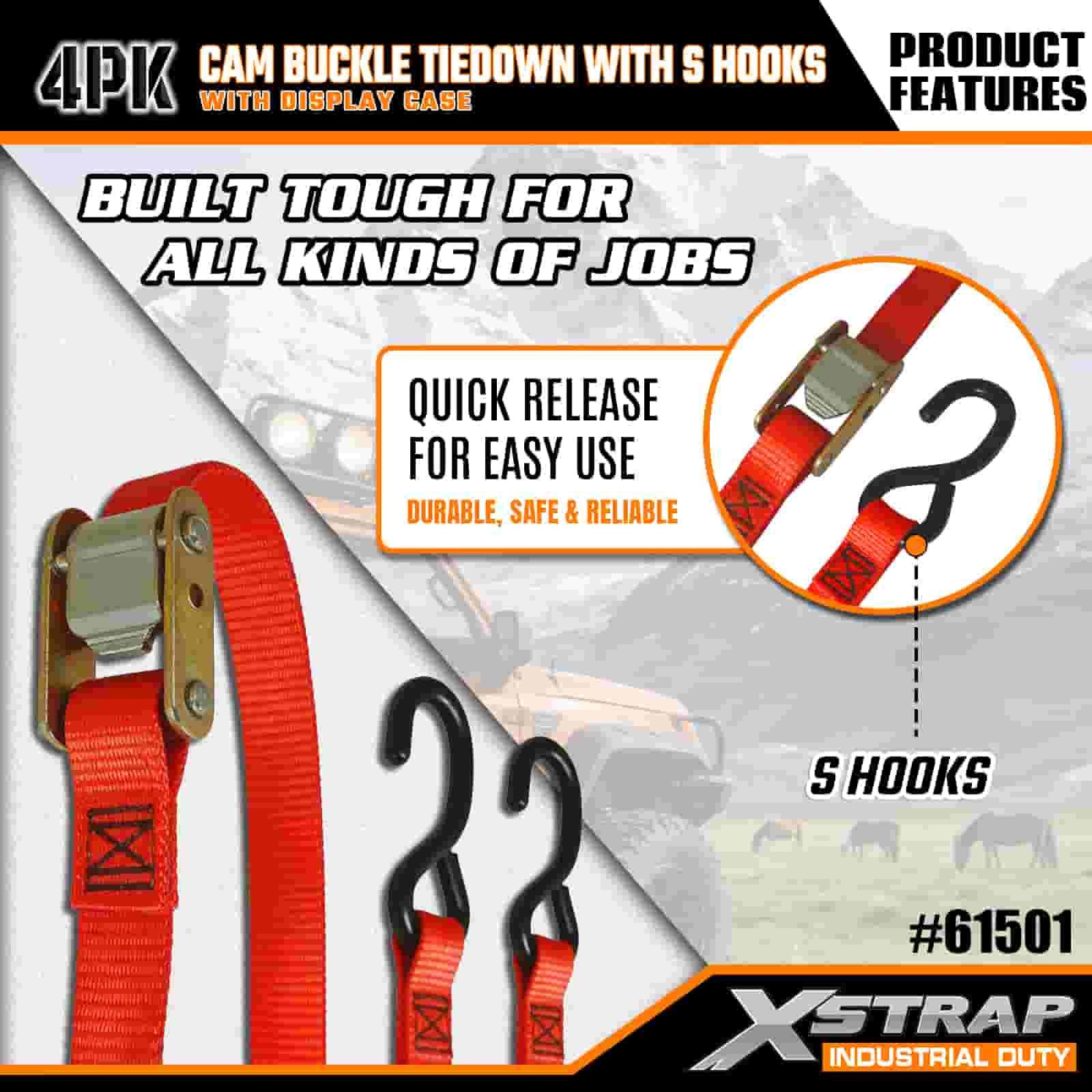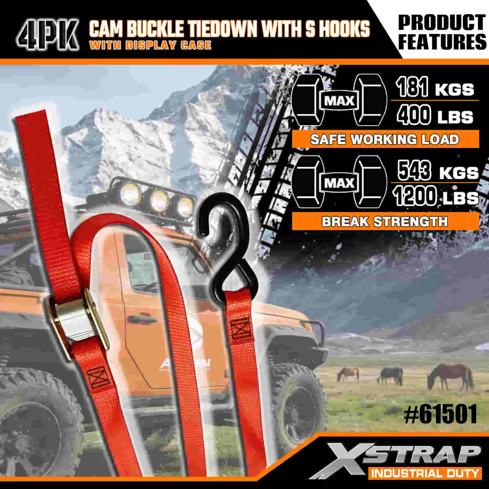 Xstrap 4-pack Cam Buckle Tie Down med S-krokar, 2” x 6” Polyester Tie Down-rem med Cam-spänne, 400lbs Kapacitet Cargo Surrning Säkringsremmar med S-krokar för den seriösa proffsen för att säkra lastsläp, platt släp, skidbåt, liten bil.