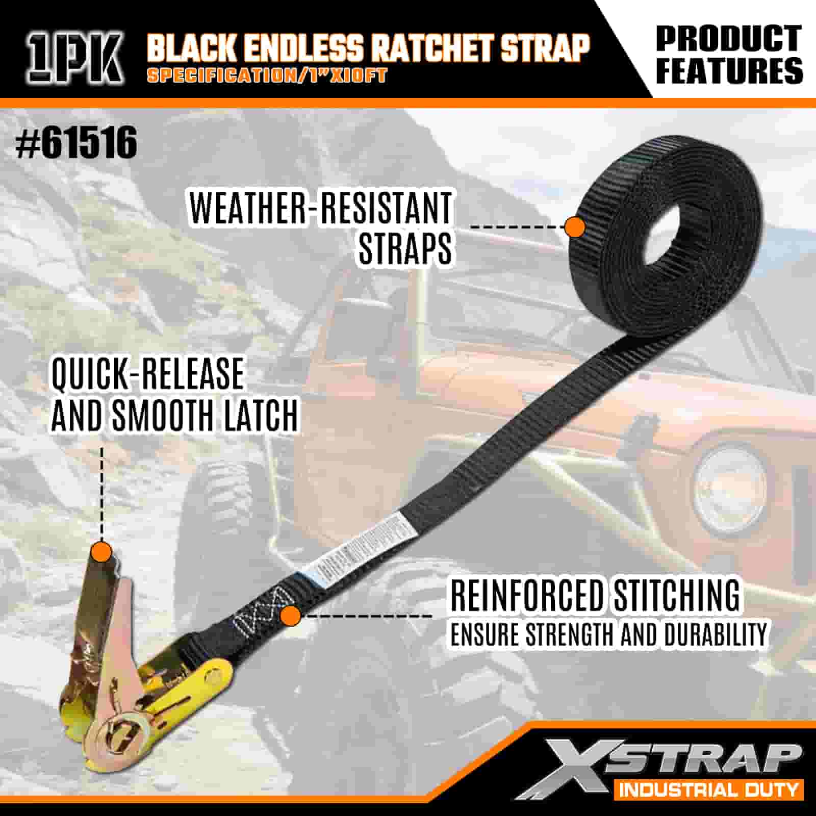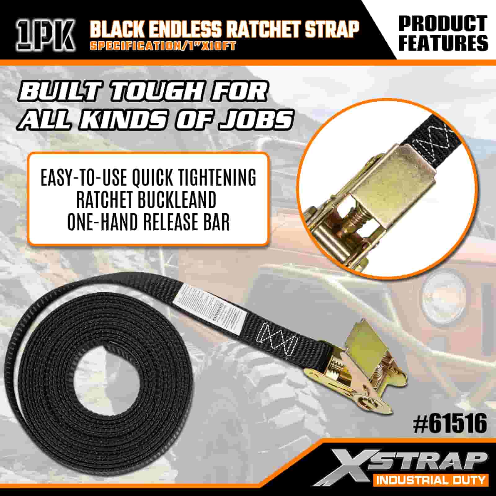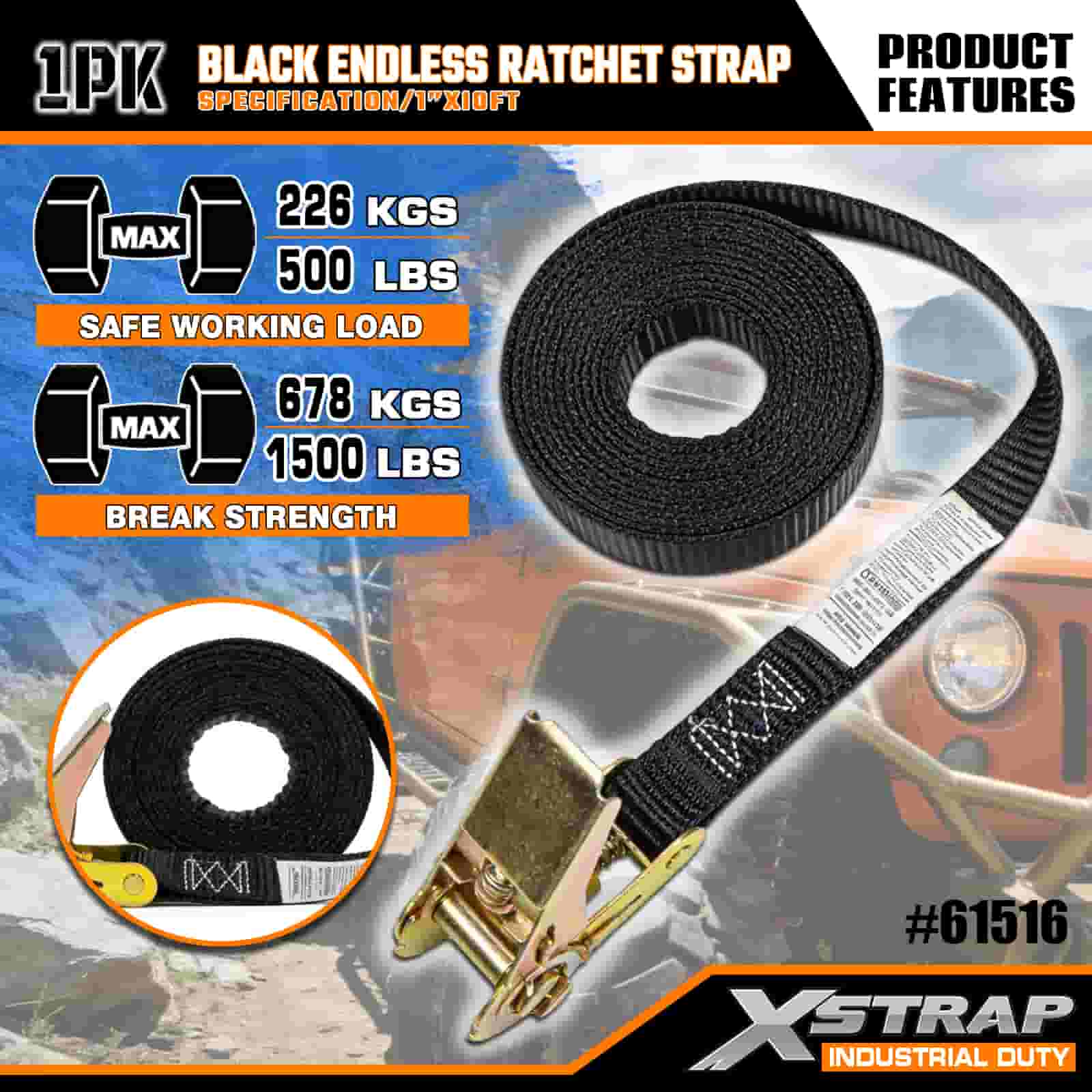 Xstrap Svart Ändlös spärrrem, 1" x 10" Polyester Tie Down Strap Drag Ratchet Strap, 500lbs Kapacitet Cargo Surrning Säkringsremmar för den seriösa proffsen för att säkra lastsläp, platt släp, skidbåt, liten bil.