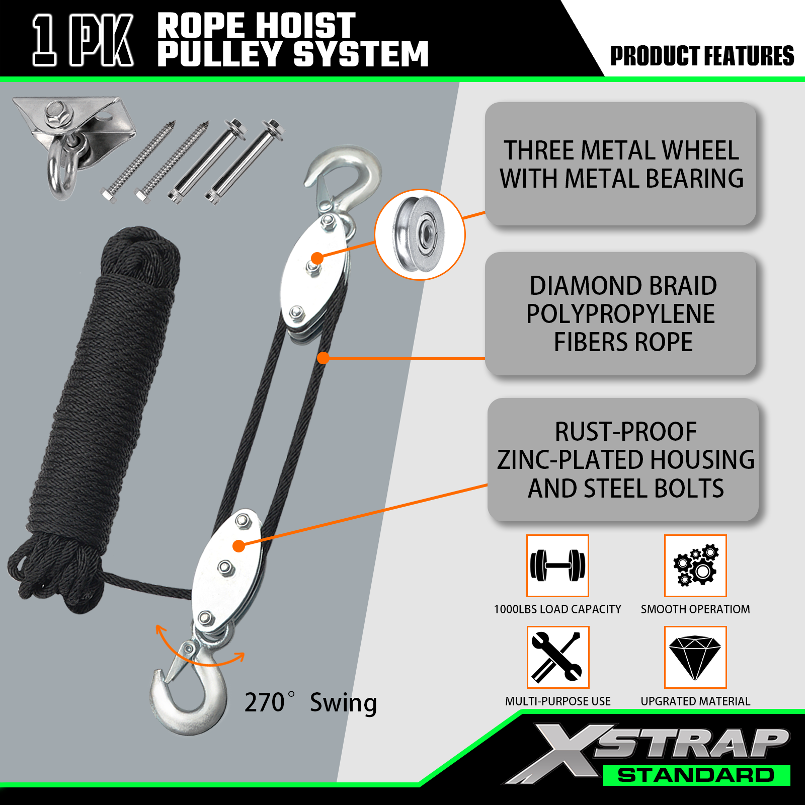 Detta är vårt XSTRAP STANDARD 50 fots reptelfer, kraftigt 2000LB hjulblock och redskapsremskivasystem för att lyfta tunga föremål med arbetshandskar, 2 st mjuka öglor, 1 svänghängare för garagelager.