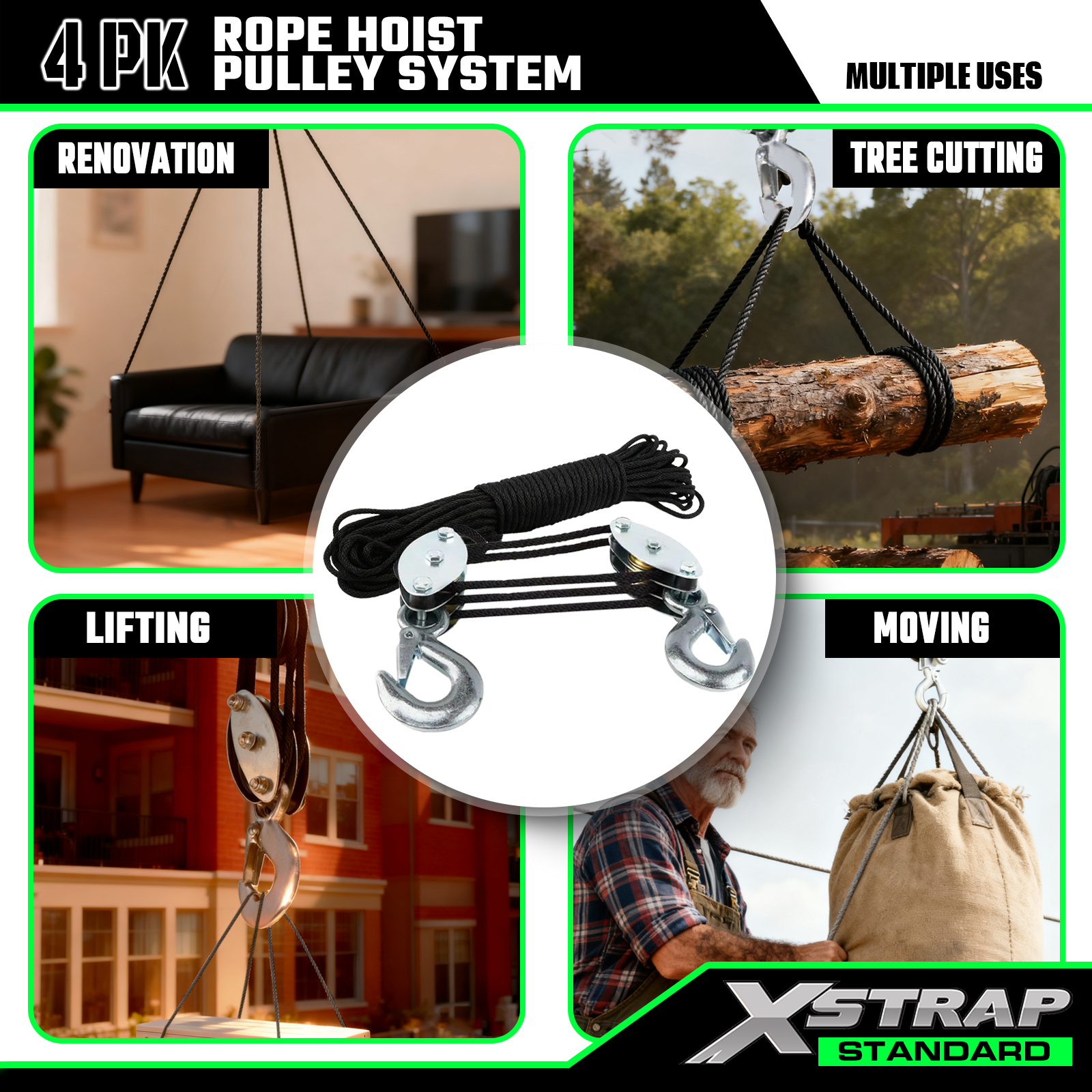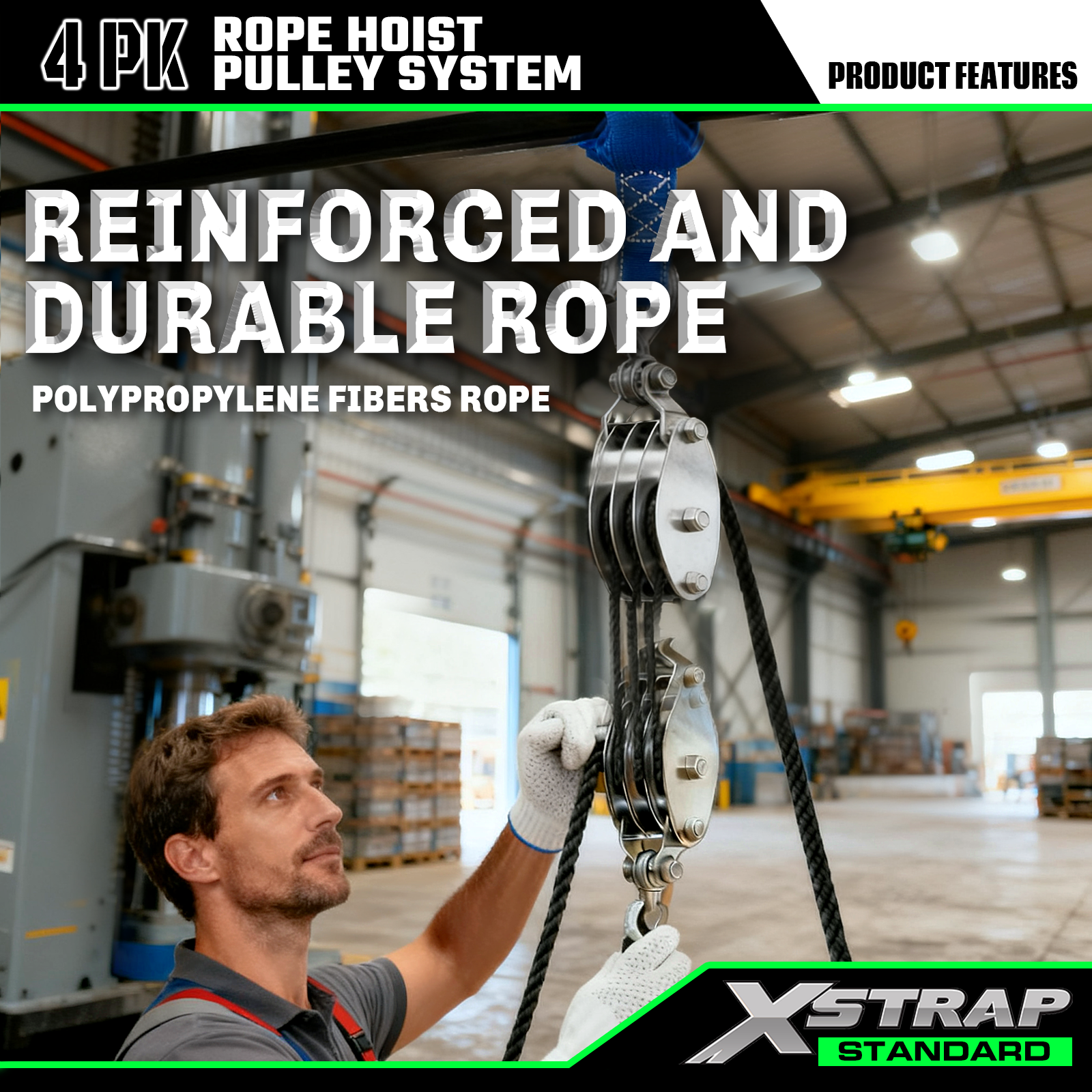 Detta är Xstrap Standard Rope Hoist Pulley System. Kapaciteten är 1000 pund, brottstyrkan är 2000 pund. 5:1 Lifting Power 50ft Heavy Duty Pulley Block för jakt, lyft av tunga föremål med halkskyddade arbetshandskar, 2st mjuka öglor.