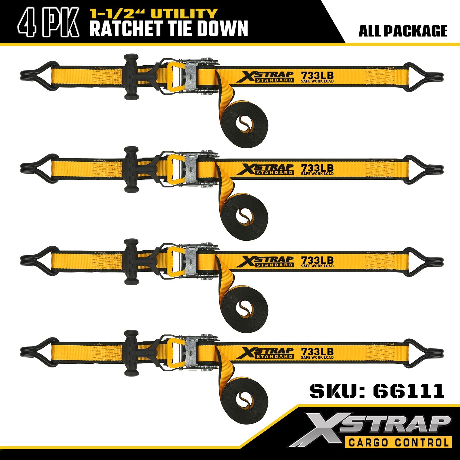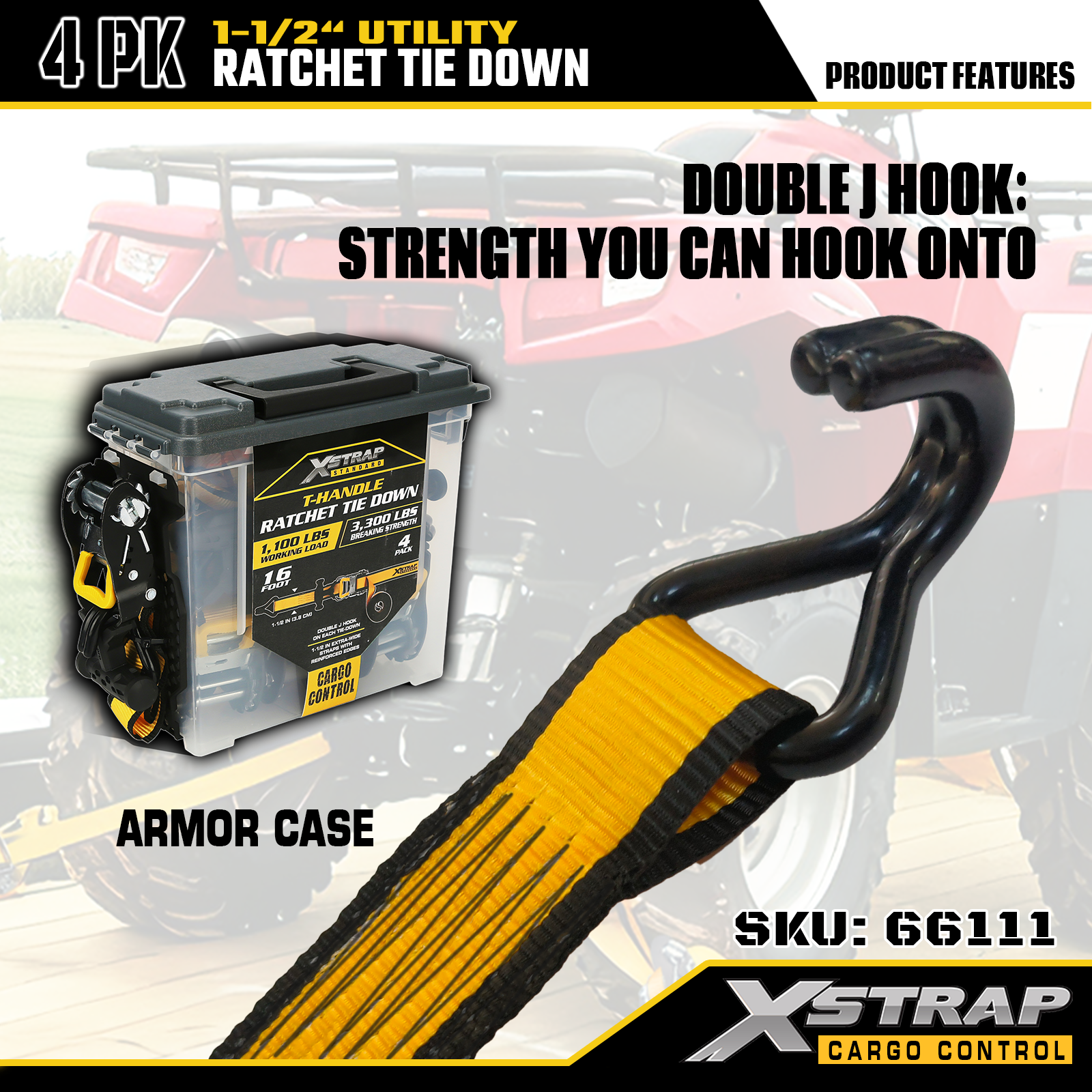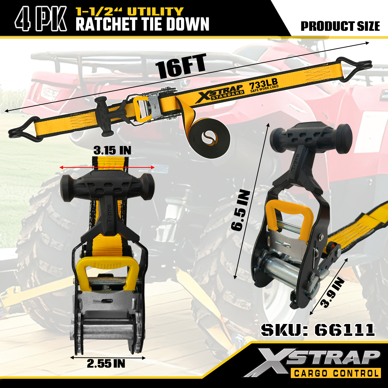 Xstrap T-Handle Ratchet Tie Down är 1,5 tum x 16 fot, den säkra arbetsbelastningen är 1 100 pund och brotthållfastheten är 3 300 pund.