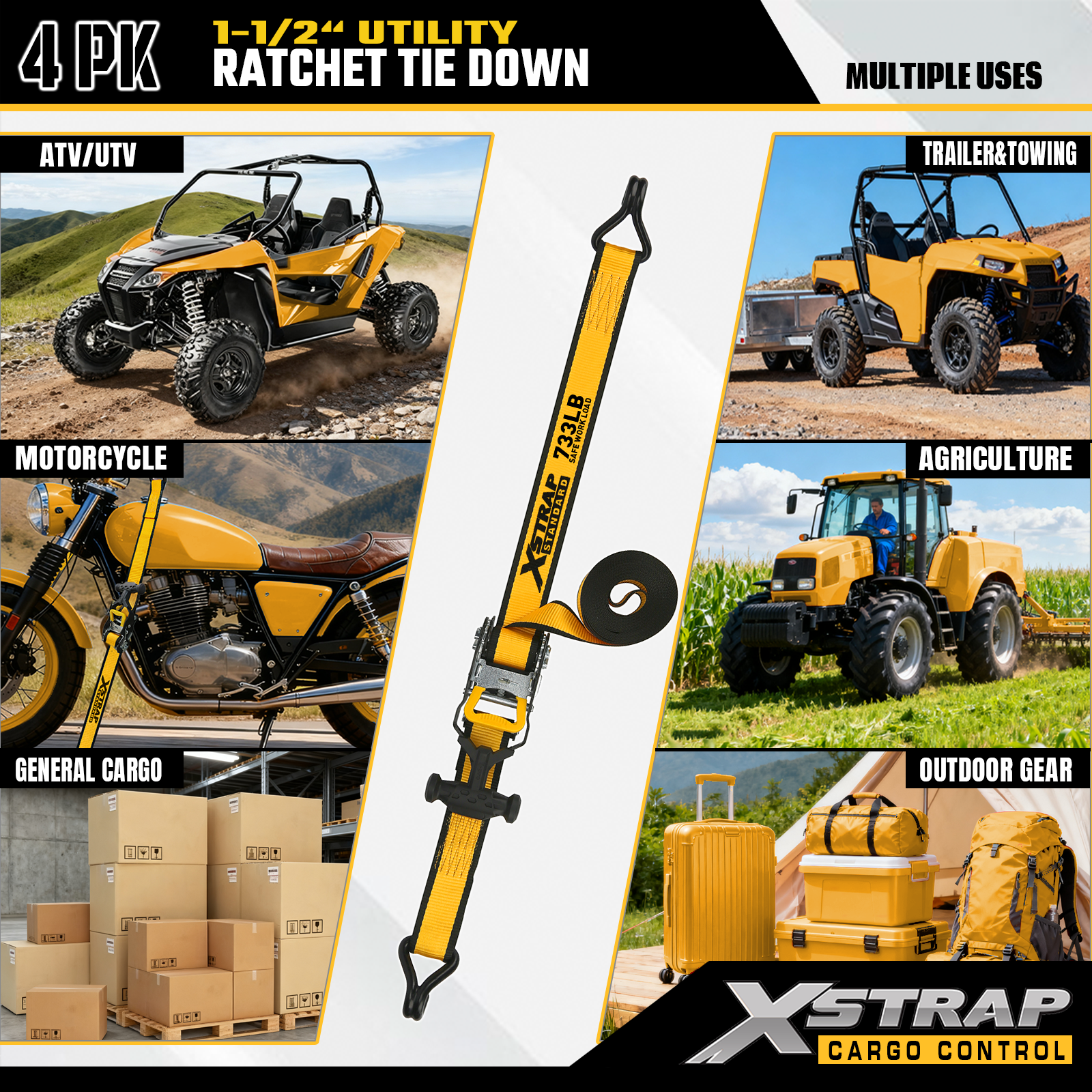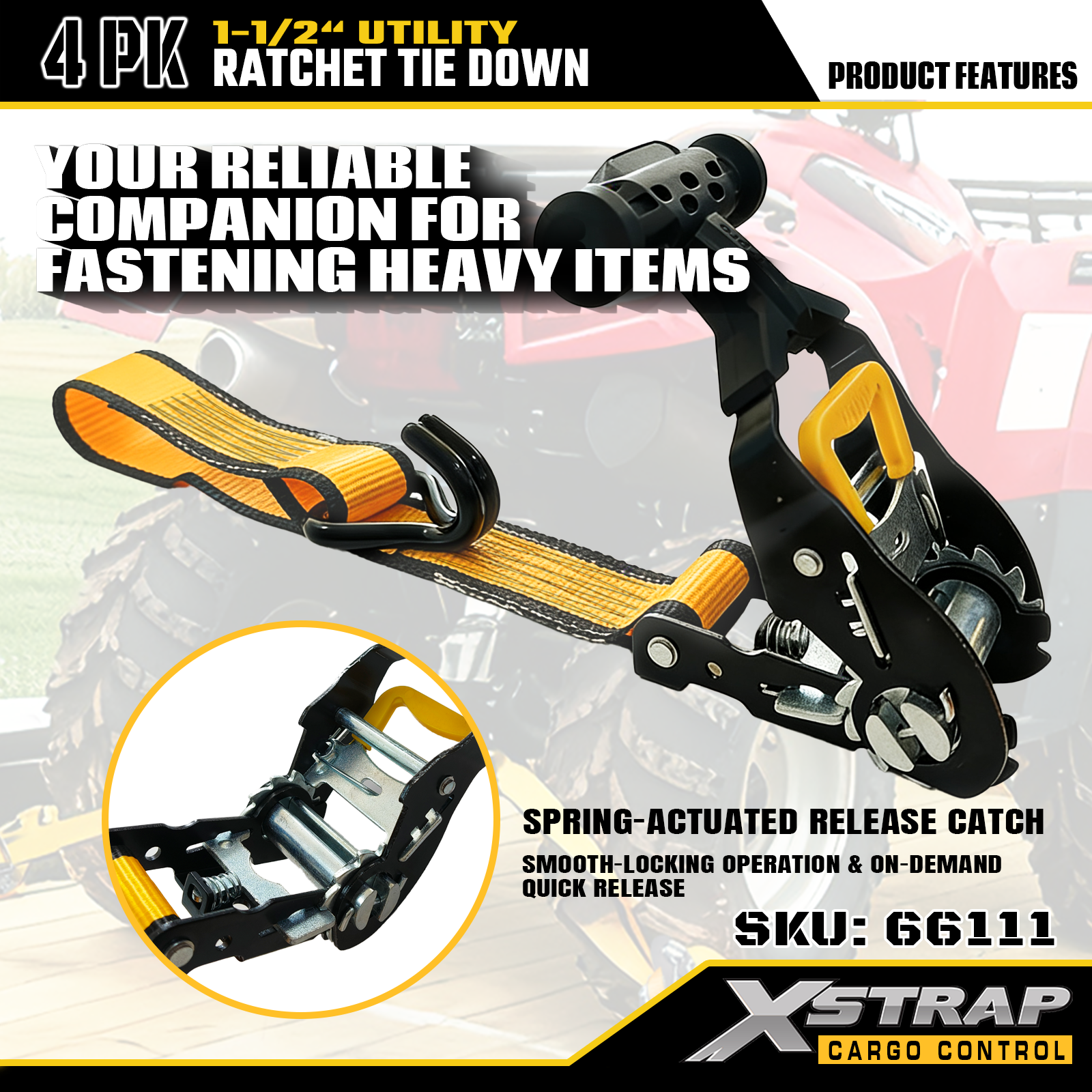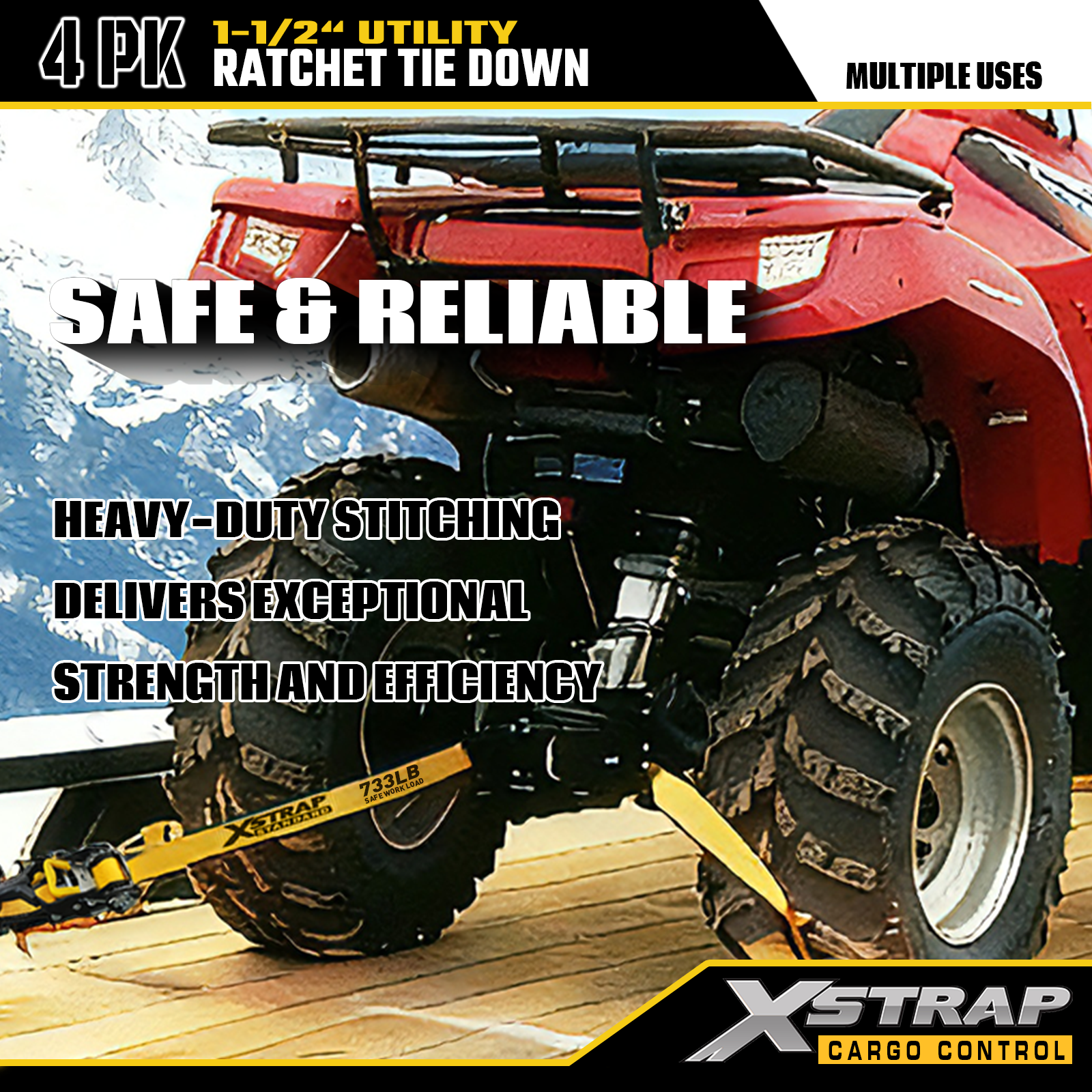 Xstrap T-Handle Ratchet Tie Down är 1,5 tum x 16 fot, den säkra arbetsbelastningen är 1 100 pund och brotthållfastheten är 3 300 pund.