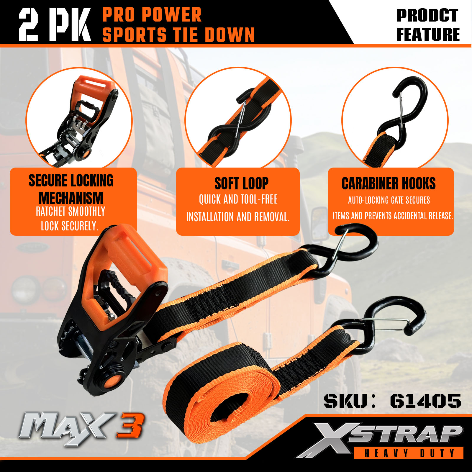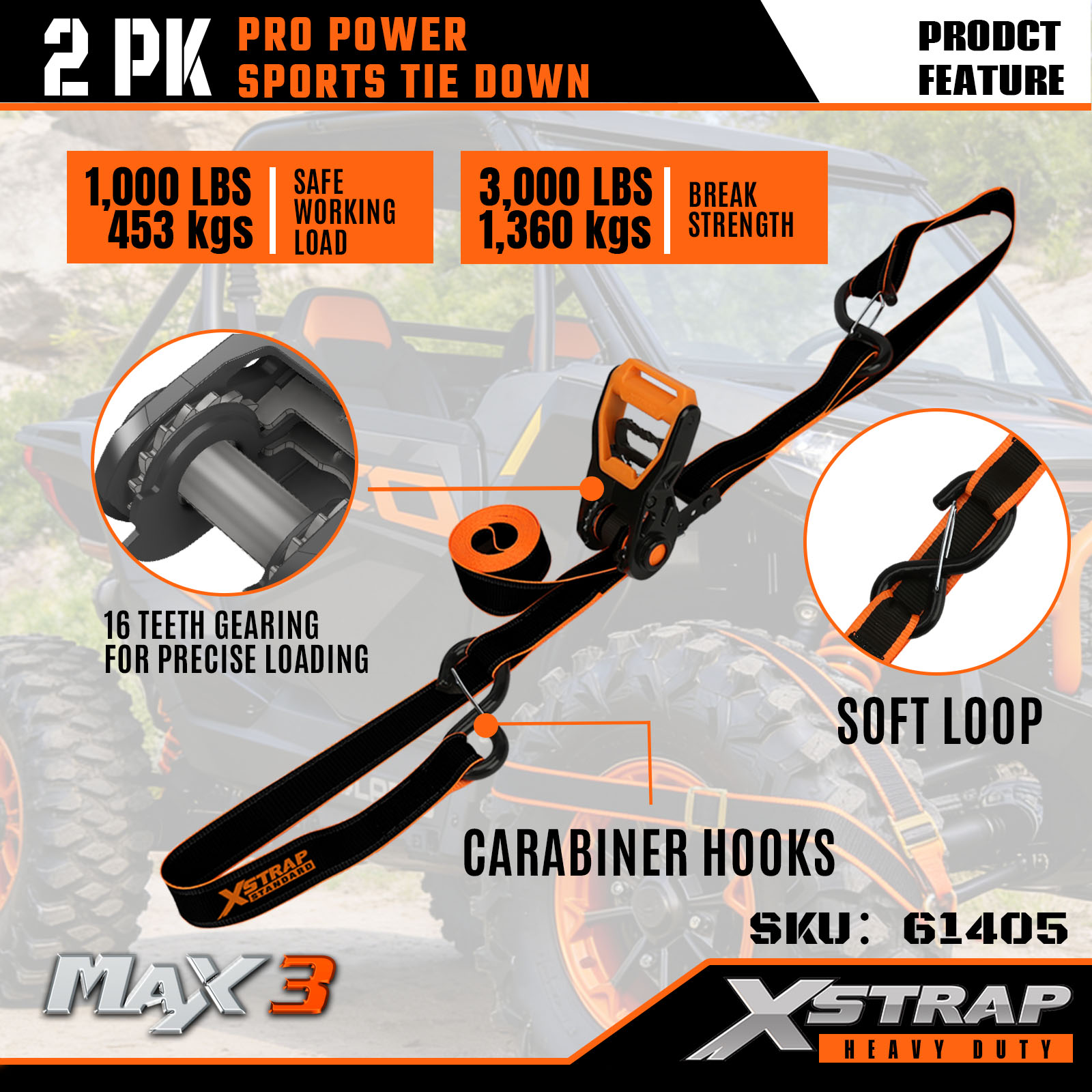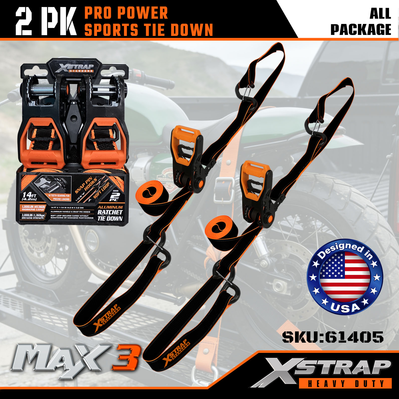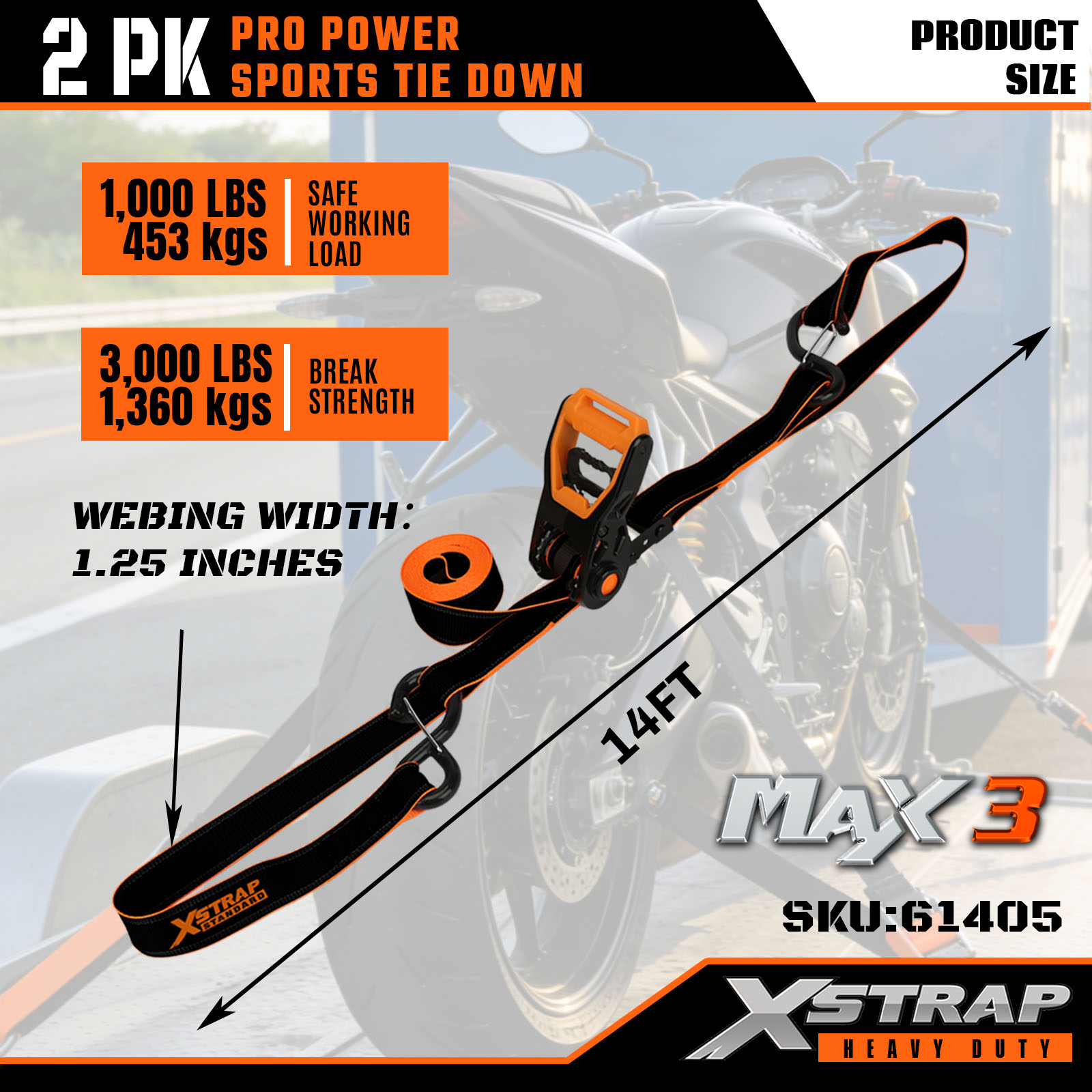Xstrap 2 Pack PRO Power Sports Tie-Down-remmar, 1-1/4” x 14″ Polyester Tie Down Strap Drag Spärrrem, 1000lbs Kapacitet Cargo Surrning Säkringsremmar med karbinhakar för lastbil, SUV, bil Top Racks motorcykel.