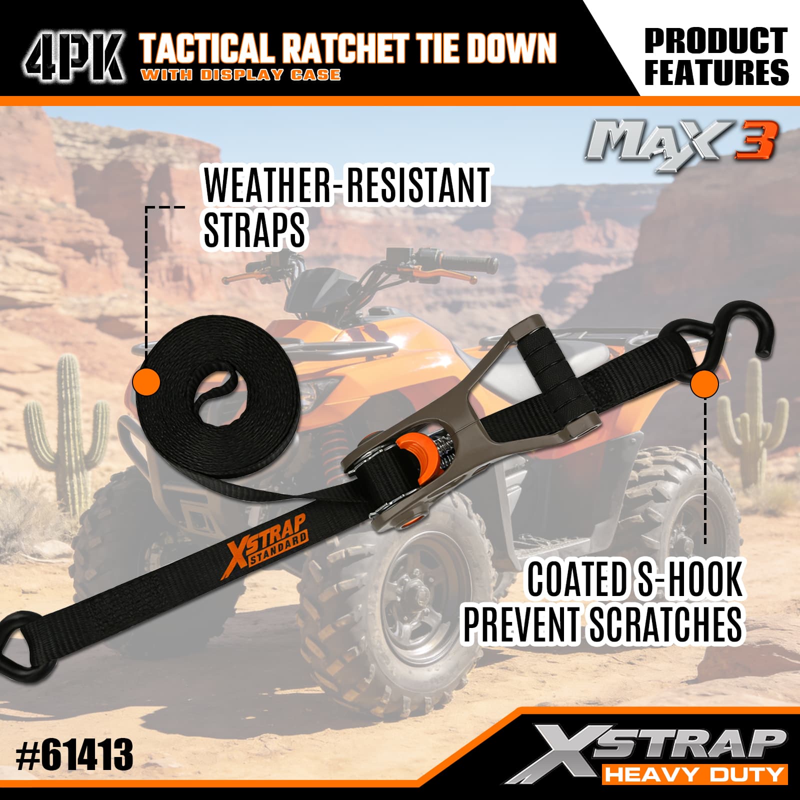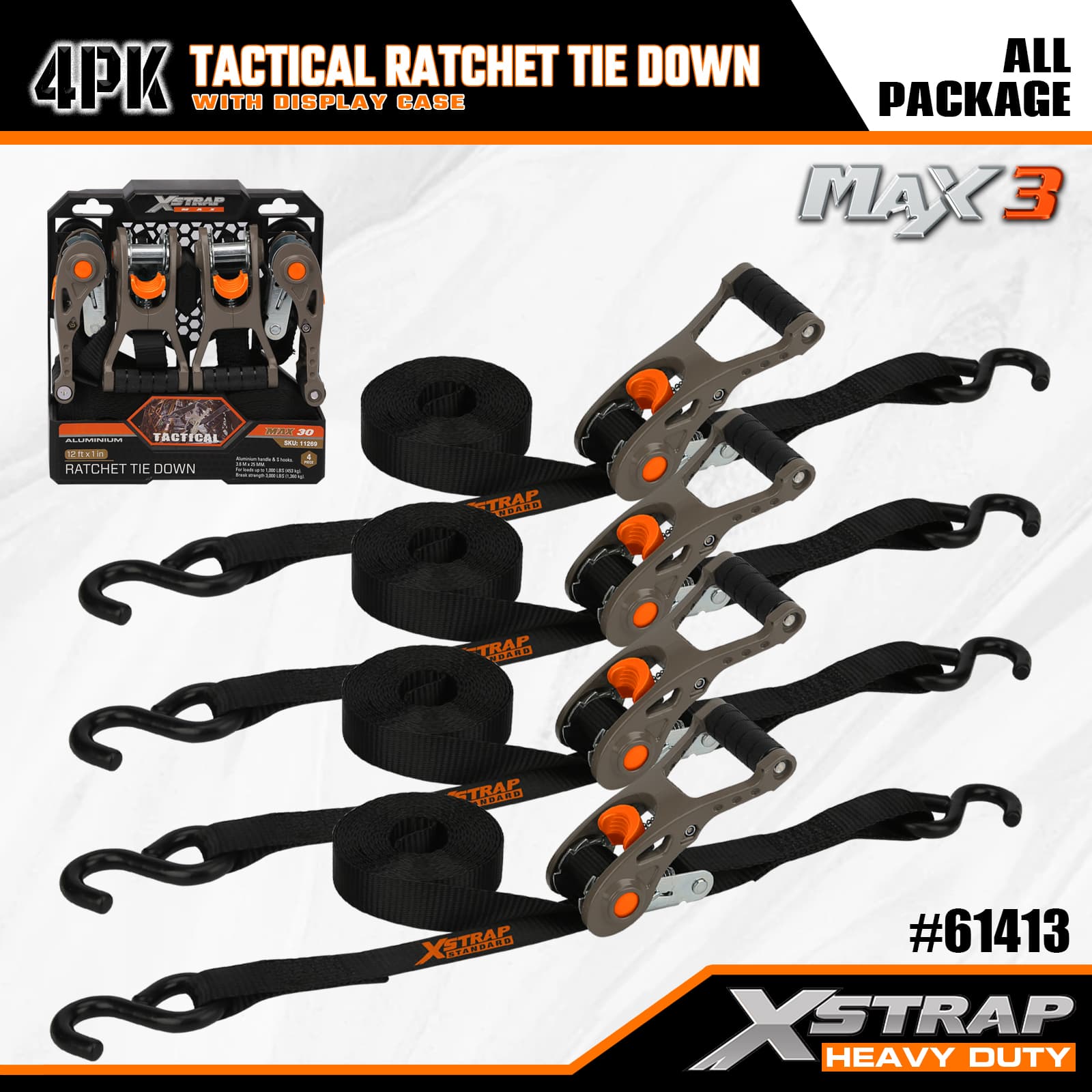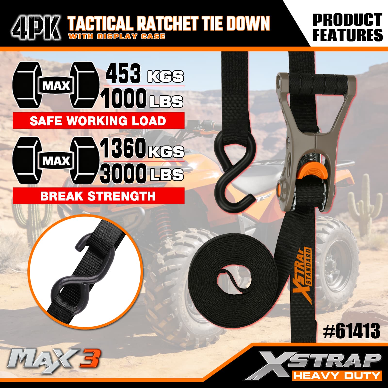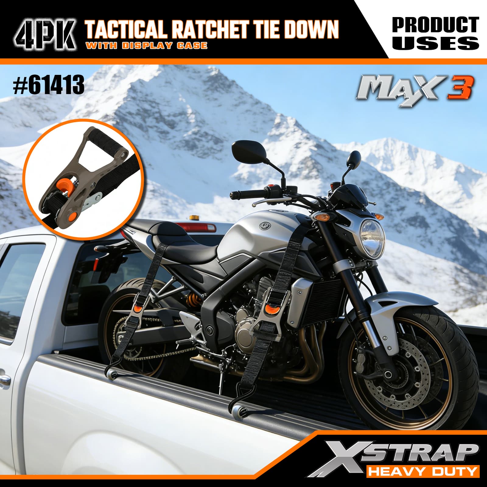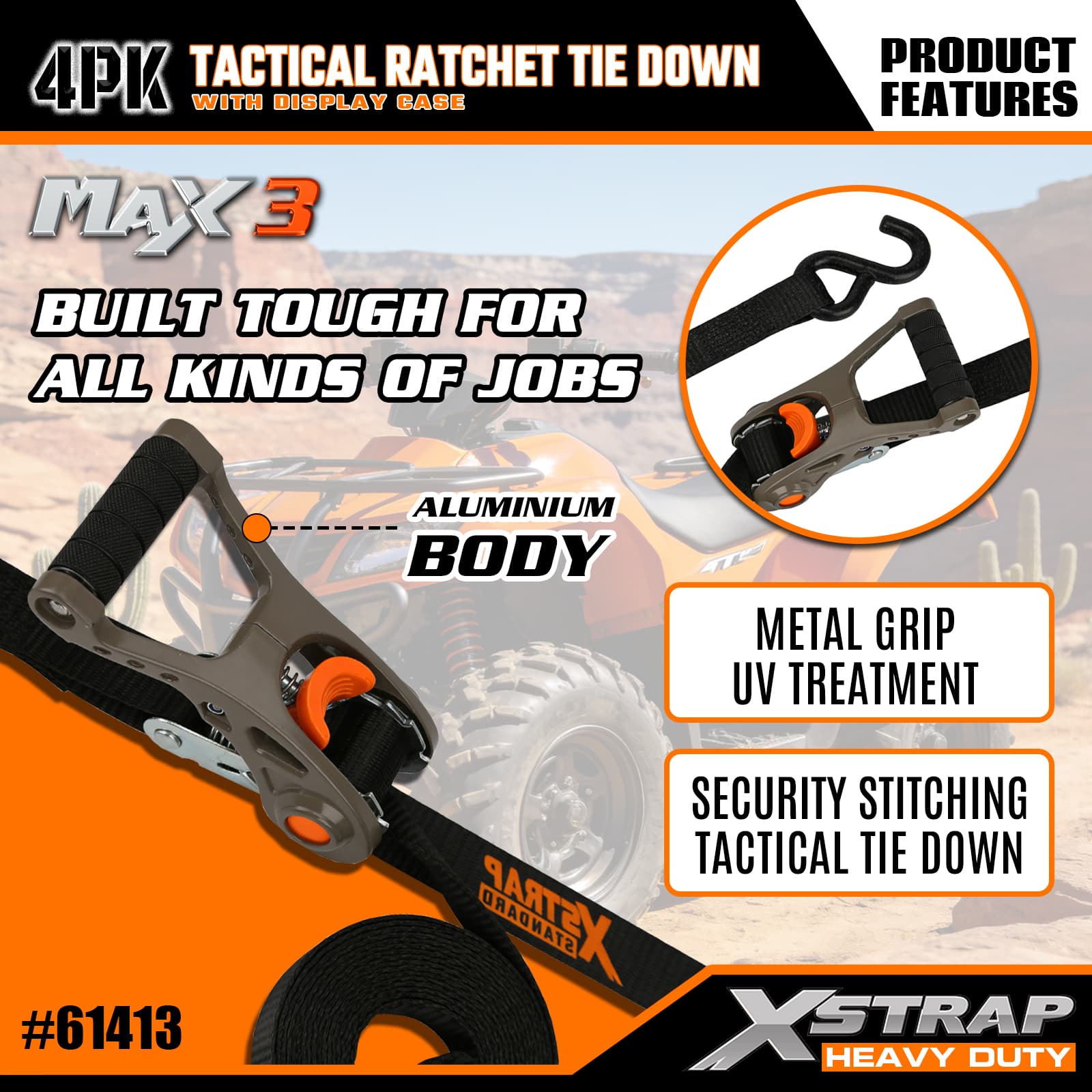 - Tactical Aluminium Ratchet Design: Har ett robust aluminiummetallgrepp för smidig, pålitlig spänning – intuitiv att använda, så att både tillfälliga och frekventa användare snabbt kan säkra lasten.