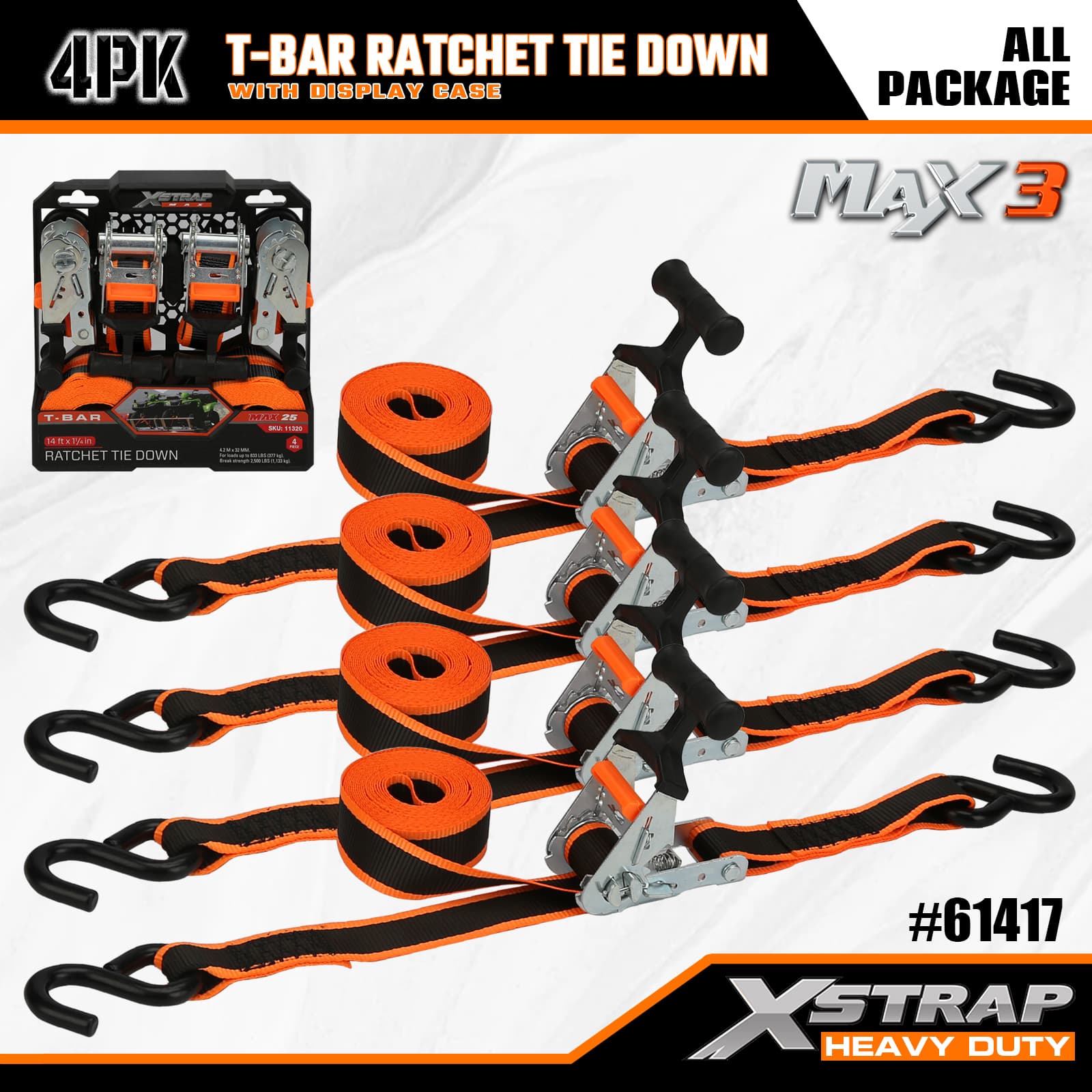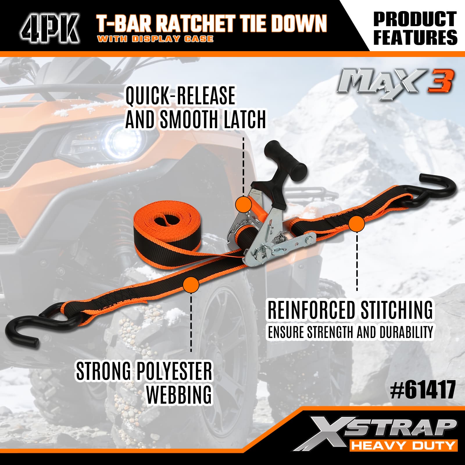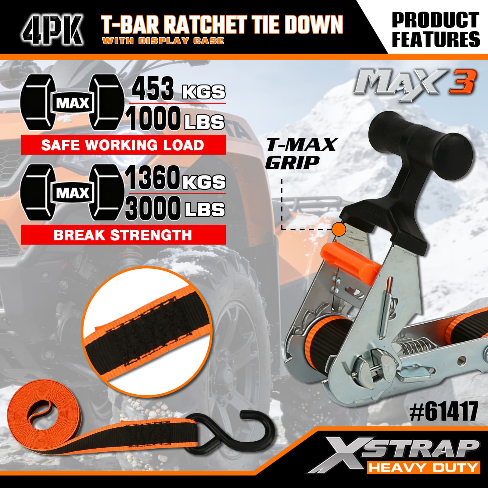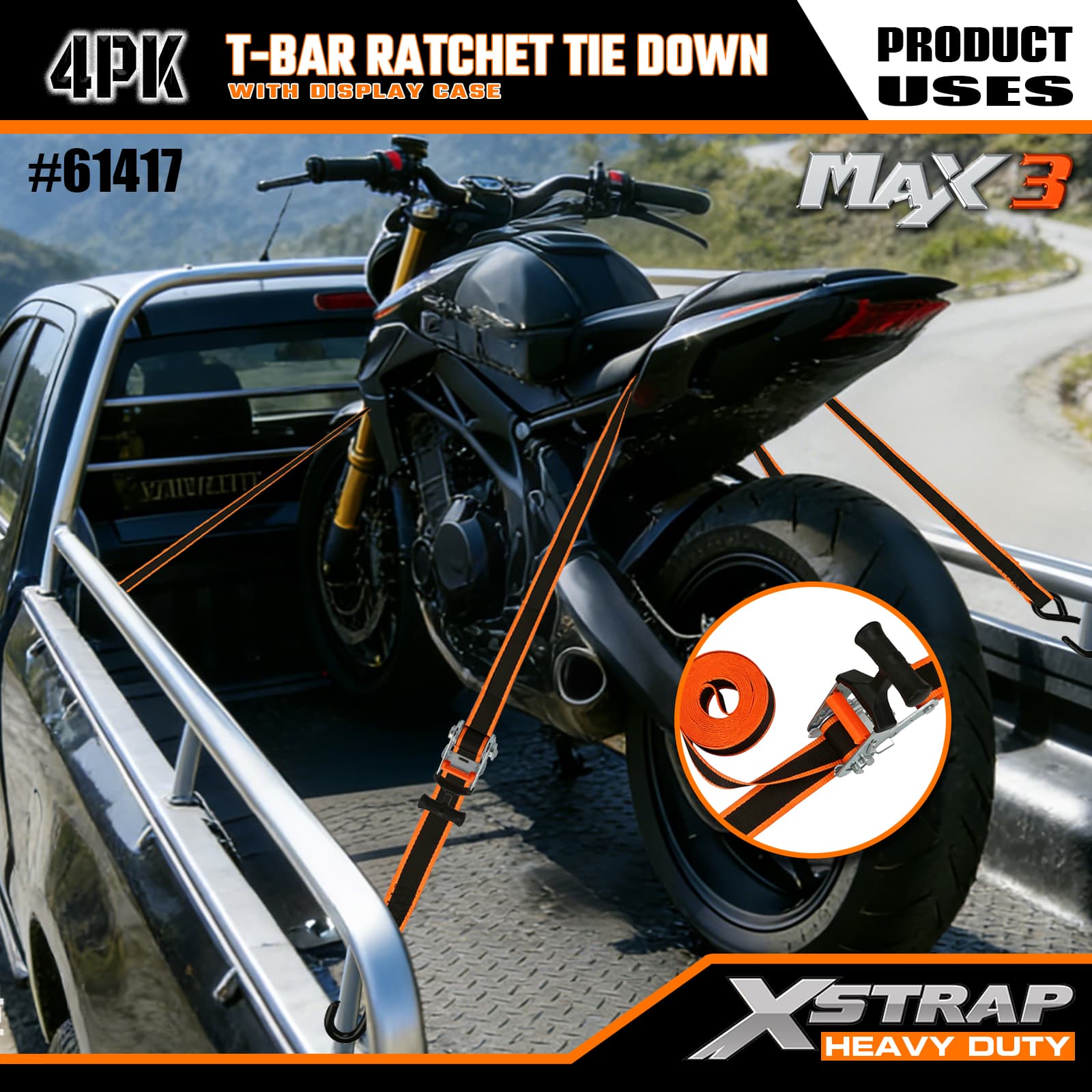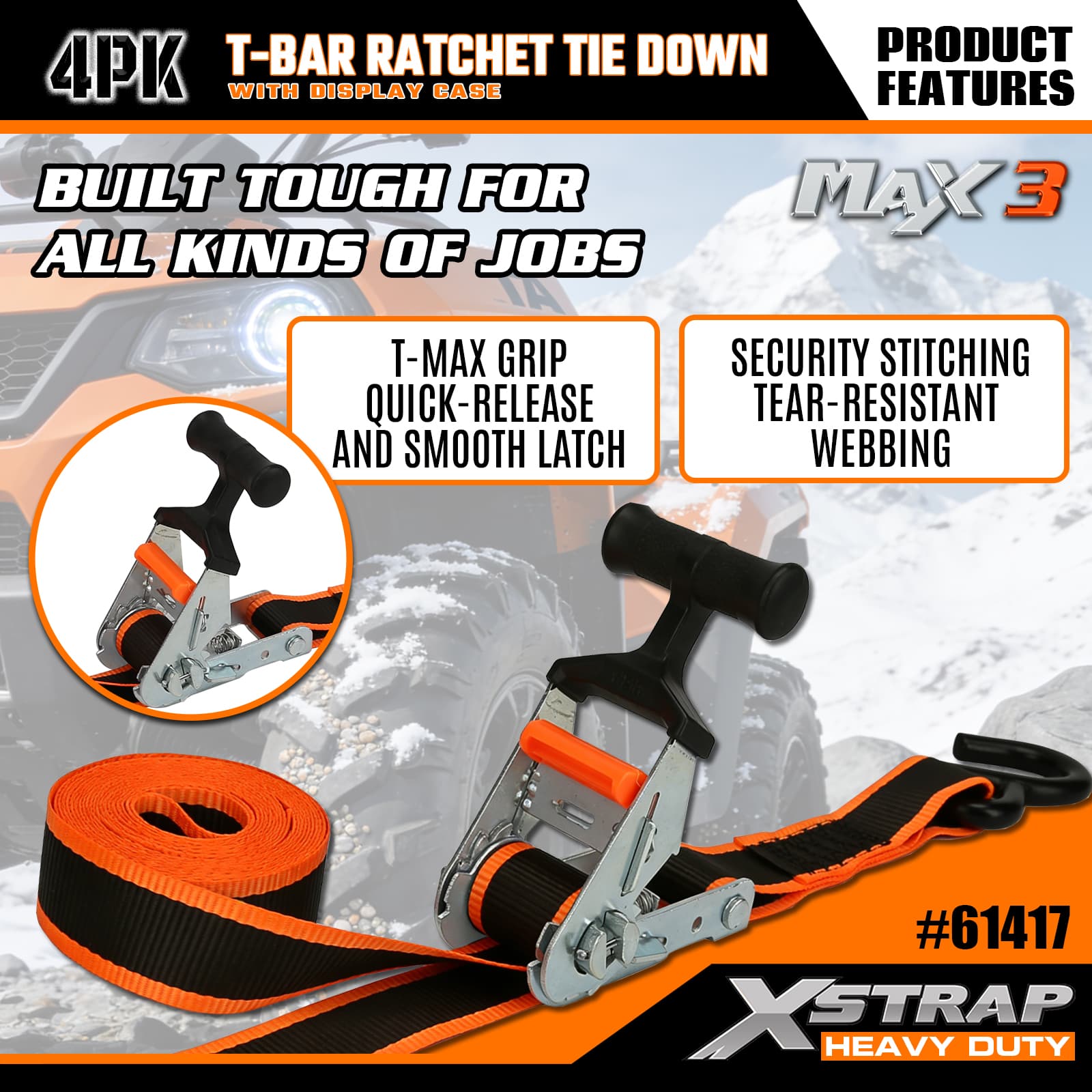 - Max Grip T-Bar Ratchet Mechanism: Har ett ergonomiskt T-stångshandtag som ger ökad hävstång för smidig, lättansträngd spänning – intuitiv att använda, så att användare på alla nivåer kan säkra last snabbt.