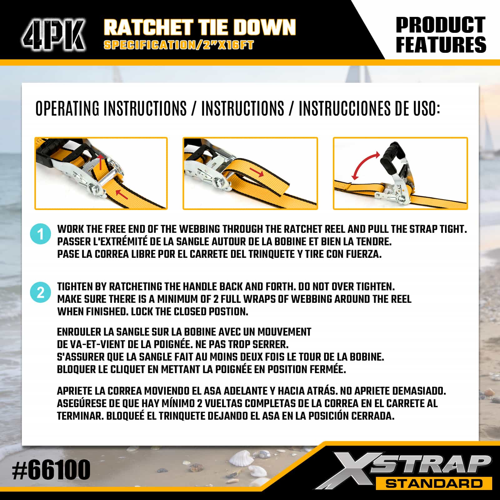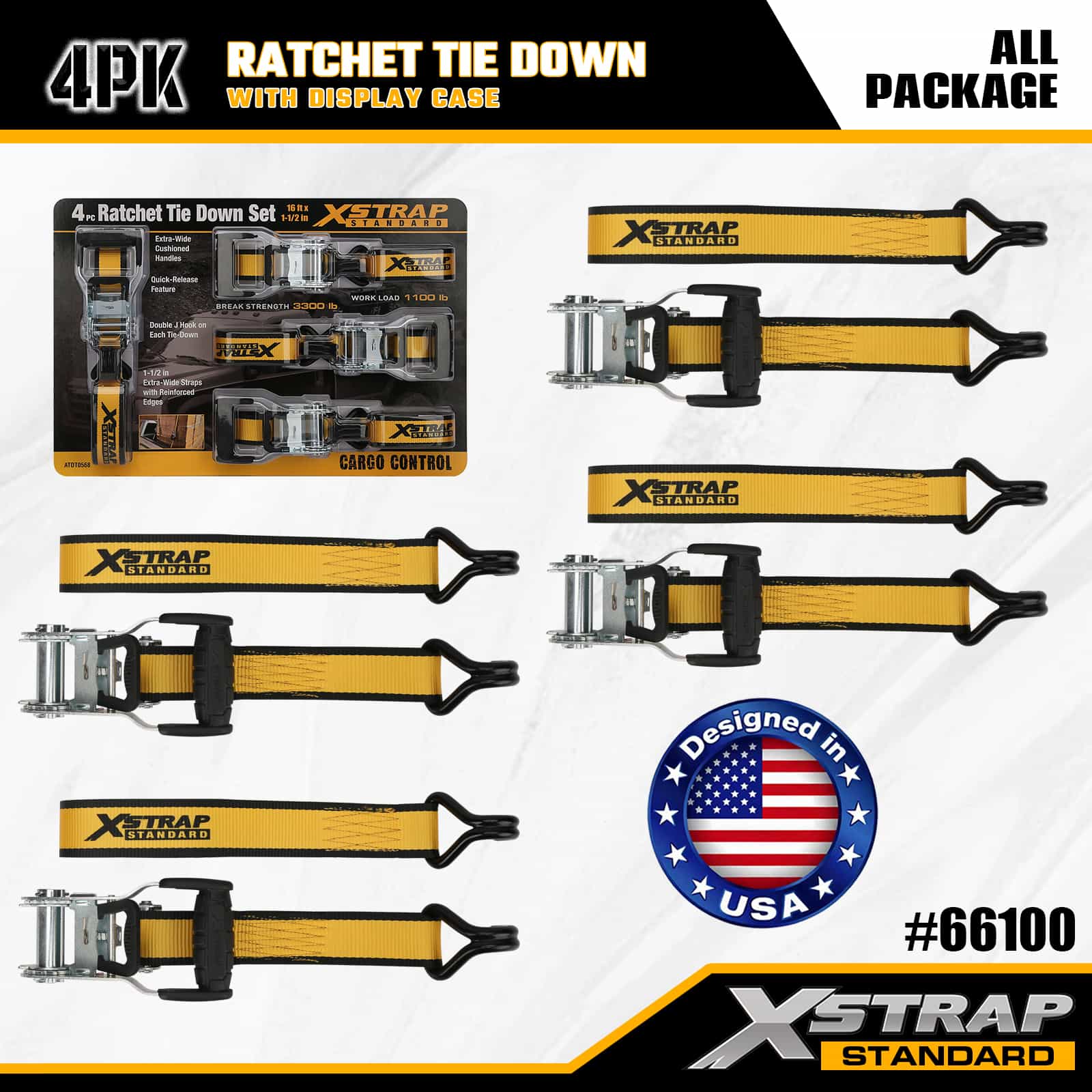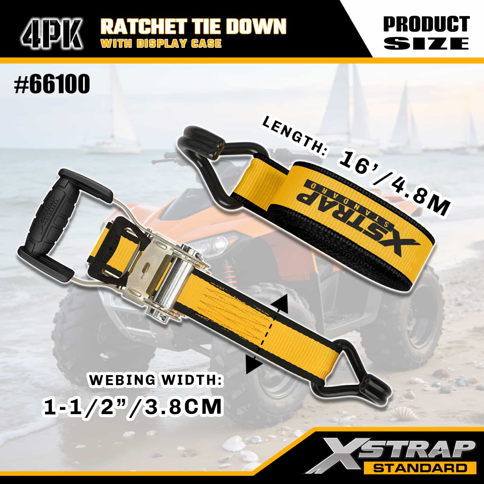 1-1/2" x 16" 4PK Ratchet Tie Down med Double J-krokar