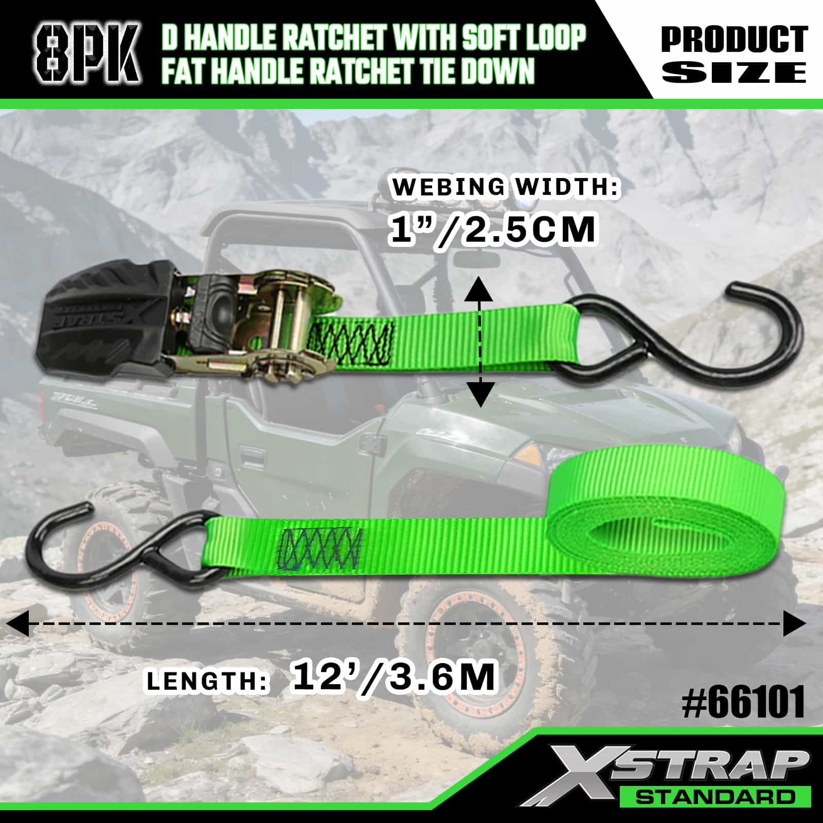 2PK 1” x 14’ D handtagsspärr med mjuk slinga och 6PK 1” x 12’ spärrhake med platt handtag