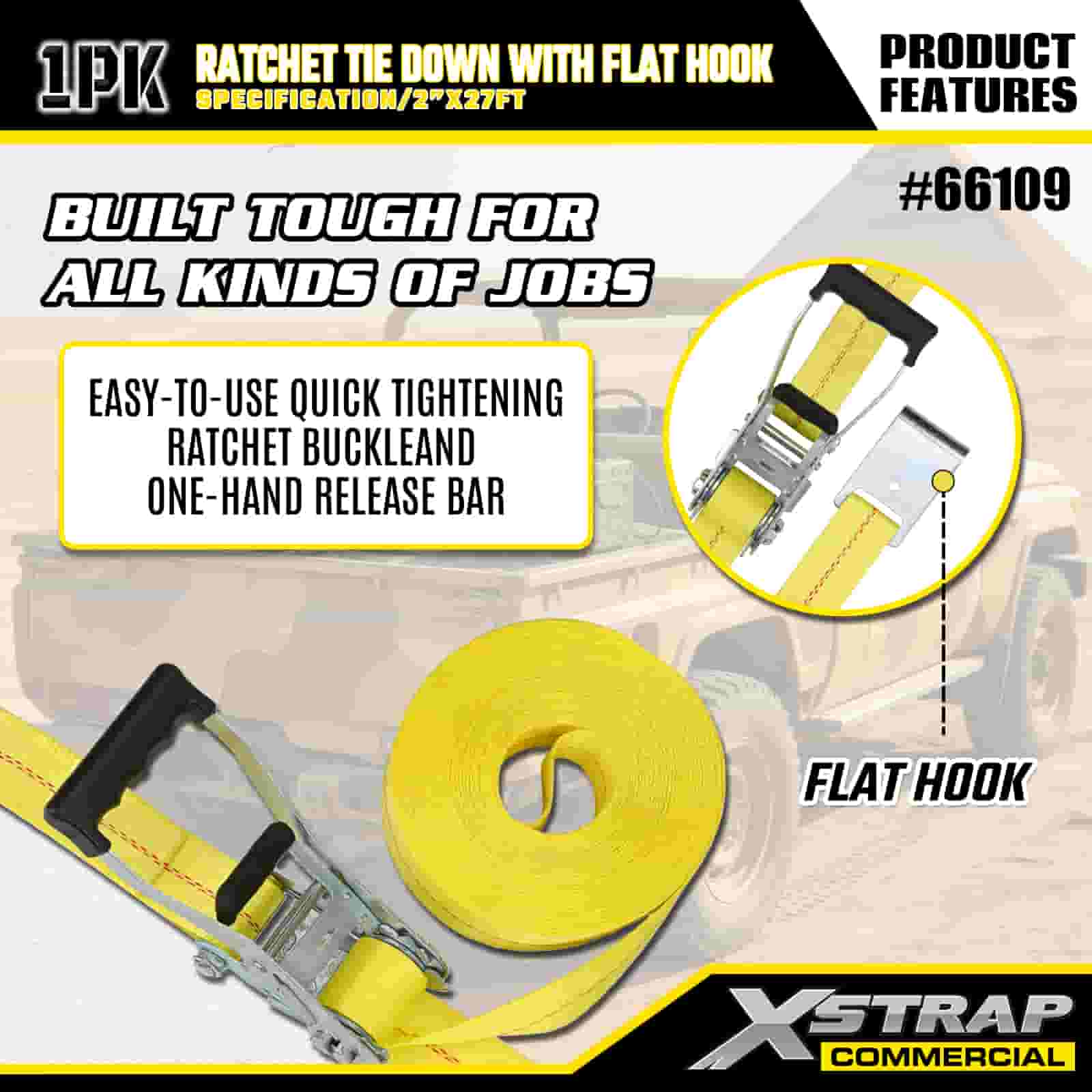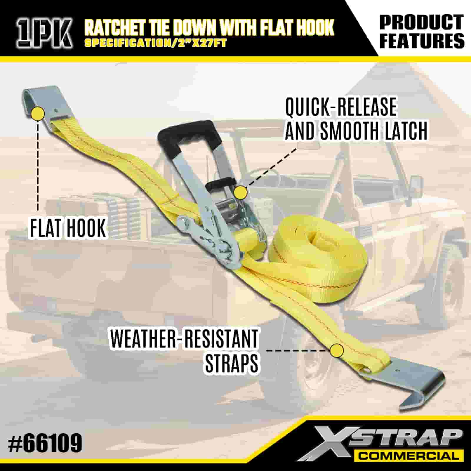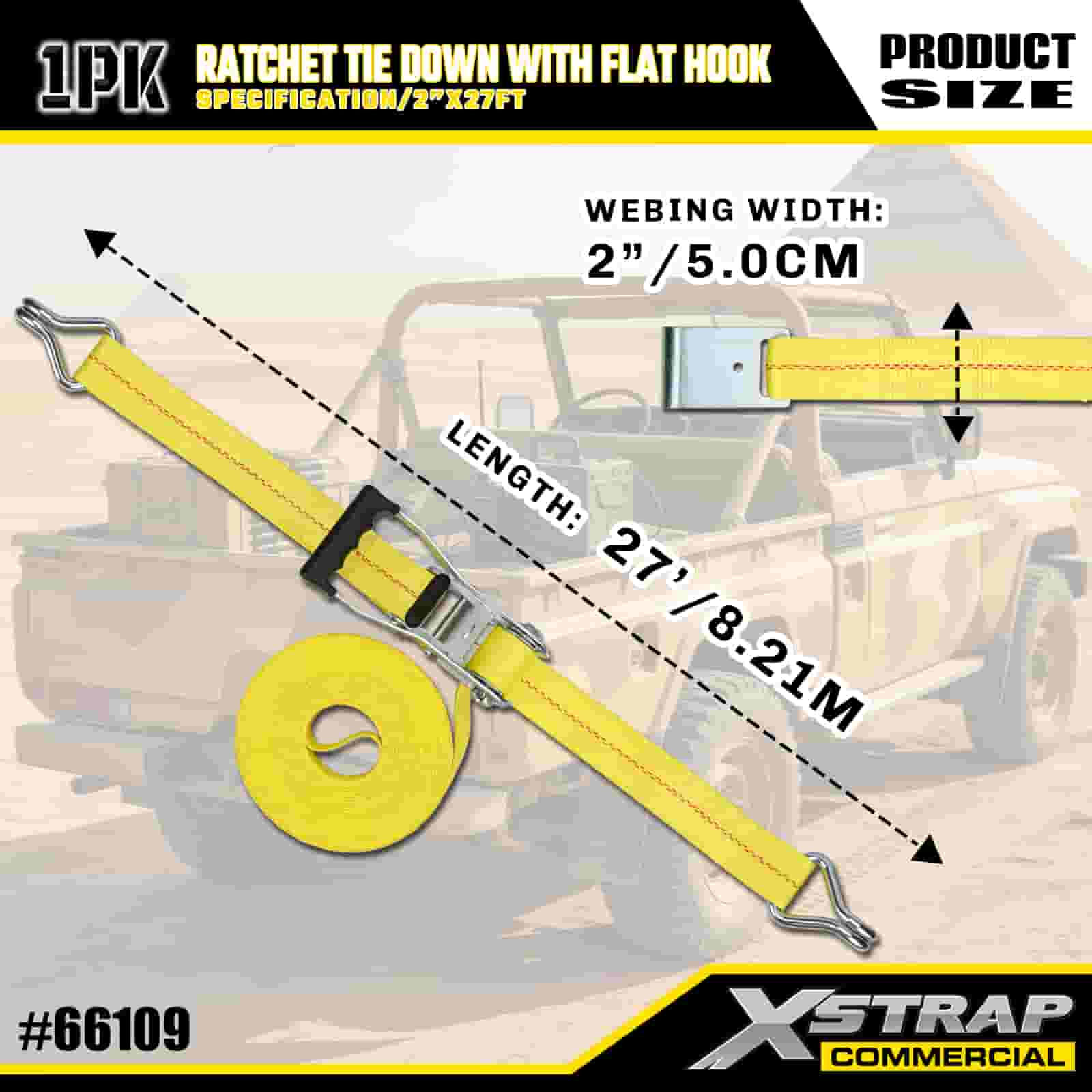 Xstrap Ratchet Tie Down med platta krokar, 2” x 27’ Polyester Tie Down Strap Drag Ratchet Strap, 3333lbs Kapacitet Cargo Surrning Säkringsremmar med platta krokar för lastkontroll Pickup, SUV, Car Top Racks Motorcykel,.