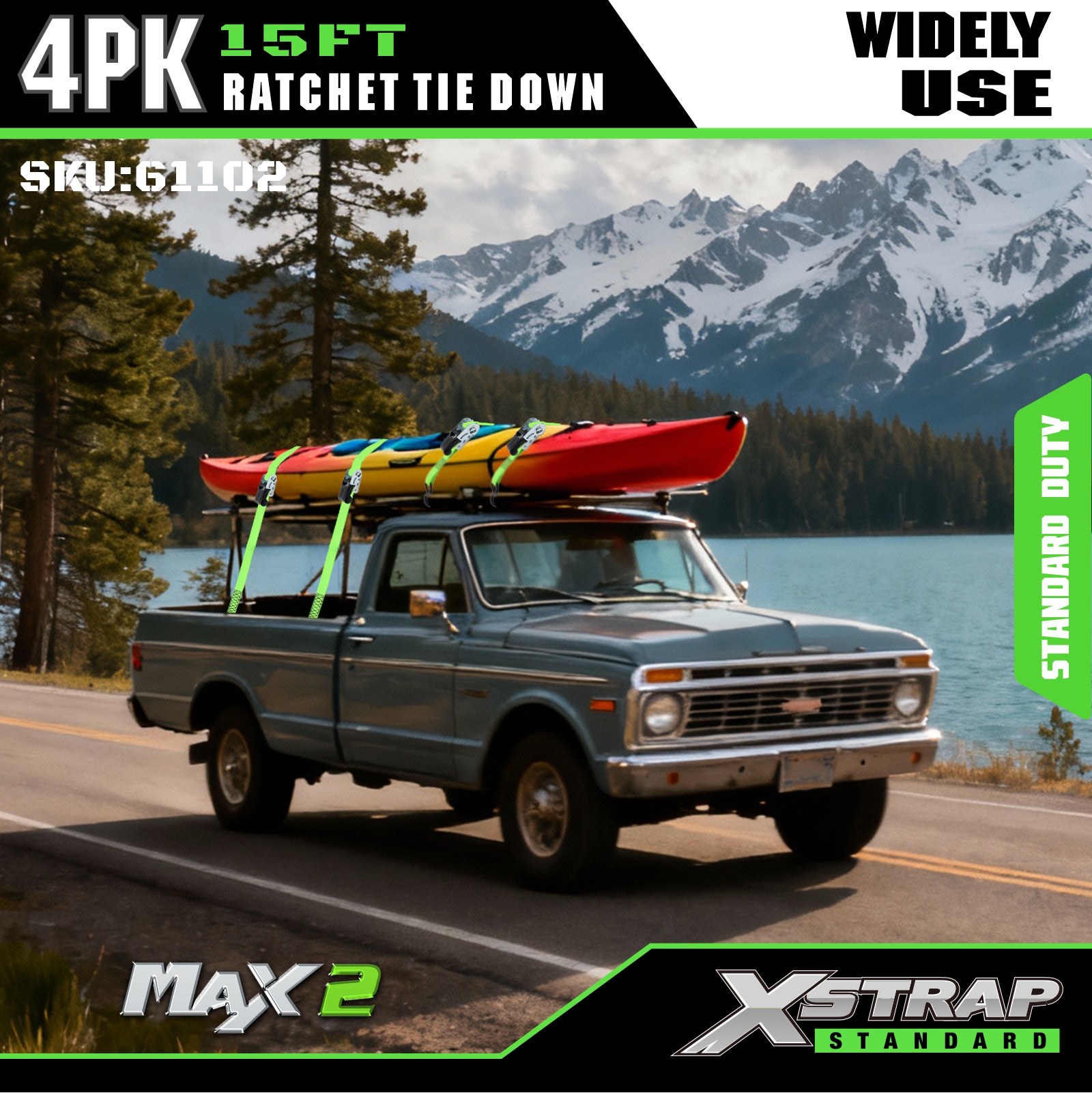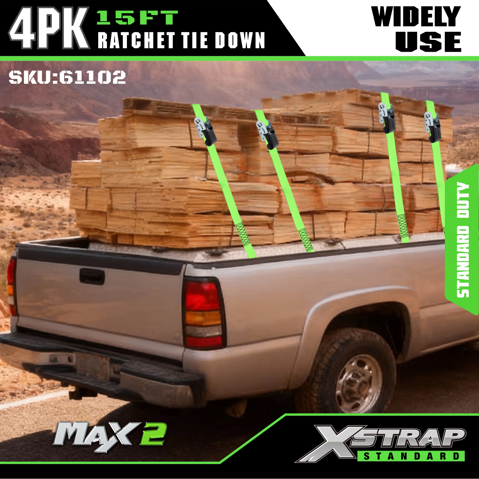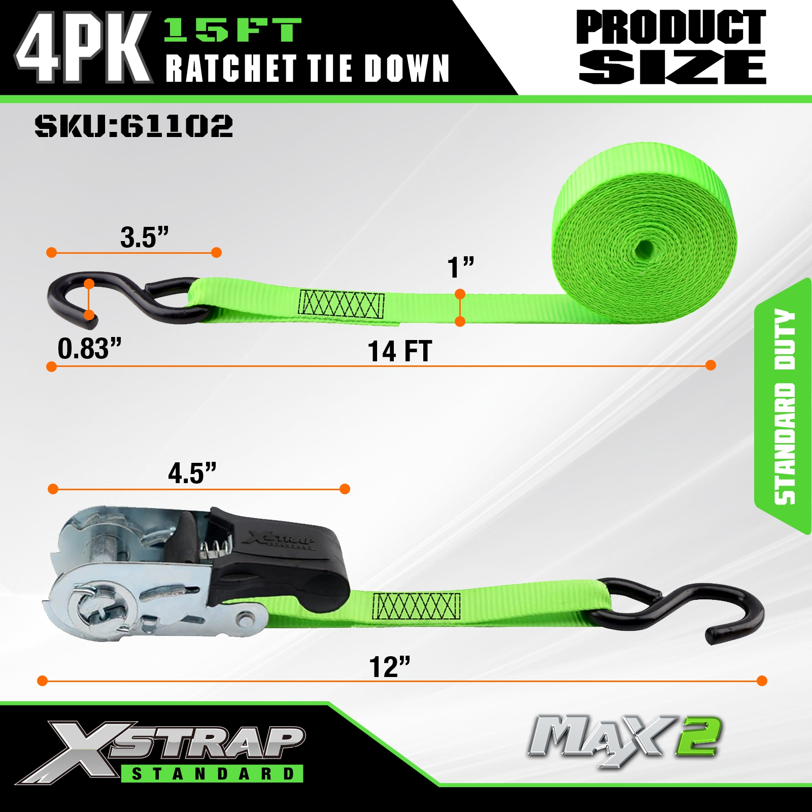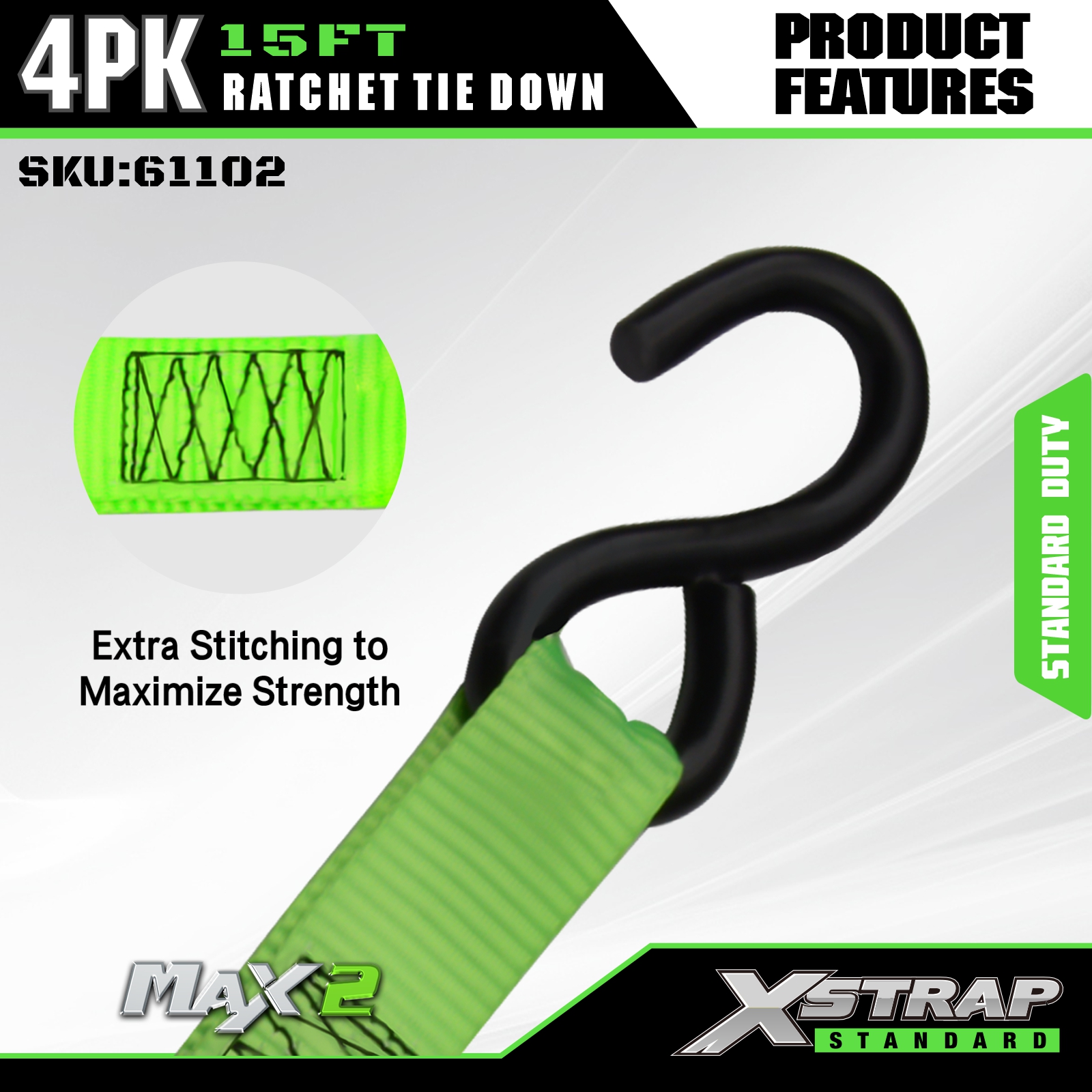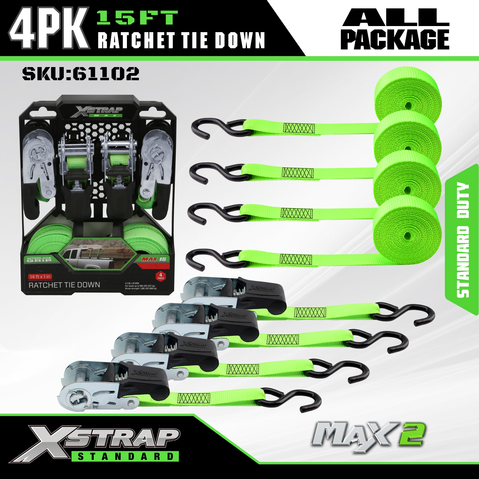 Xstrap Ratchet Tie Down Straps 4 PK 15Ft- 500 Lbs Lastkapacitet 1500 Lbs Brytstyrka-lastremmar för flyttbara apparater, gräsmattor, motorcykel.