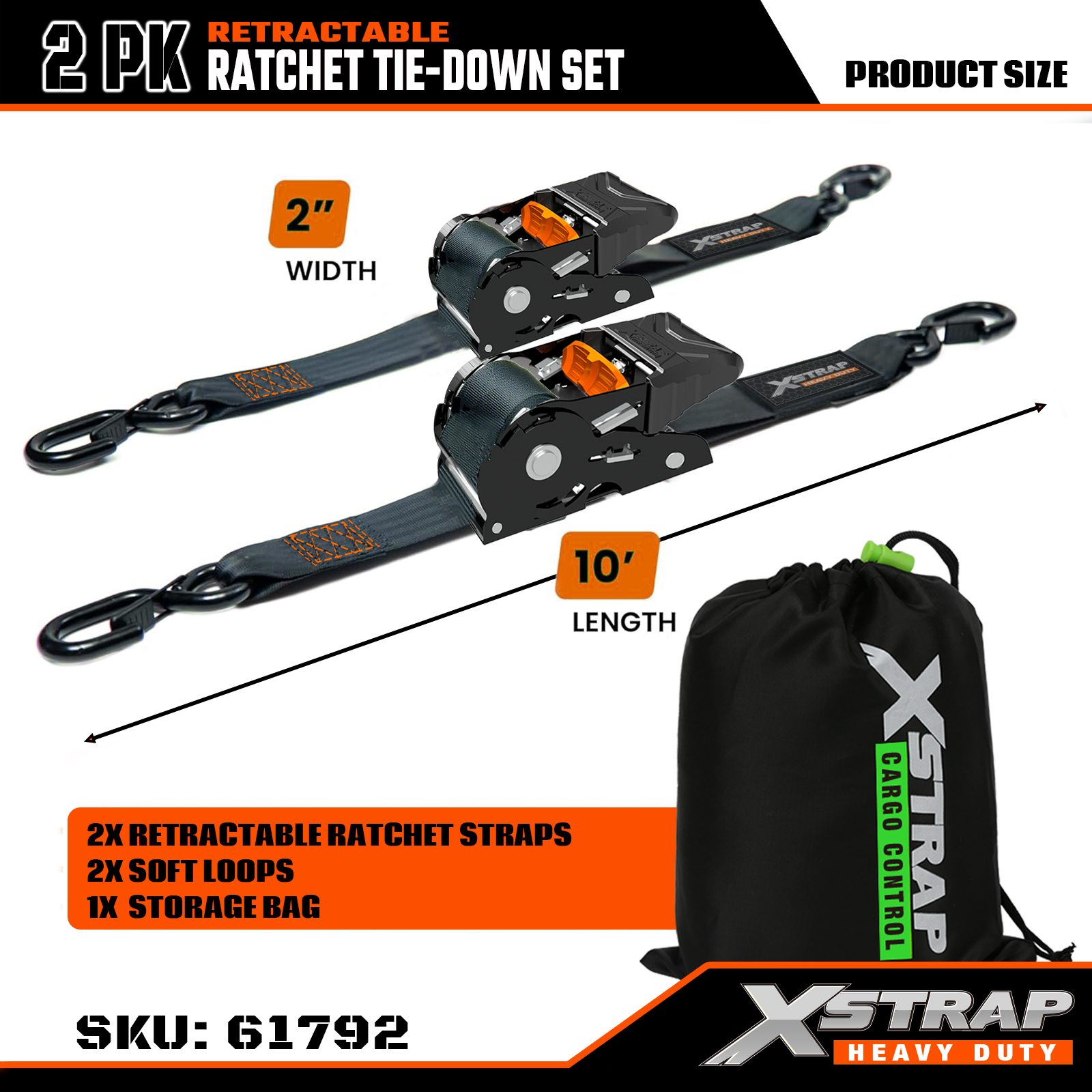 Xstrap 2PK Infällbar Ratcet Tie Down Set med Safety S-krokar, 2” x 10’ Polyester Tie Down Strap Spärrrem, 1011lbs Kapacitet Lastsurrning Säkringsremmar med Safety S-krokar för lastbil, lastvagn, motorcykel.